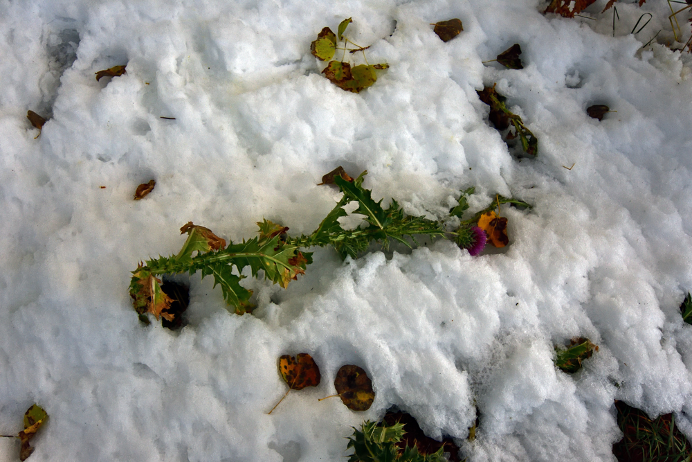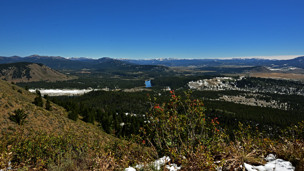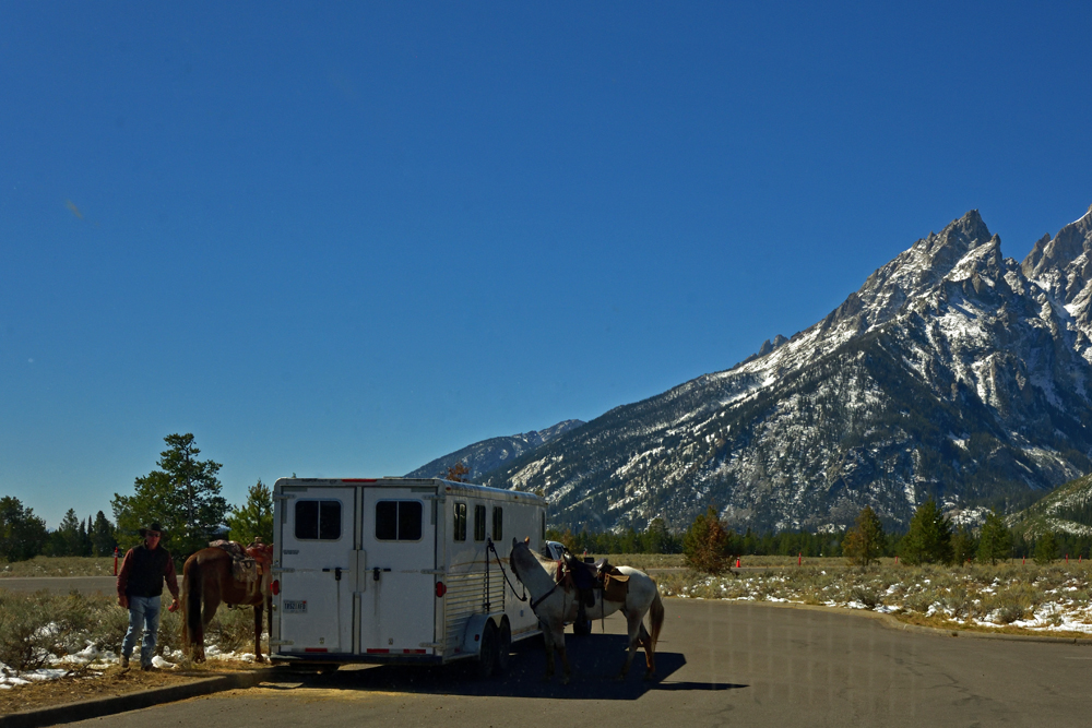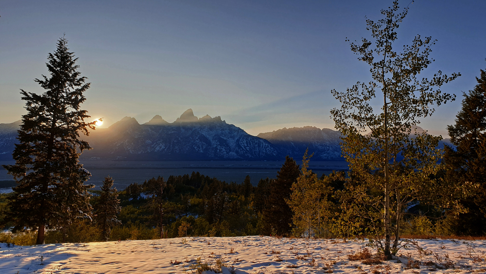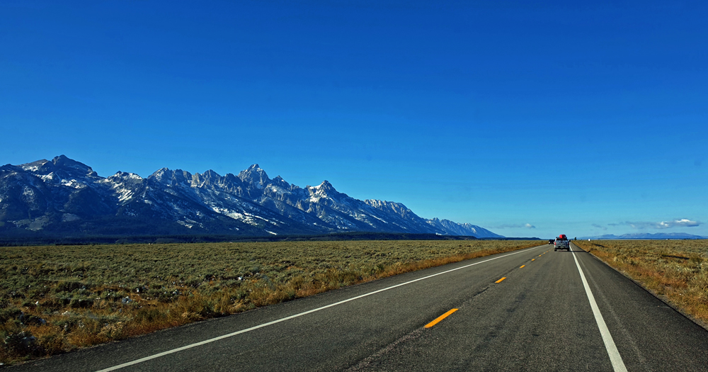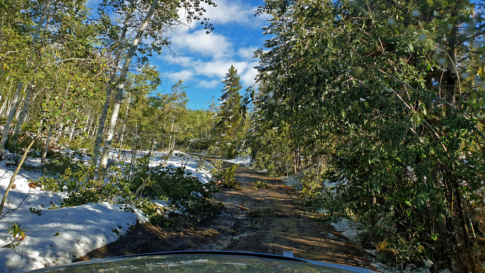 Am Labor Day selbst ist es kalt und regnet den ganzen Tag. Wie stark sich das auf die Region ausgewirkt hat, finden wir dann am nächsten Tag heraus… Wir folgen dem Lauf des Snake River stromaufwärts, wobei Ozy einen geteerten Ausstellplatz zum Anlass nimmt, mal noch die Vorder- und Hinterreifen auszuwechseln. In Jackson kaufen wir in einem sehr gut bestückten Smith’s ein und fahren dann Richtung Grand Teton Nationalpark. Die weissen Berge sind von unten ja sehr malerisch, aber als wir zum Shadow Mountain im Bridger-Teton National Forest hinauffahren, wo man – an designierten Stellen – frei campen darf, geraten wir selbst in den Schnee! Die Erdstrasse ist nur mit 4×4 zu bewältigen, da sehr matschig und mit Ästen übersäht (die aufgrund der zu hohen Schneelast geknickten Bäume waren zum Glück schon weggeräumt). Wir werden dafür mit einem grandiosen Blick auf die frisch verschneiten Tetons belohnt, die sich abrupt aus der Snake River-Ebene erheben. (Wir hätten bei Swan Valley fast die Strassenkombination ID-31 und ID-33/WY-22 über die Sawtooth Range nach Jackson genommen, aber ich glaube, es war rückblickend eine gute Entscheidung, das nicht zu tun…).