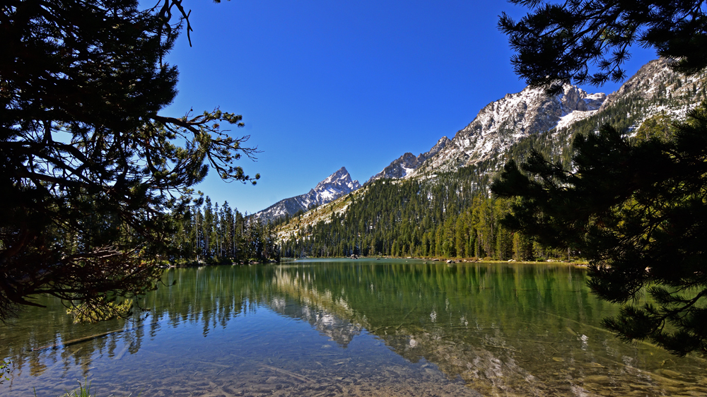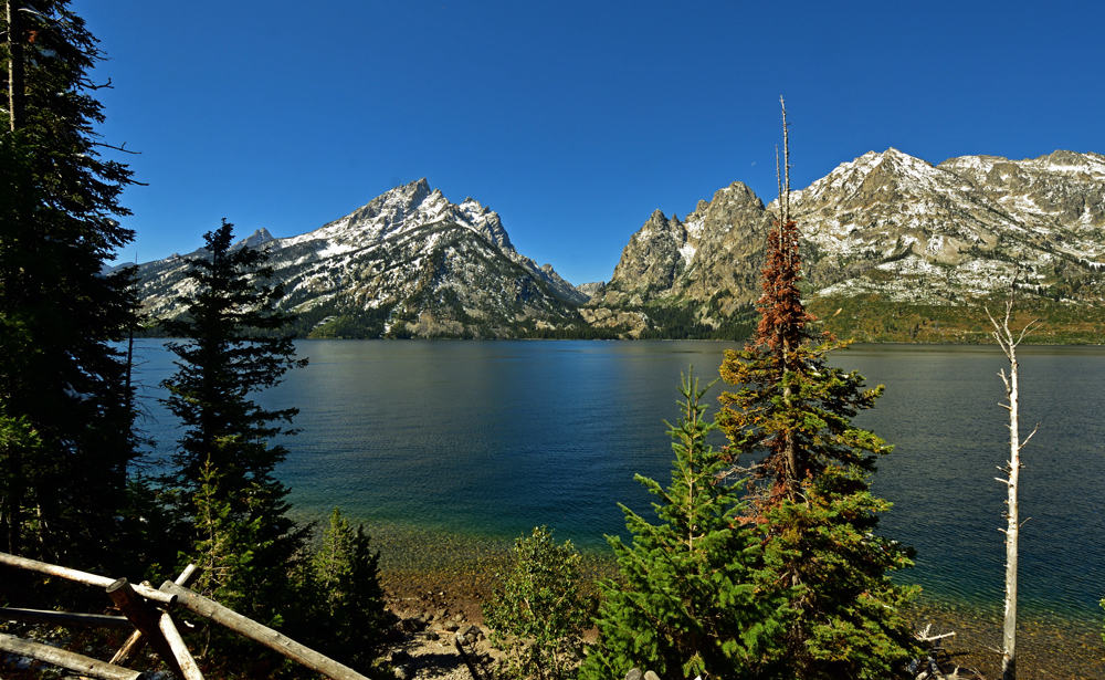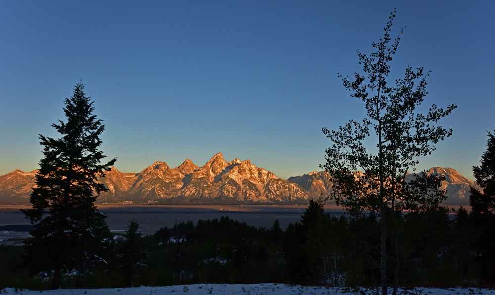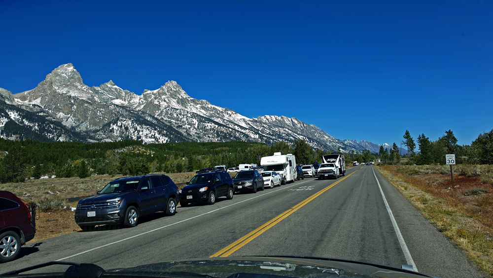 Am nächsten Morgen fahren wir den Grand Teton National Park erkunden – sofern das möglich ist. Der südwestliche Teil ist wegen Schnee gesperrt, das (immerhin) nur teilweise geöffnete Besucherzentrum ist wegen coronabedingter Zugangsbeschränkung nur durch langes Anstehen zu erreichen und viele Parkplätze sind sehr, sehr gut besucht. Wenn man es dann doch geschafft hat, einen zu ergattern, ist die Aussicht durch Bäume verstellt, die seit Einrichtung des Parks an den Aussichtspunkten gewachsen sind, und die wohl nie mehr gefällt werden… (etwas, das wir nicht nur in diesem Park festgestellt haben). Dies führt – wie zum Beispiel auf dem Signal Mountain – dazu, dass die Menschen verzweifelt eigene Pfade trampeln, um zu einem Ort zu kommen, wo man wenigstens ein bisschen Aussicht hat.