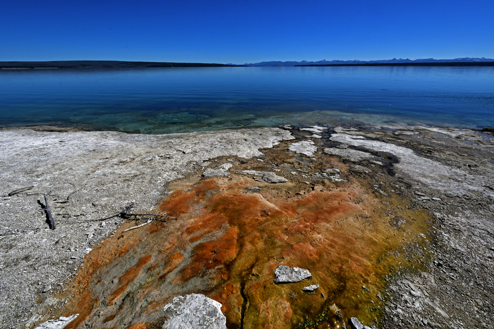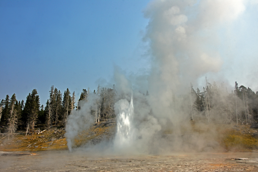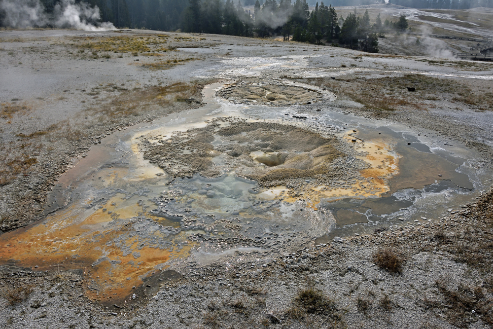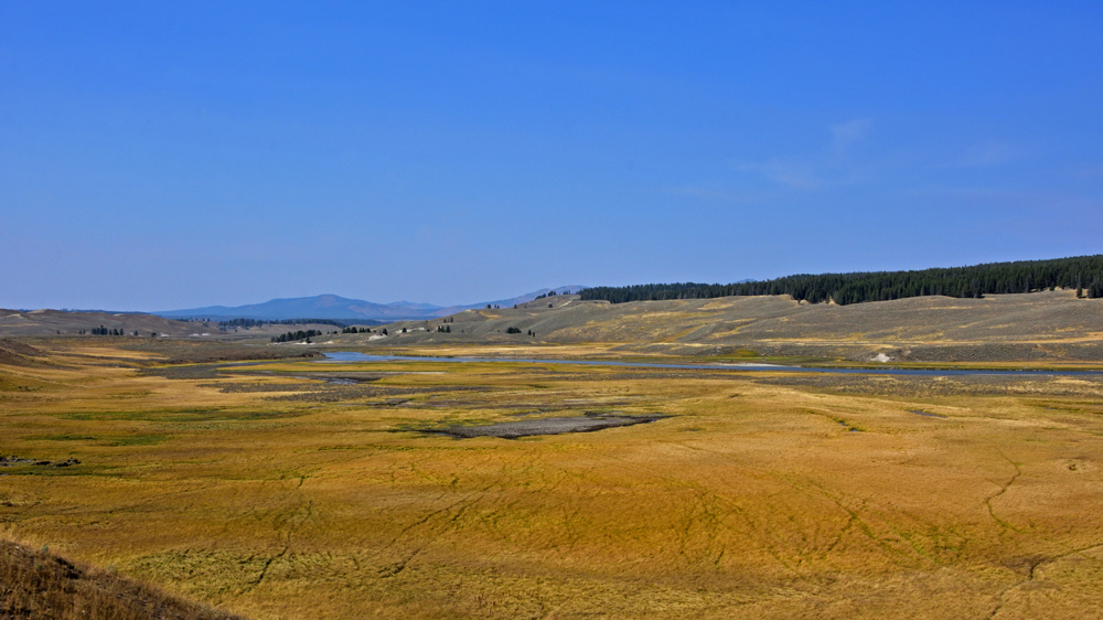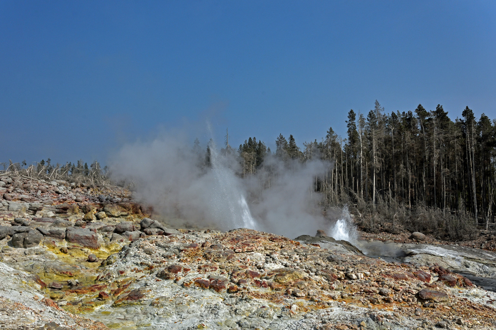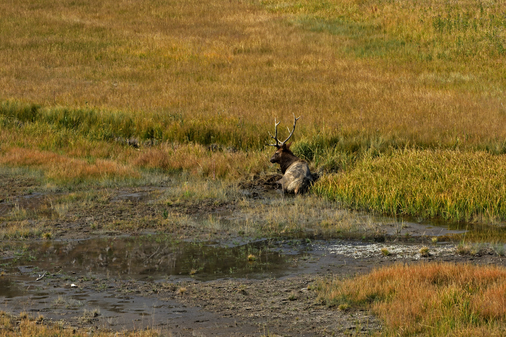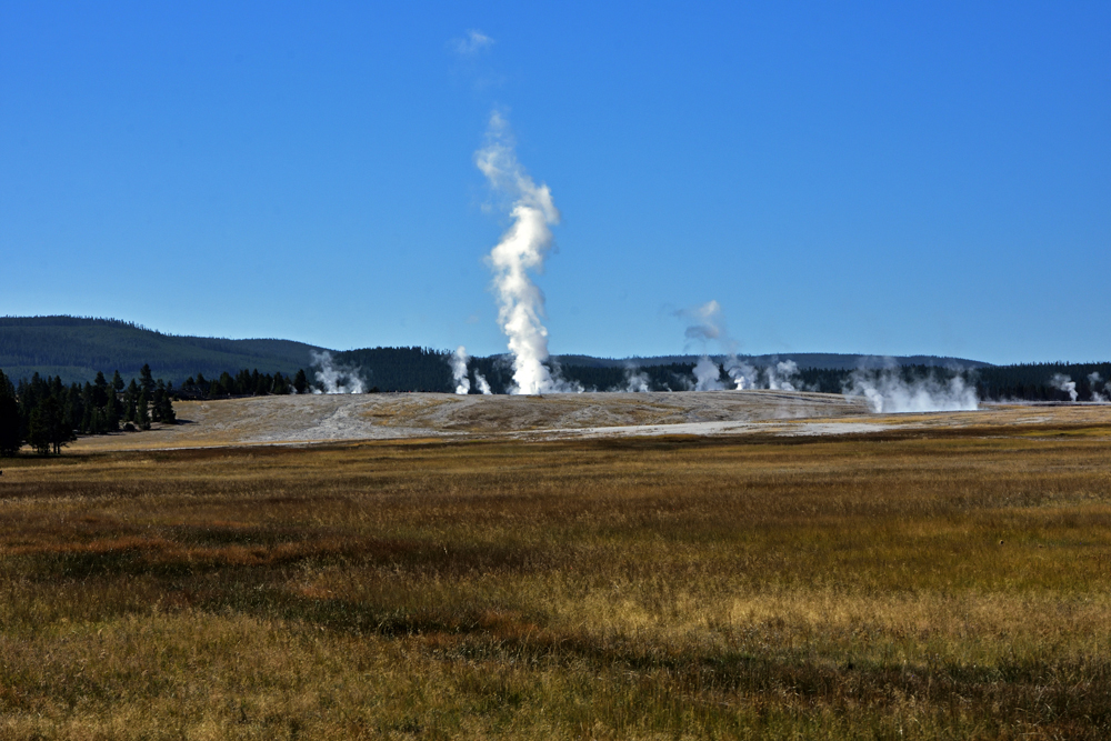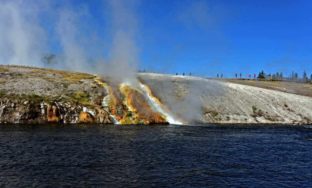 Was macht diesen Ort eigentlich so speziell? Ist es die Tatsache, dass er der erste Nationalpark der USA ist? Die abwechslungsreiche Landschaft mit grossen und kleinen Flüssen und Bächen, die in weiten Ebenen fröhlich herummäandern, durch Canyons rauschen oder sich über Katarakte und Wasserfälle ergiessen? Der grösste Bergsee Nordamerikas auf über 2000 m Höhe und zahlreiche kleinere Seen? Die vielfältige Tierwelt, die von Raupen über Schlangen, zahlreiche Raub- und Wasservögel bis zu Bison- und Elkherden, Bären und Wölfen reicht (nur letztere haben wir leider nicht gesehen)? Oder die enorme Dichte von vulkanogenen Sehenswürdigkeiten wie Geysiren, leuchtend blauen, von farbigen Bakterienmatten eingefassten heissen Quellen, blubbernden Schlammtöpfen und zischenden Fumarolen? (Leider sind die Fotos ohne Geruch…).