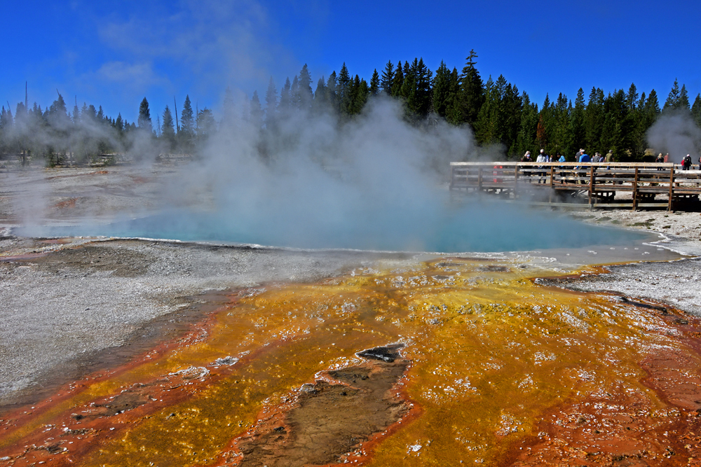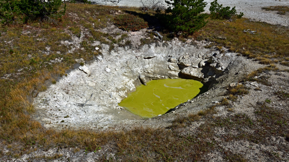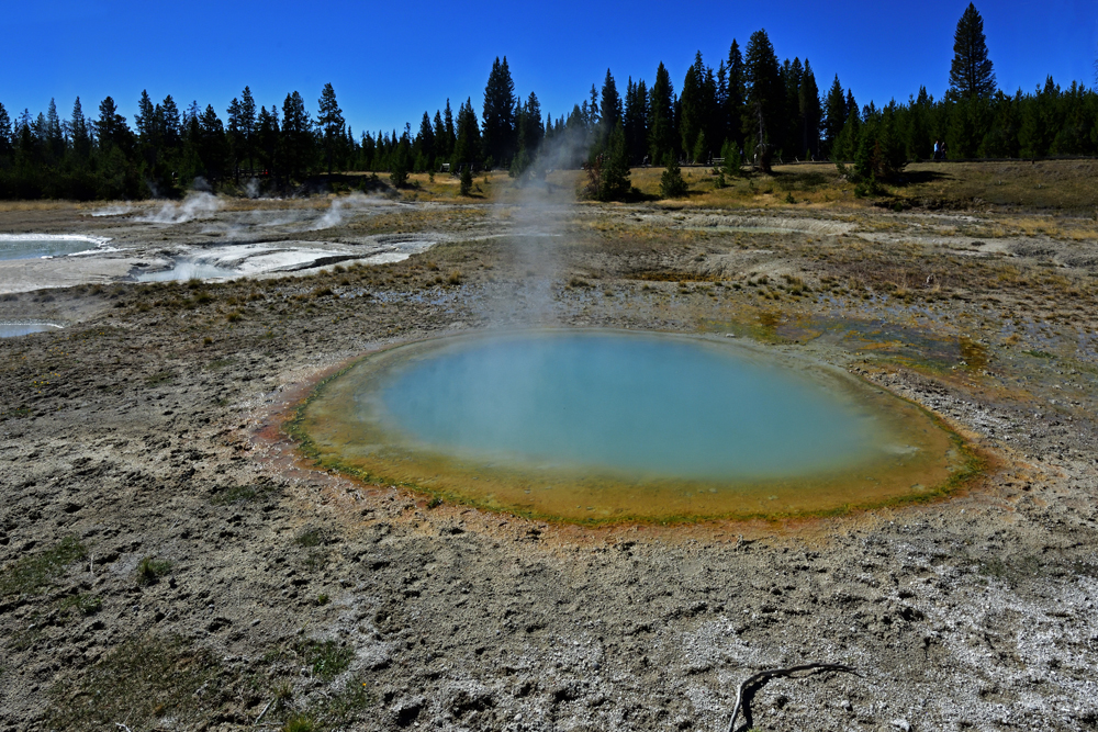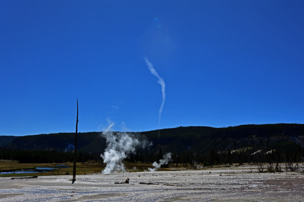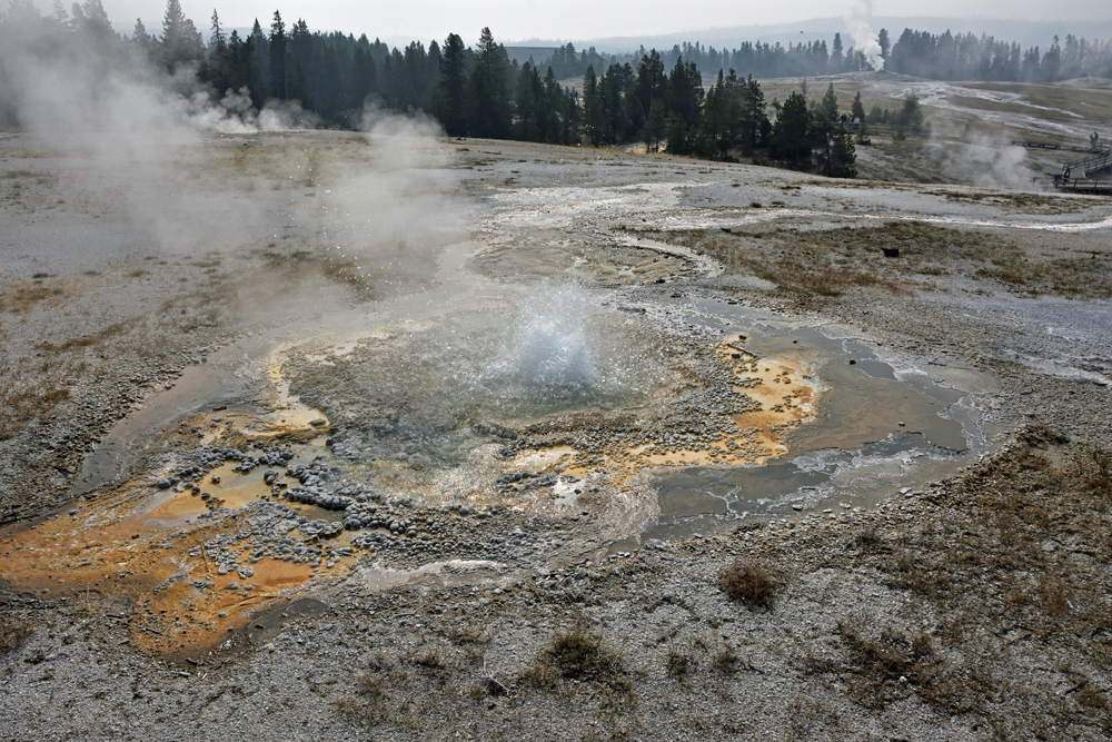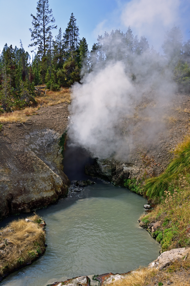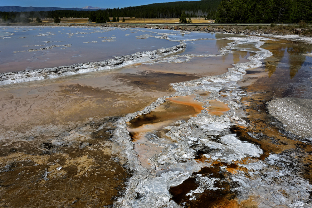 Was macht diesen Ort eigentlich so speziell? Ist es die Tatsache, dass er der erste Nationalpark der USA ist? Die abwechslungsreiche Landschaft mit grossen und kleinen Flüssen und Bächen, die in weiten Ebenen fröhlich herummäandern, durch Canyons rauschen oder sich über Katarakte und Wasserfälle ergiessen? Der grösste Bergsee Nordamerikas auf über 2000 m Höhe und zahlreiche kleinere Seen? Die vielfältige Tierwelt, die von Raupen über Schlangen, zahlreiche Raub- und Wasservögel bis zu Bison- und Elkherden, Bären und Wölfen reicht (nur letztere haben wir leider nicht gesehen)? Oder die enorme Dichte von vulkanogenen Sehenswürdigkeiten wie Geysiren, leuchtend blauen, von farbigen Bakterienmatten eingefassten heissen Quellen, blubbernden Schlammtöpfen und zischenden Fumarolen? (Leider sind die Fotos ohne Geruch…).