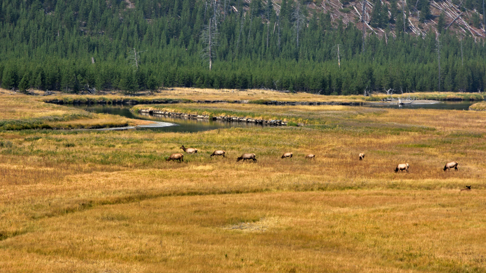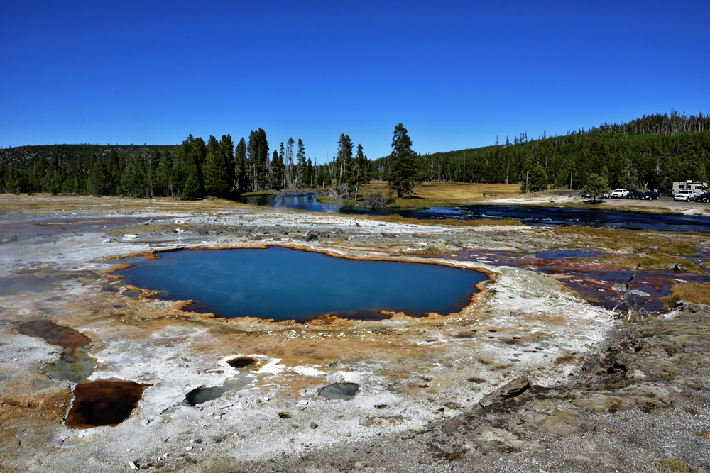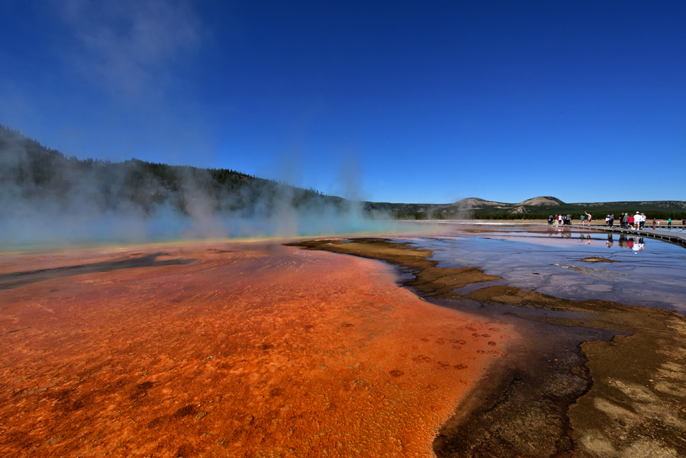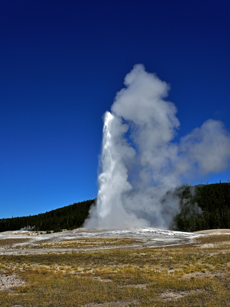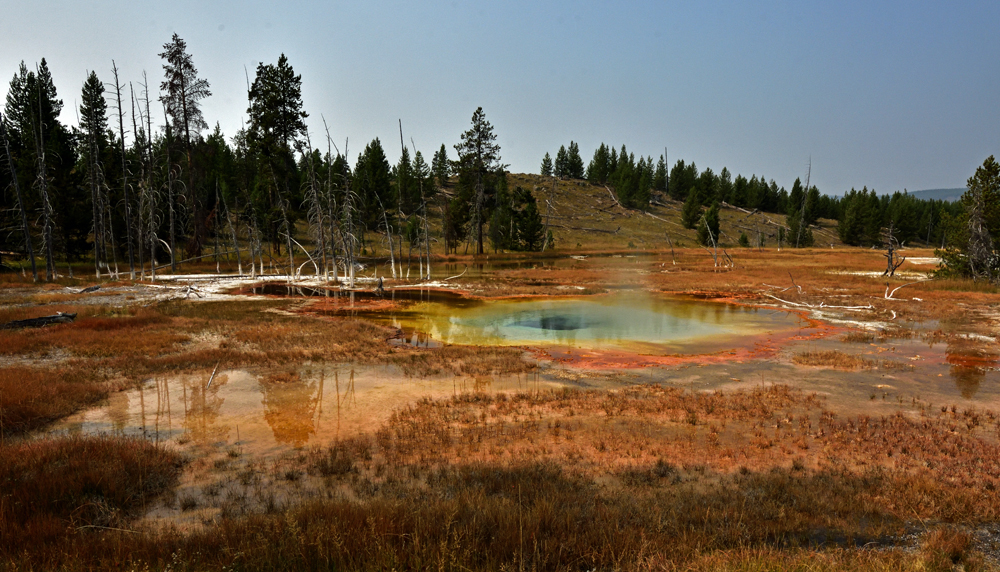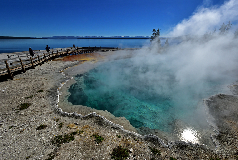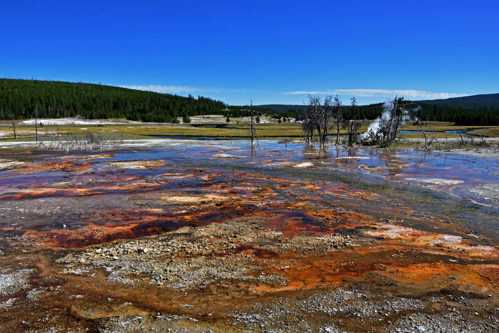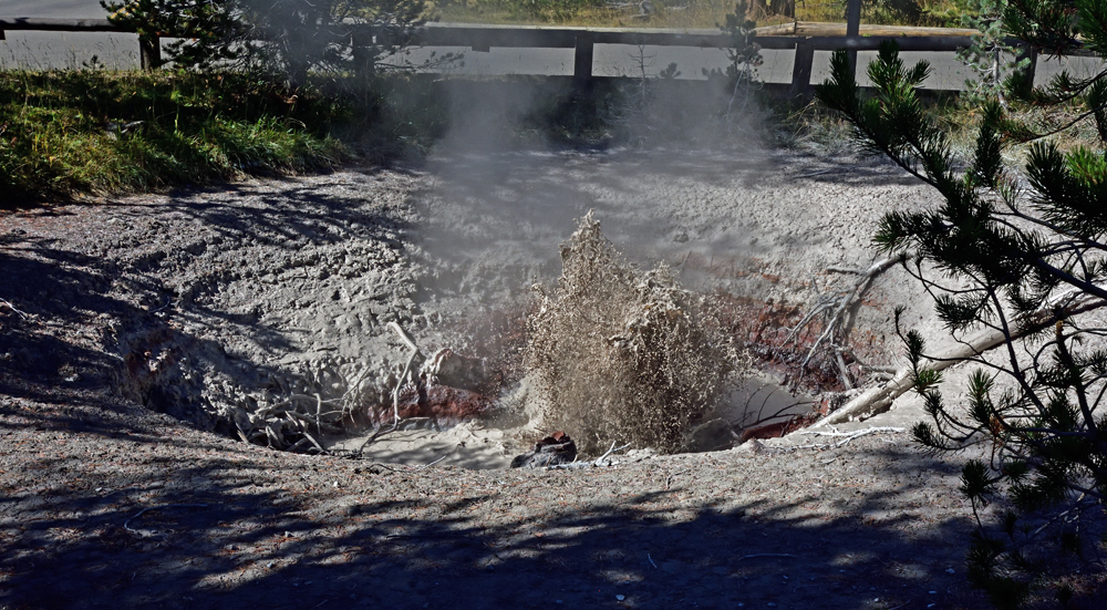 Was macht diesen Ort eigentlich so speziell? Ist es die Tatsache, dass er der erste Nationalpark der USA ist? Die abwechslungsreiche Landschaft mit grossen und kleinen Flüssen und Bächen, die in weiten Ebenen fröhlich herummäandern, durch Canyons rauschen oder sich über Katarakte und Wasserfälle ergiessen? Der grösste Bergsee Nordamerikas auf über 2000 m Höhe und zahlreiche kleinere Seen? Die vielfältige Tierwelt, die von Raupen über Schlangen, zahlreiche Raub- und Wasservögel bis zu Bison- und Elkherden, Bären und Wölfen reicht (nur letztere haben wir leider nicht gesehen)? Oder die enorme Dichte von vulkanogenen Sehenswürdigkeiten wie Geysiren, leuchtend blauen, von farbigen Bakterienmatten eingefassten heissen Quellen, blubbernden Schlammtöpfen und zischenden Fumarolen? (Leider sind die Fotos ohne Geruch…).