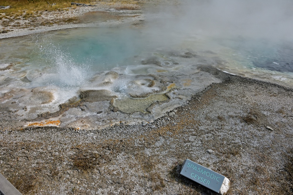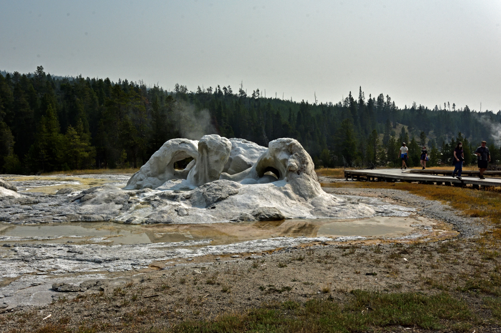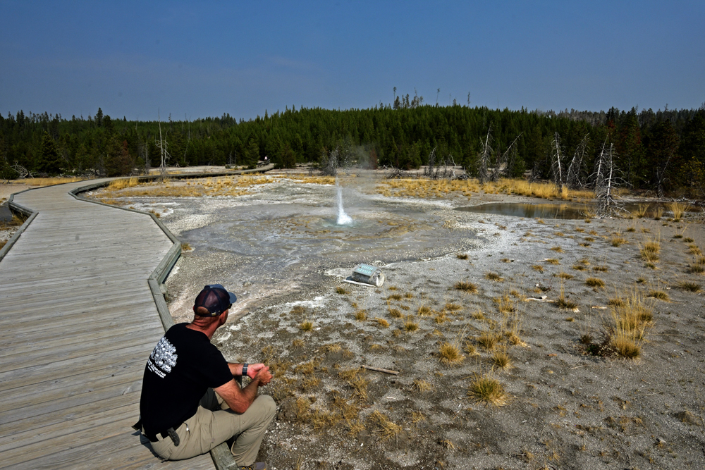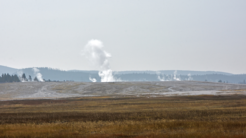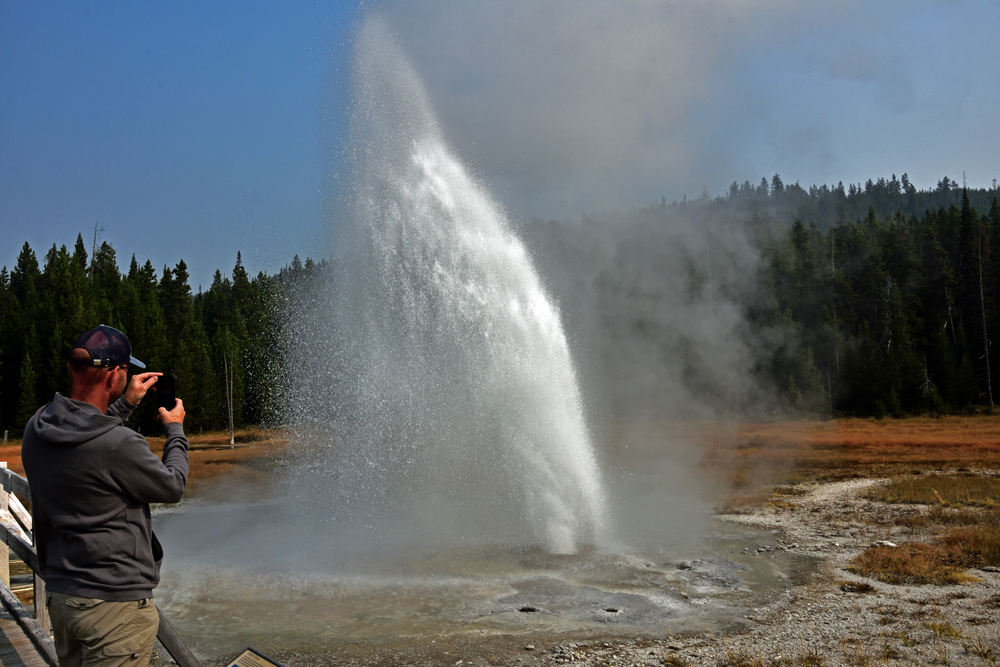 So geniessen wir den Yellowstone halt portionenweise und freuen uns, dass wir die ersten paar Tage noch eine gute Sicht geniessen können, bevor am Wochenende der Wind wieder dreht und den Dunst der Wildfeuer im Südwesten über alles legt. Auf den Ausbruch des Steamboat Geyser, des grössten aktiven Warmwassergeysirs der Welt, warteten wir vergeblich (er ist dann einen Tag später ausgebrochen), aber dafür durften wir den Ausbruch des Aurum Geyser hautnah erleben und die gewaltige Eruption des Grand Geyser, des grössten regelmässig ausbrechenden Geysirs der Welt, bestaunen. Ozy hatte natürlich eine besondere Freude an der Beobachtung des alle 10 Minuten ausbrechenden, hübschen kleinen Vixen (Füchsin) Geyser 😊.