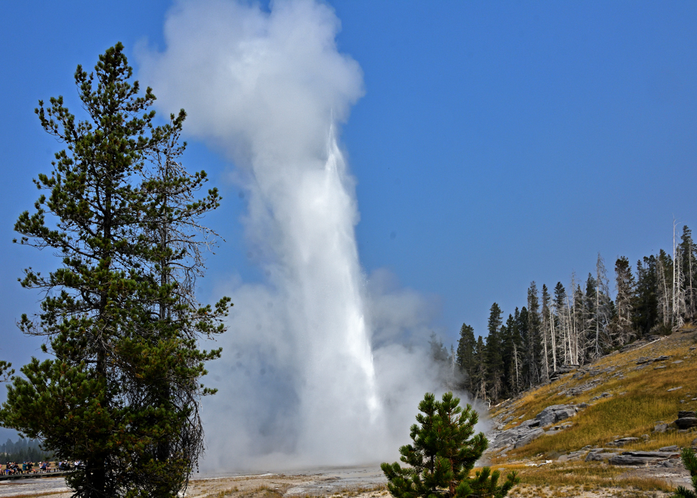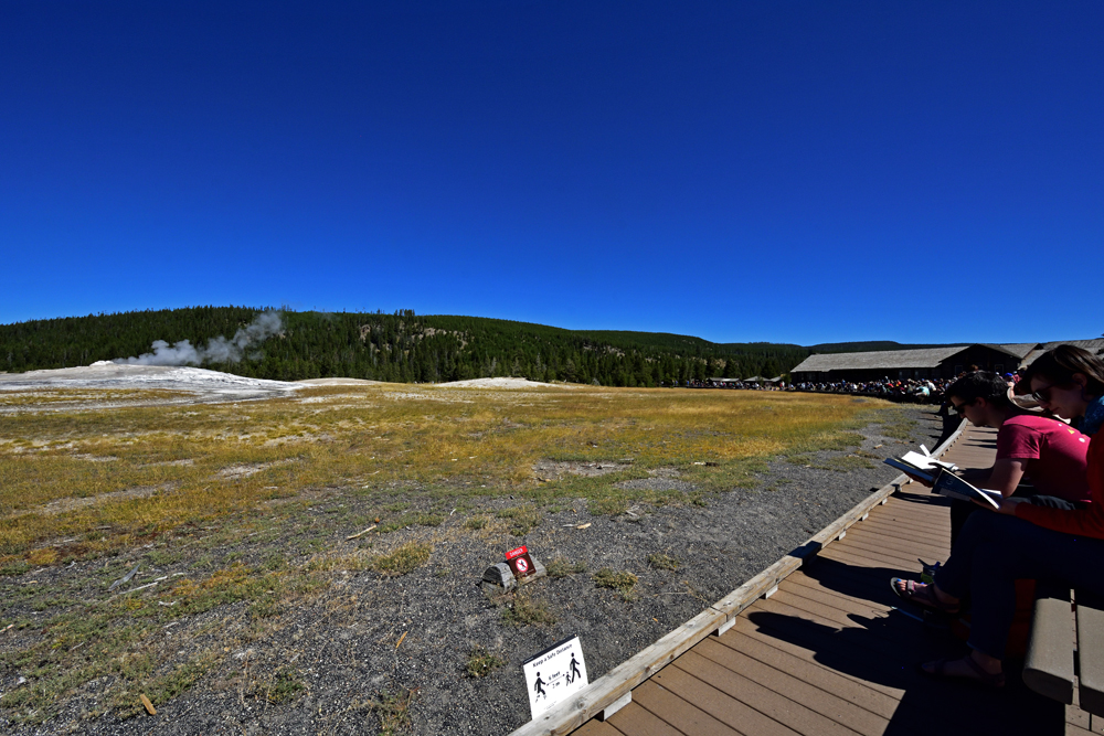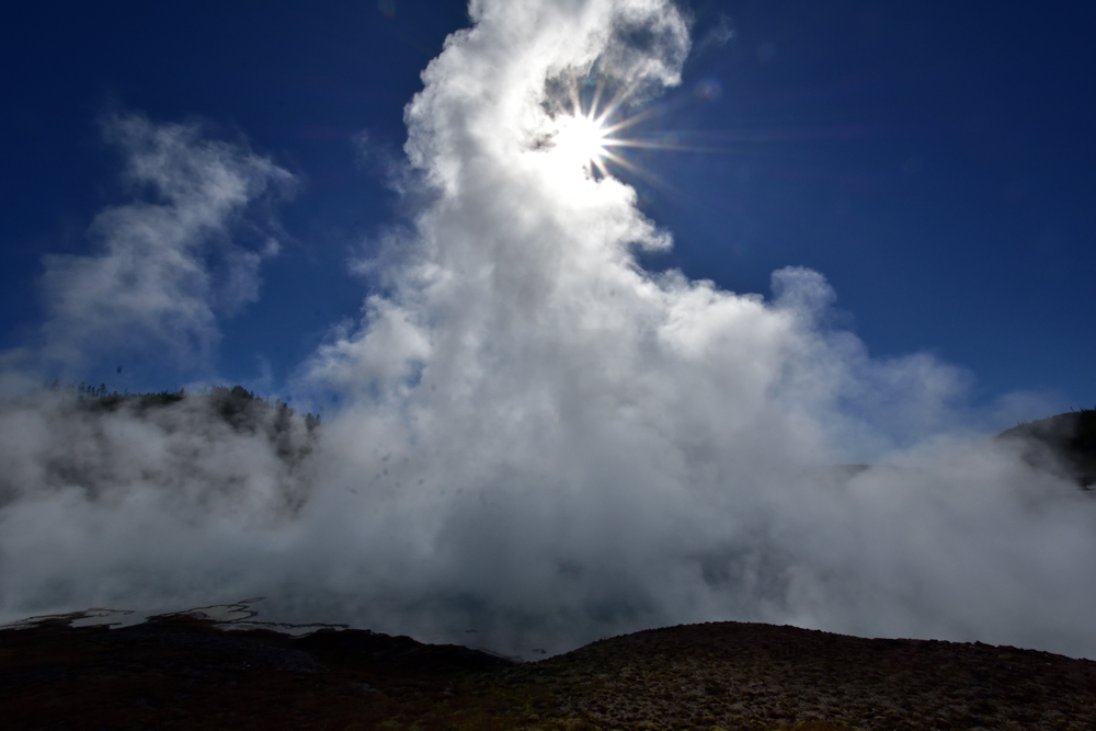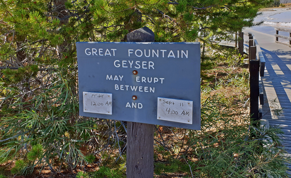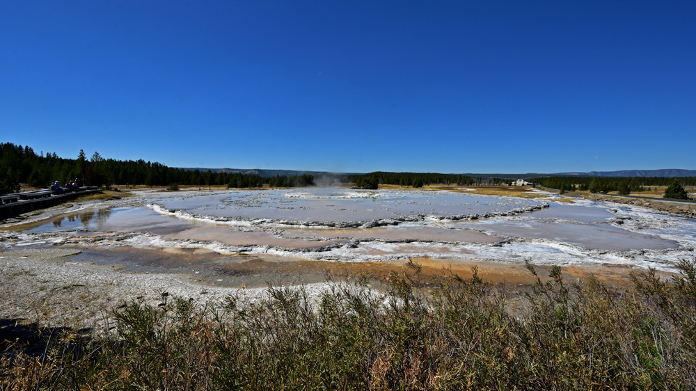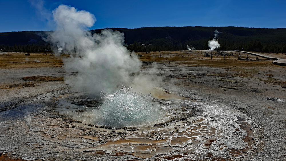 So geniessen wir den Yellowstone halt portionenweise und freuen uns, dass wir die ersten paar Tage noch eine gute Sicht geniessen können, bevor am Wochenende der Wind wieder dreht und den Dunst der Wildfeuer im Südwesten über alles legt. Auf den Ausbruch des Steamboat Geyser, des grössten aktiven Warmwassergeysirs der Welt, warteten wir vergeblich (er ist dann einen Tag später ausgebrochen), aber dafür durften wir den Ausbruch des Aurum Geyser hautnah erleben und die gewaltige Eruption des Grand Geyser, des grössten regelmässig ausbrechenden Geysirs der Welt, bestaunen. Ozy hatte natürlich eine besondere Freude an der Beobachtung des alle 10 Minuten ausbrechenden, hübschen kleinen Vixen (Füchsin) Geyser 😊.