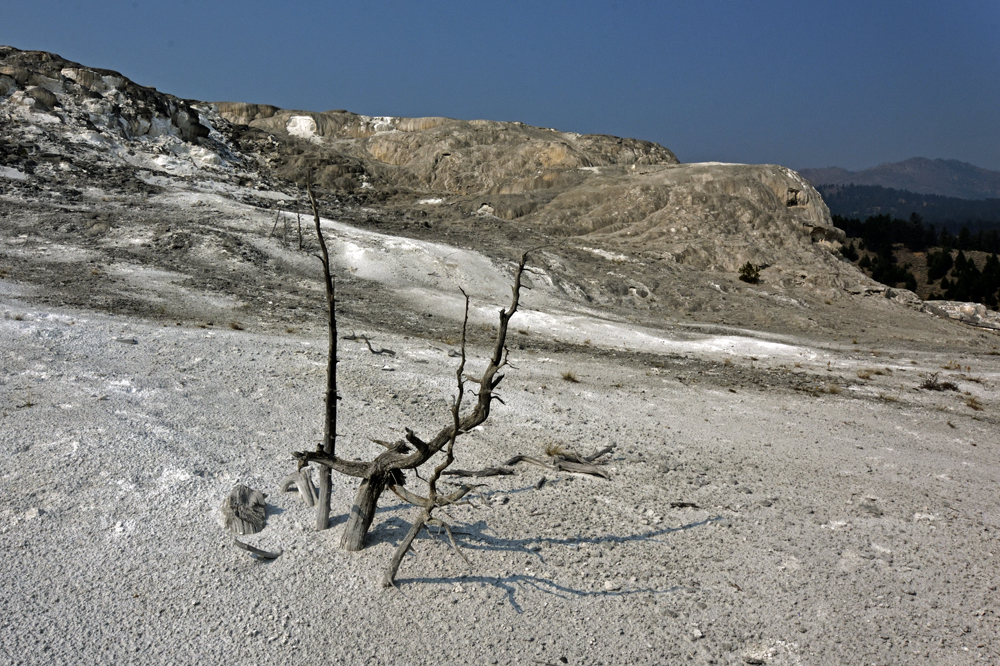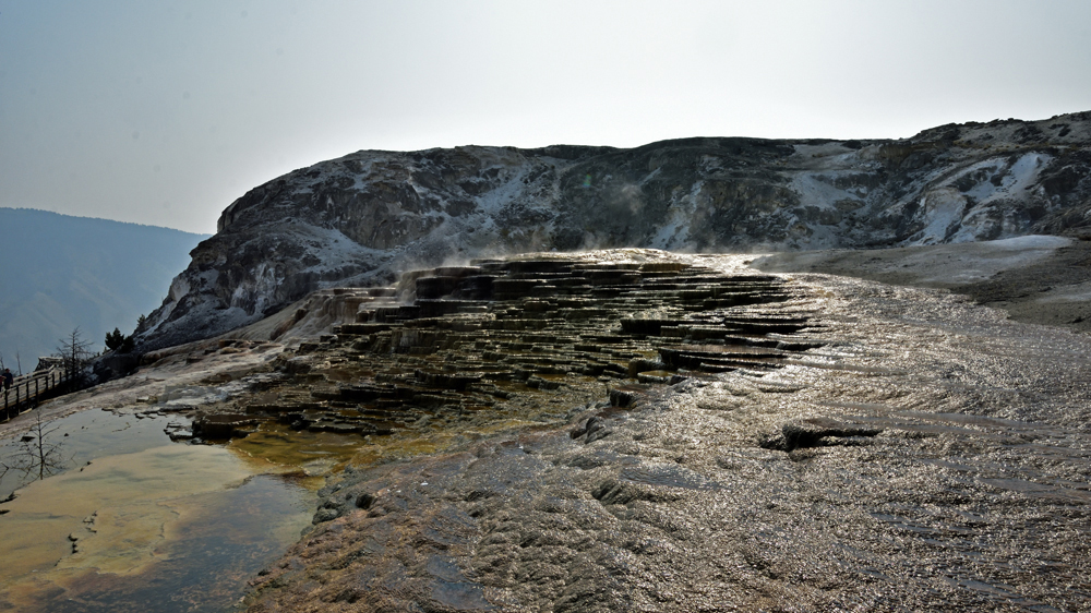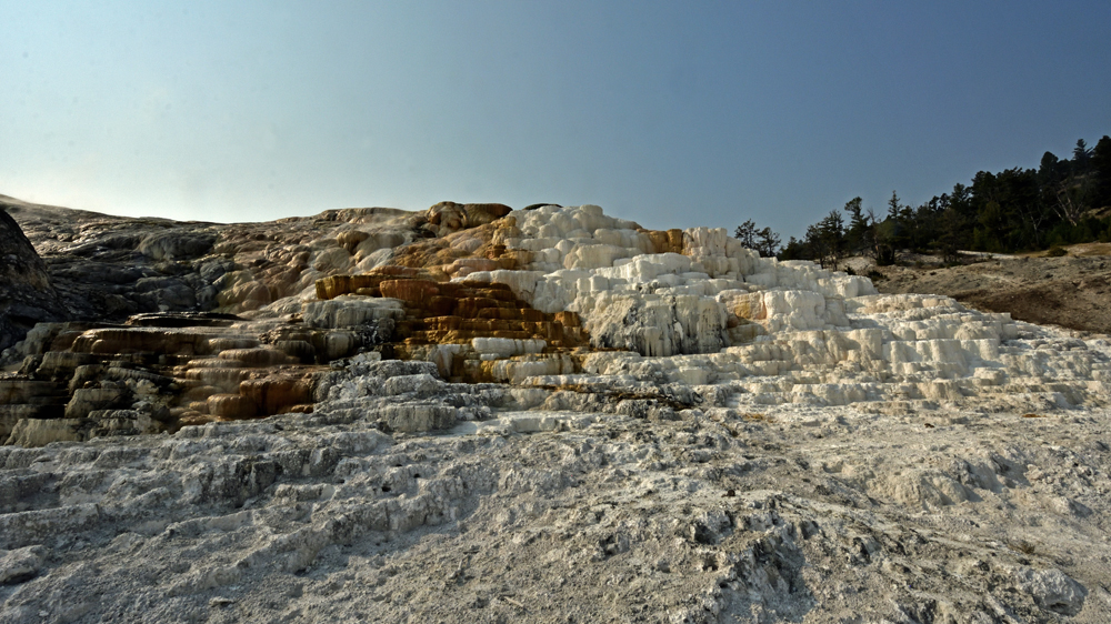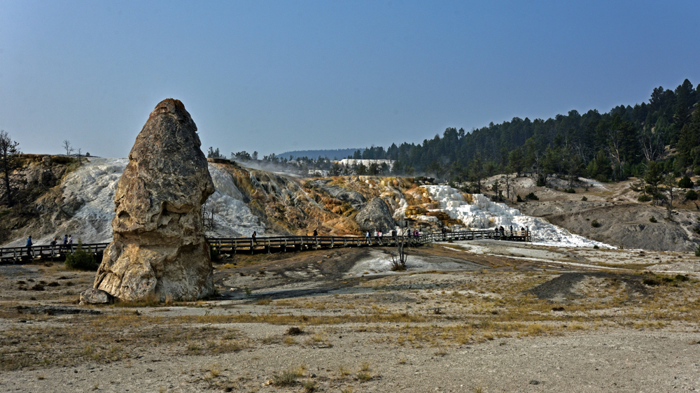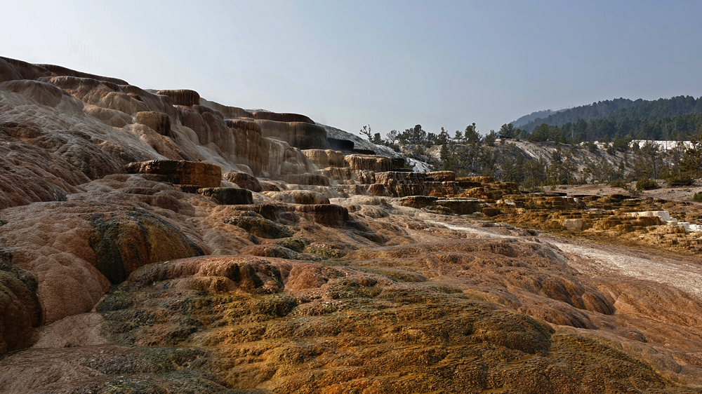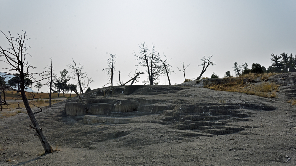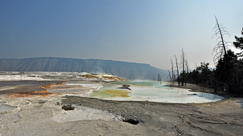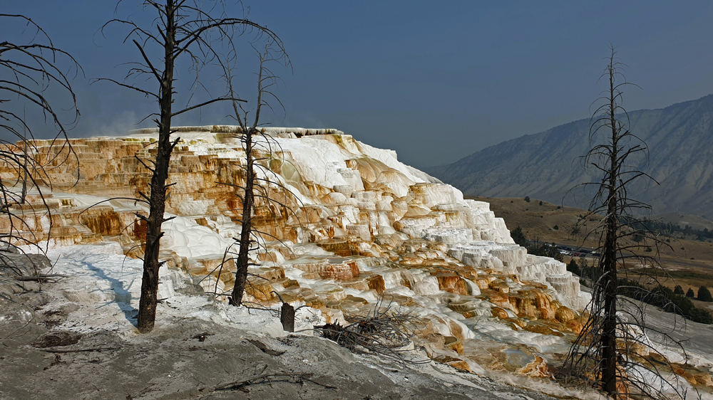 Nach einer Woche ziehen wir in den Norden des Parks um, wo wir nördlich des Parkeingangs in den Bergen oberhalb von Gardiner nochmals auf Public Land übernachten. Am nächsten Morgen fahren wir wieder in den Park und besuchen die Travertin-Terrassen von Mammoth Hot Springs. Diese sind immer noch beeindruckend, wenn auch Veränderungen im Wasserfluss und der Geothermie dafür sorgen, dass es momentan nur wenige aktive Quellen hat und die Travertinterrassen der inaktiven Teile durch das Absterben der Bakterien zuerst ihre Farben und dann durch Erosion und Pflanzenbewuchs ihre filigranen Strukturen nach und nach verlieren. Wenn wieder mehr Wasser fliesst sterben die Bäume ab, die in der Zwischenzeit gewachsen sind. – Hier wird einem der stetiger Wandel von Werden und Vergehen besonders vor Augen geführt.