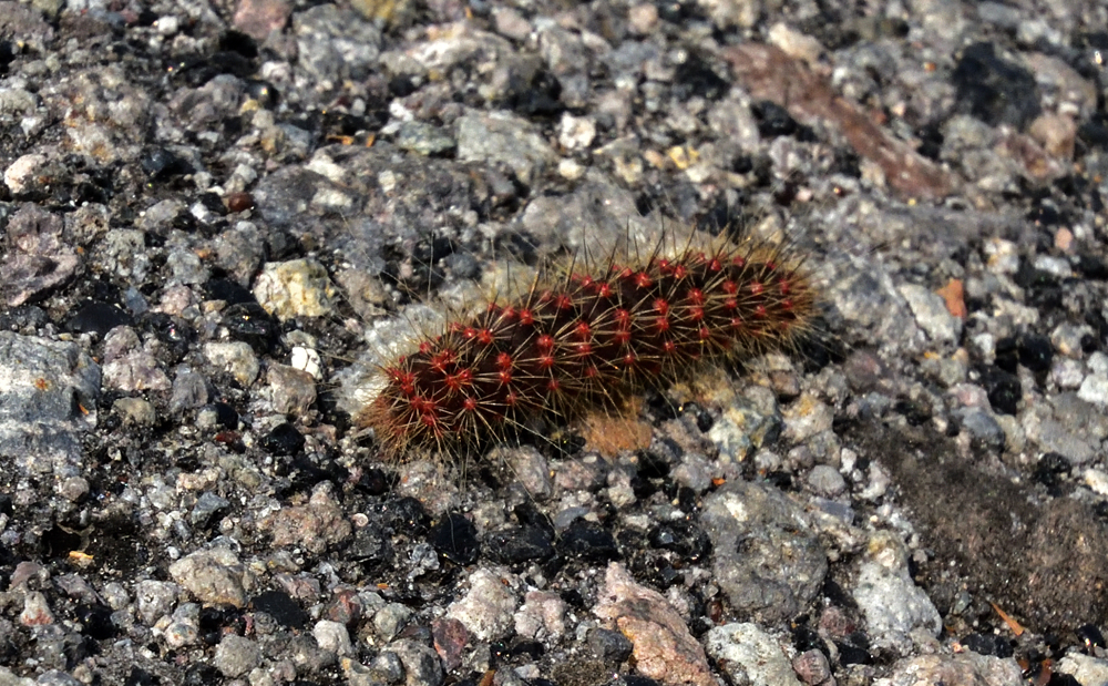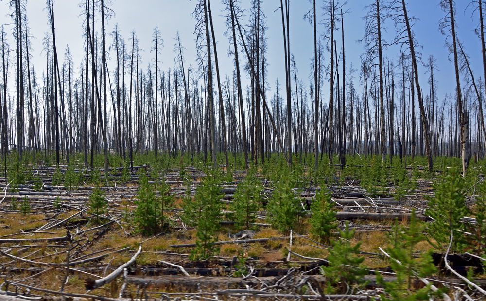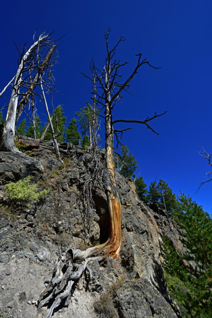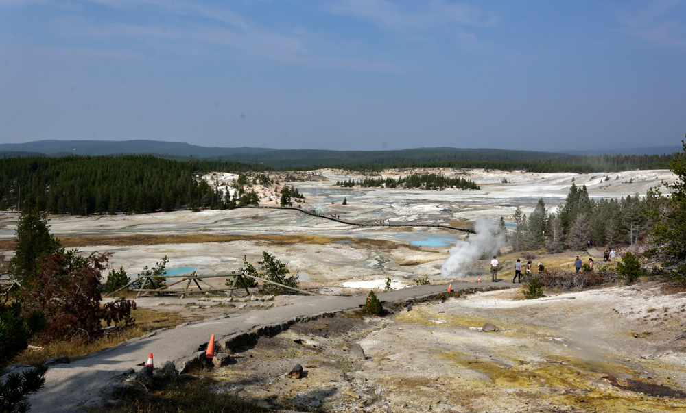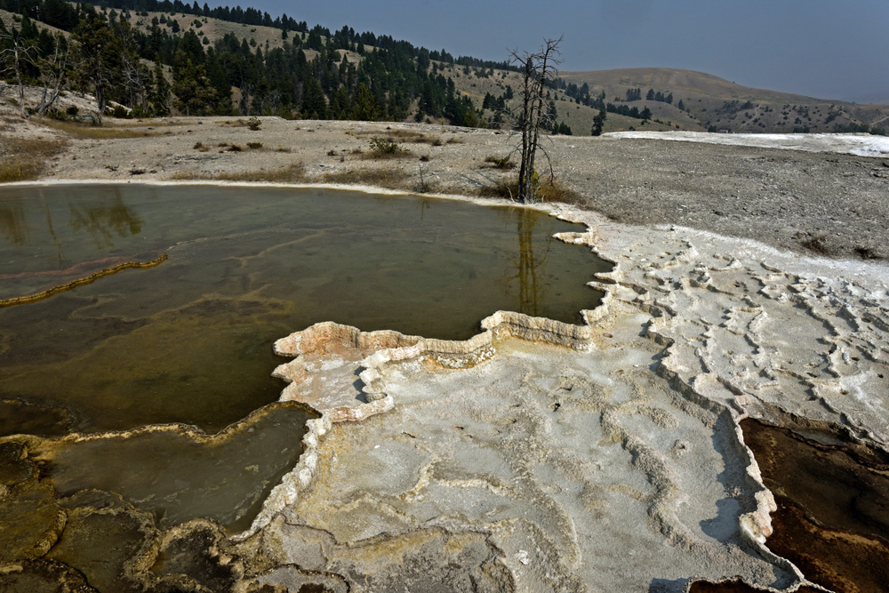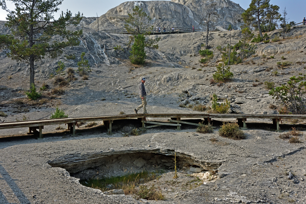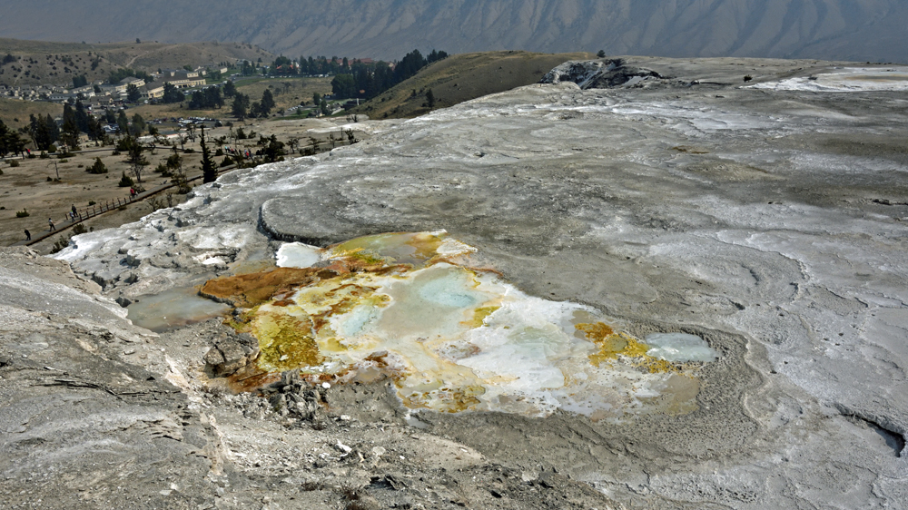 Nach einer Woche ziehen wir in den Norden des Parks um, wo wir nördlich des Parkeingangs in den Bergen oberhalb von Gardiner nochmals auf Public Land übernachten. Am nächsten Morgen fahren wir wieder in den Park und besuchen die Travertin-Terrassen von Mammoth Hot Springs. Diese sind immer noch beeindruckend, wenn auch Veränderungen im Wasserfluss und der Geothermie dafür sorgen, dass es momentan nur wenige aktive Quellen hat und die Travertinterrassen der inaktiven Teile durch das Absterben der Bakterien zuerst ihre Farben und dann durch Erosion und Pflanzenbewuchs ihre filigranen Strukturen nach und nach verlieren. Wenn wieder mehr Wasser fliesst sterben die Bäume ab, die in der Zwischenzeit gewachsen sind. – Hier wird einem der stetiger Wandel von Werden und Vergehen besonders vor Augen geführt.
