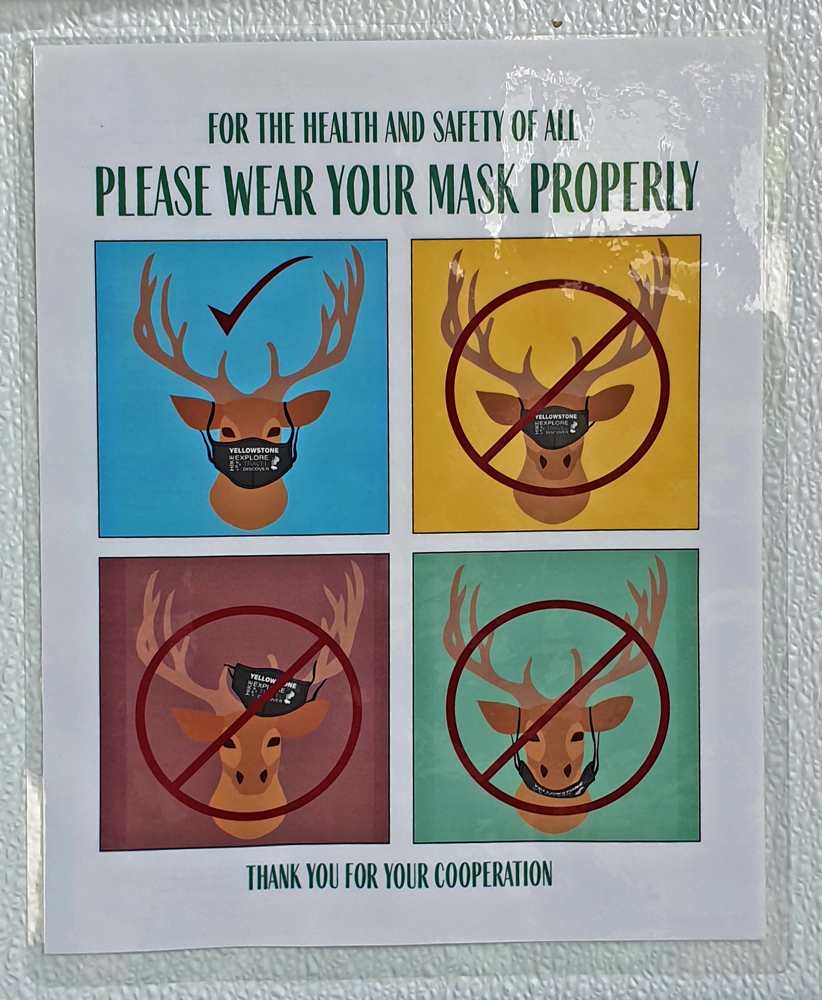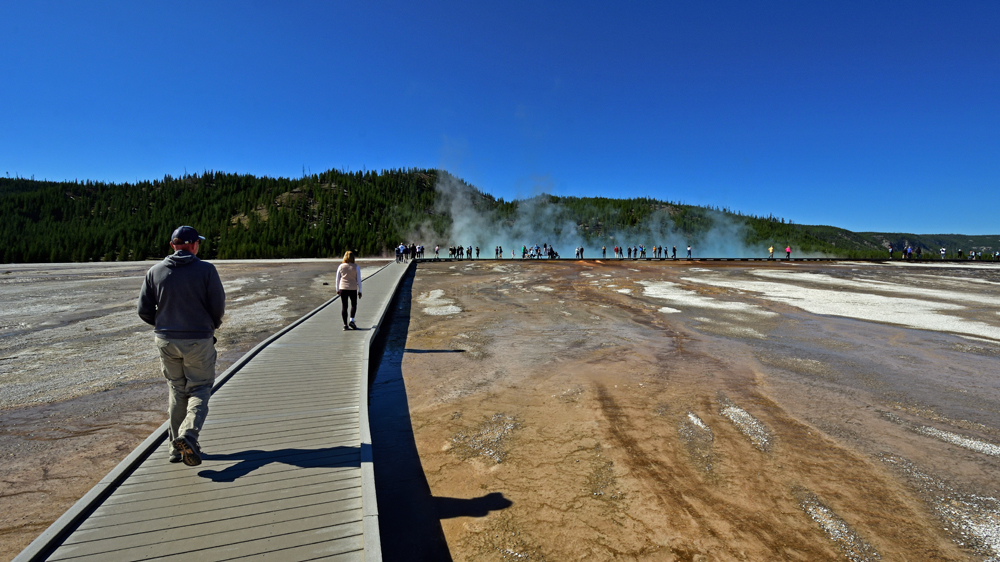 Aber auch so ist es im Park nicht wirklich lustig, denn einerseits verursachen eine – leider sehr ortstreue – Elk-Herde und der gelegentliche einsame Bison jeden Morgen einen ein bis eineinhalbstündigen Stau auf der Zubringerstrasse (und das trotz Halteverboten und dort positionierten Rangern, die die Autos durchwinken), andererseits ist die Parkplatzsuche jeweils auch nicht ganz einfach. Und nicht zuletzt sind die Stege mehr oder weniger stark mit bemaskten und unbemaskten Menschen gefüllt. Wenn wir nicht den grossen Wunsch hätten, die geologischen und landschaftlichen Wunderwerke der Natur wiederzusehen (wir waren 2015 nur zwei Wochen später im Jahr schon mal hier – mit wesentlich weniger Menschen), hätten wir wieder kehrt gemacht.