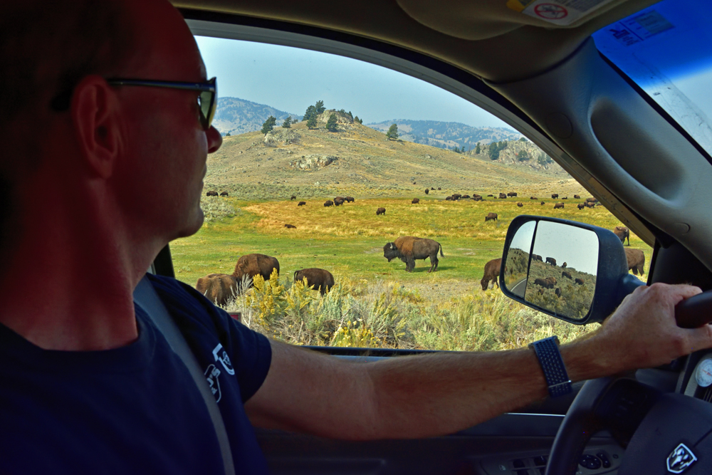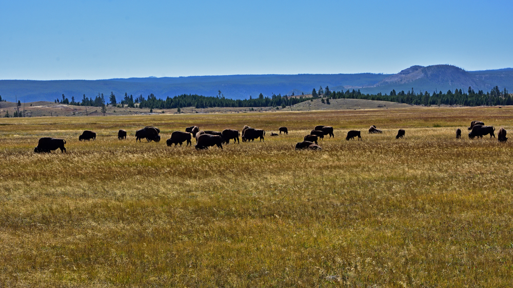 Zum Abschluss nehmen wir die Strasse zum Nordost-Ausgang. Diese führt durch das wegen seiner abgelegenen Lage etwas weniger überlaufene Lamar-Valley, das zwar nicht mit geothermischen Wundern, dafür aber mit einer reichen Tierwelt aufwarten kann: so viele Bisons und in so grossen Herden haben wir noch nie gesehen!