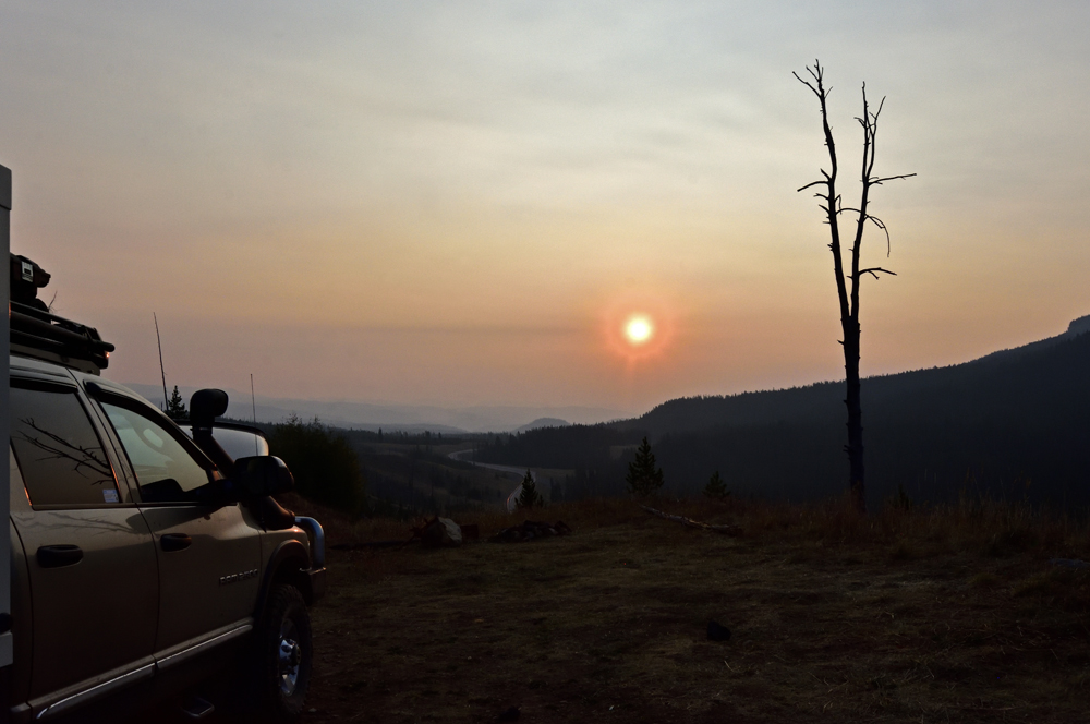 Nach einem wegen des Haze wieder spektakulären Sonnenaufgang fahren wir von Cooke City aus den Beartooth Highway, «a National Scenic Byways All-American Road». Diese Passstrasse ist im Winter geschlossen, so dass das sehr abgelegene Örtchen dann nur von Gardiner her durch den Yellowstone NP erreicht werden kann. Jetzt ist es aber noch schön und halbwegs warm, und wir dürfen eine spektakuläre Fahrt über den 3’337 m hohen Bearthooth Pass erleben, auch wenn der Dunst die Sicht stark beeinträchtigt.