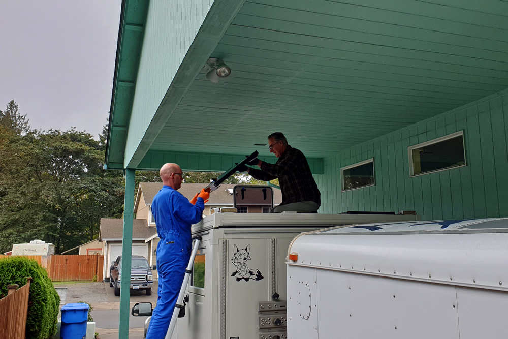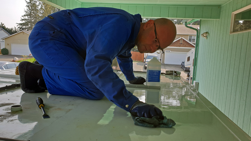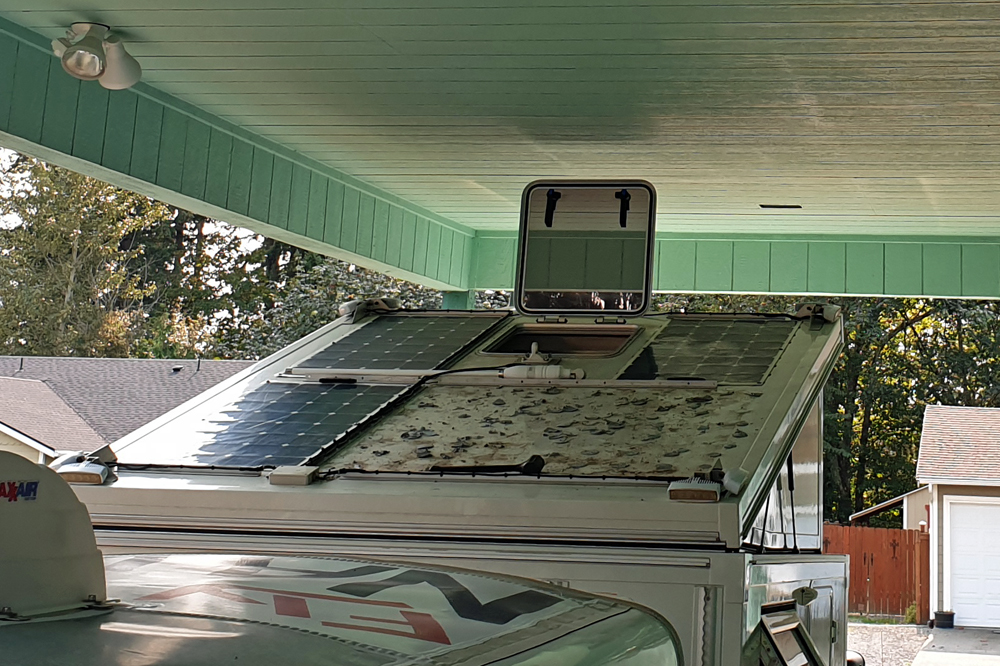 Hierbei ist der Austausch der Solarzellen prioritär: statt der flexiblen kommen nun klassische Glaspaneele drauf, von denen wir hoffen, dass sie länger halten (die flexiblen Solarzellen hatten wir erst im Mai 2017 montiert…). Was allerdings immer noch bobmenfest hält, ist der Titgemeyer-Kleber mit denen sie montiert waren. Ozy müht sich zwei Tage lang ab, um erst die Paneele und dann die Kleberreste zu entfernen…
