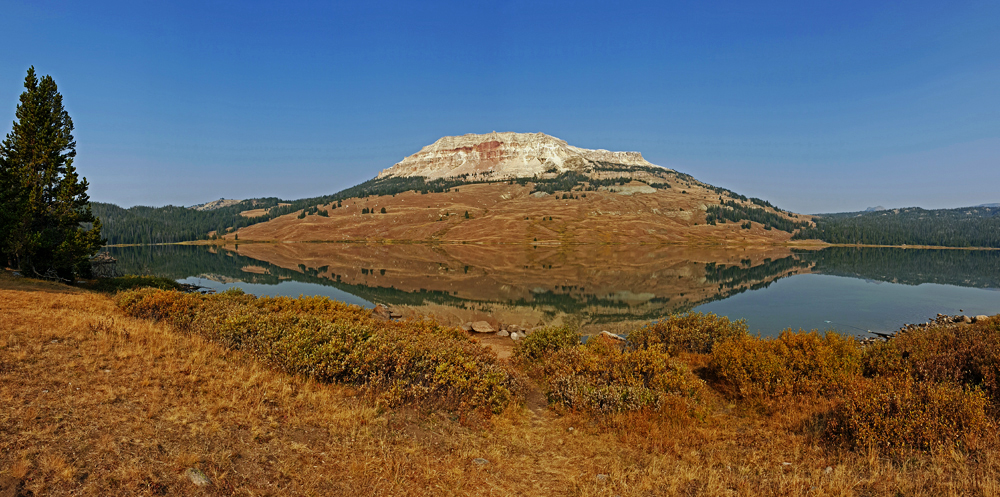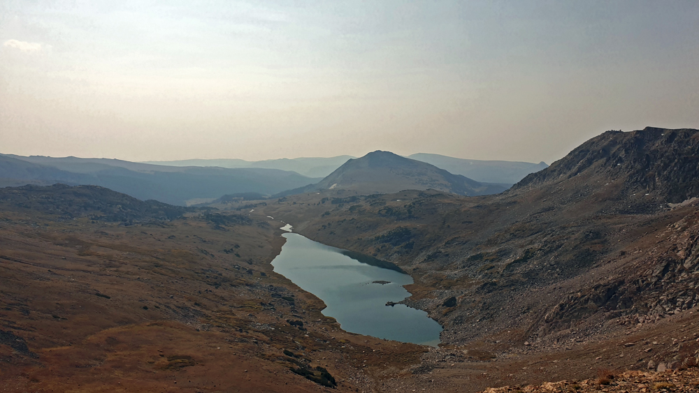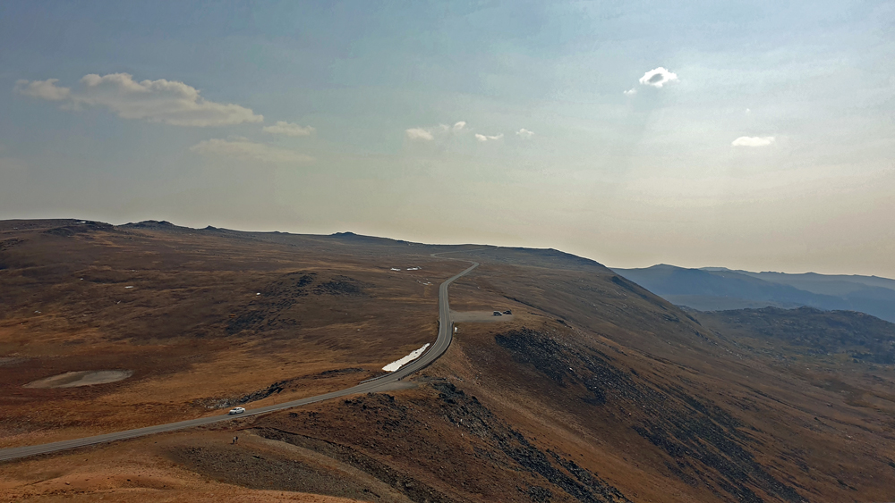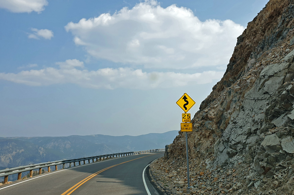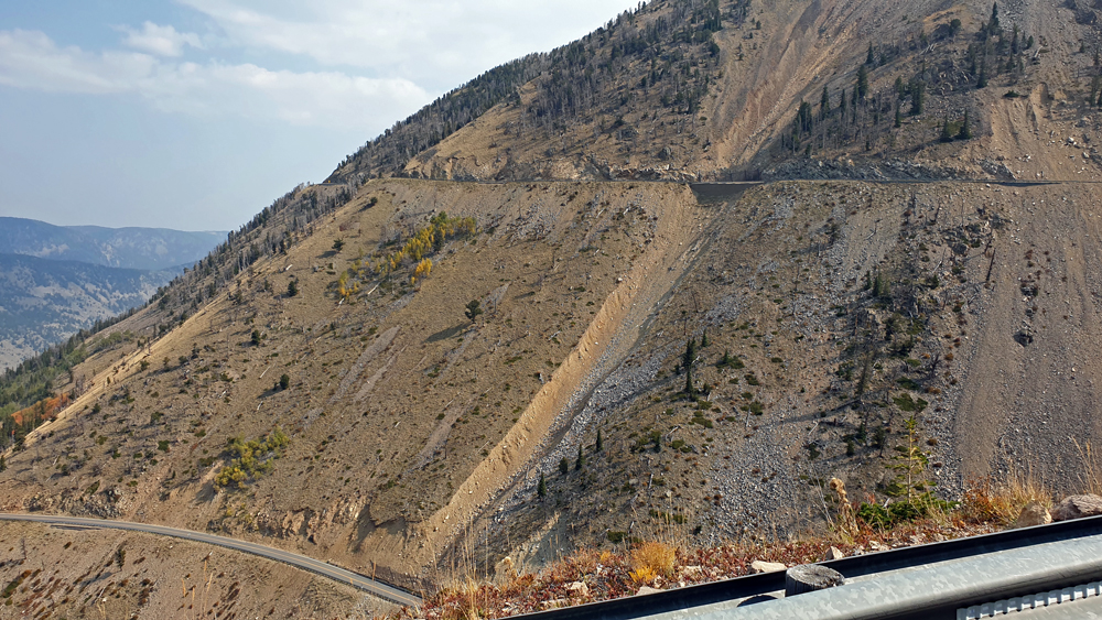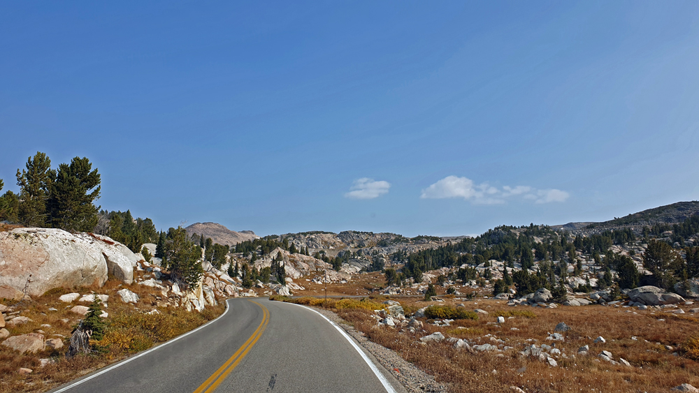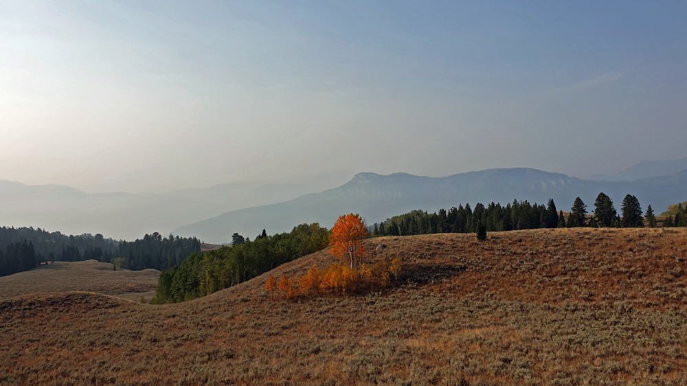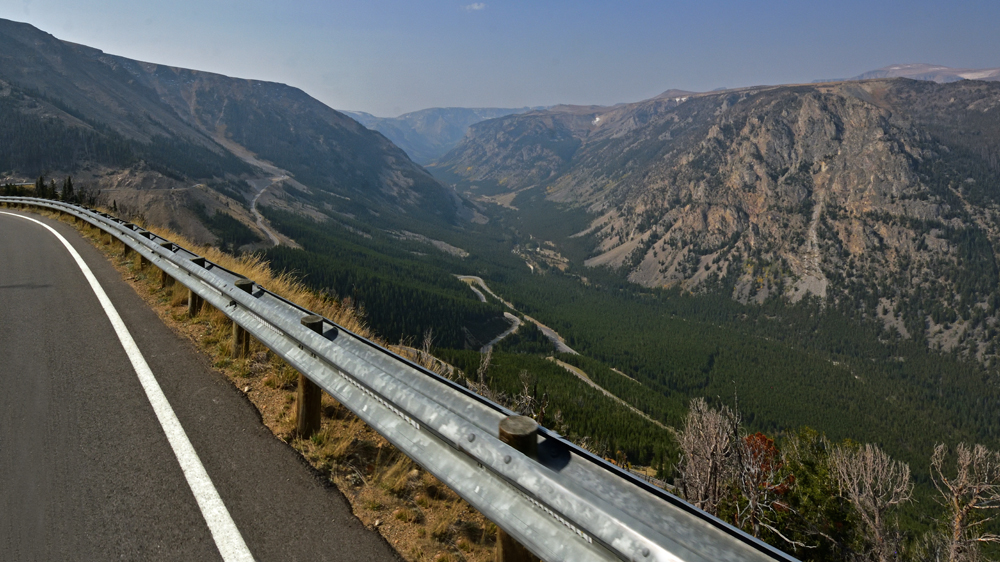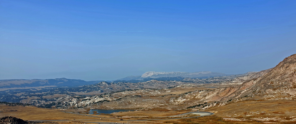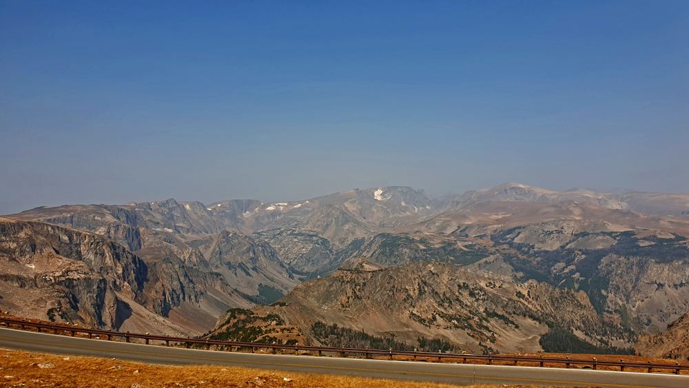 Nach einem wegen des Haze wieder spektakulären Sonnenaufgang fahren wir von Cooke City aus den Beartooth Highway, «a National Scenic Byways All-American Road». Diese Passstrasse ist im Winter geschlossen, so dass das sehr abgelegene Örtchen dann nur von Gardiner her durch den Yellowstone NP erreicht werden kann. Jetzt ist es aber noch schön und halbwegs warm, und wir dürfen eine spektakuläre Fahrt über den 3’337 m hohen Bearthooth Pass erleben, auch wenn der Dunst die Sicht stark beeinträchtigt.