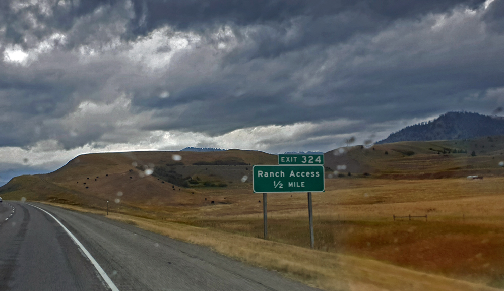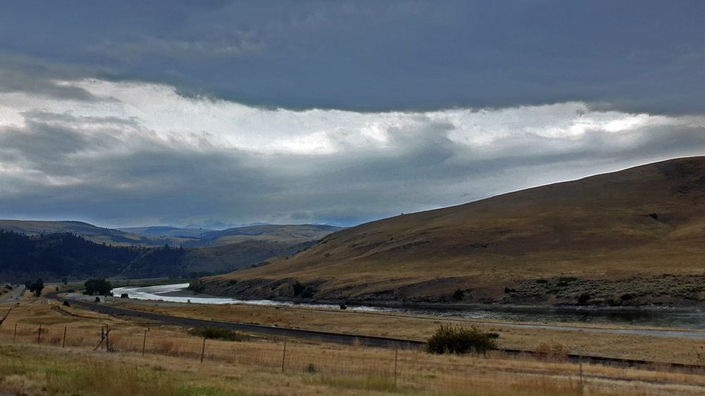 Am nächsten Tag folgen wir auf der I-90 dem Lauf des Yellowstone River. Die Landschaft ist hügelig-bergig und recht karg. Tiefhängende Wolken sorgen aber immerhin für spannende Lichtstimmungen.