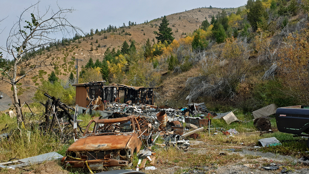 Wir waren 2015 schon einmal hier und haben auf unserer Suche nach einem Aussichtspunkt auf den Riesen-Schornstein John kennengelernt und standen seither in Briefkontakt. Da unser Weihnachtsbrief 2018 wieder zurückgekommen ist, haben wir schon ein ungutes Gefühl als wir in den Sheep Gulch hinauffahren. Trotzdem waren wir in keinster Weise auf das vorbereitet, was uns an seinem ehemaligen Wohnort erwartet: es sieht nicht nur so aus, als ob es hier gebrannt hätte, sondern vielmehr, als ob gleichzeitig auch noch ein Wirbelsturm und eine Horde Vandalen über den Platz hergefallen wären!!! Wir sind tief geschockt und sprachlos und hoffen inständig, dass John nicht hier war, als das passiert ist…
