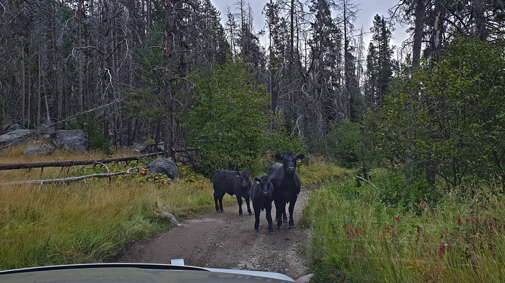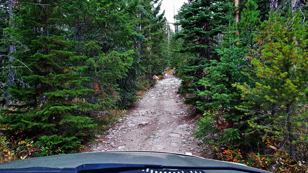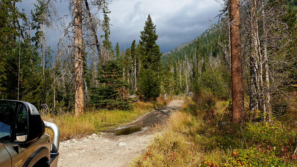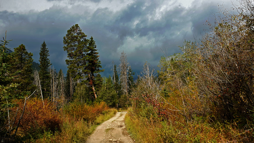 Auf der Karte sieht es so aus, als ob man auf einer Piste «hinten rum» bis nach Philipsburg fahren könnte. Am nächsten Tag versuchen wir unser Glück, auch wenn die rapide zunehmenden schwarzen Wolken nichts Gutes verheissen. Die «Racetrack Road» macht ihrem Namen keine Ehre und wir rumpeln mit reduziertem Luftdruck in den Reifen langsam durch den Wald. Entgegenkommende Jäger informieren uns dann, dass die Piste leider nicht durchgehend sei. Da wir schon recht weit gekommen sind, fahren wir noch an der Racetrack Cabin vorbei bis zu einem kleinen Parkplatz, von dem drei Trails ausgehen, und der gleichzeitig das Ende der mit einem normalbreiten Vehikel befahrbaren Strasse markiert.