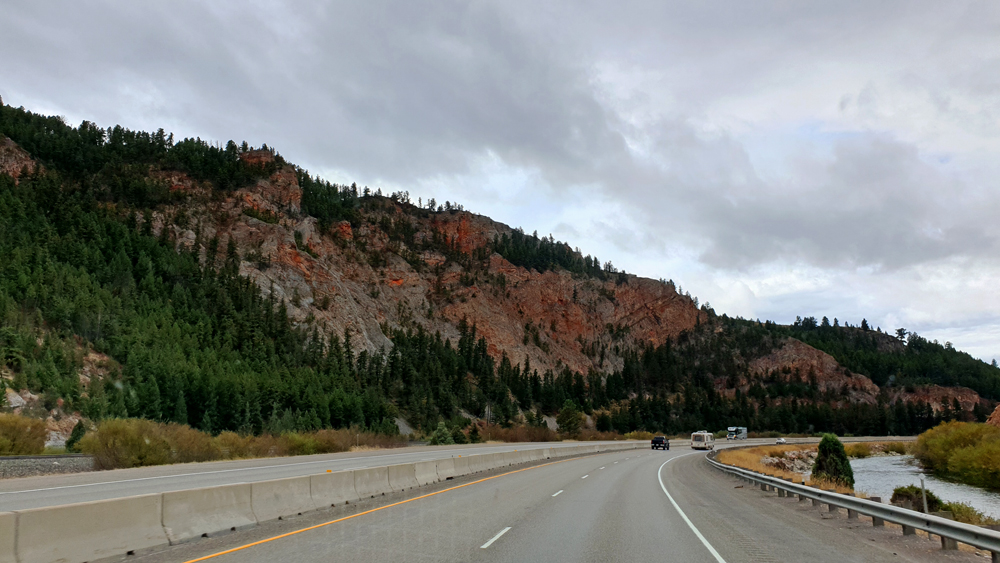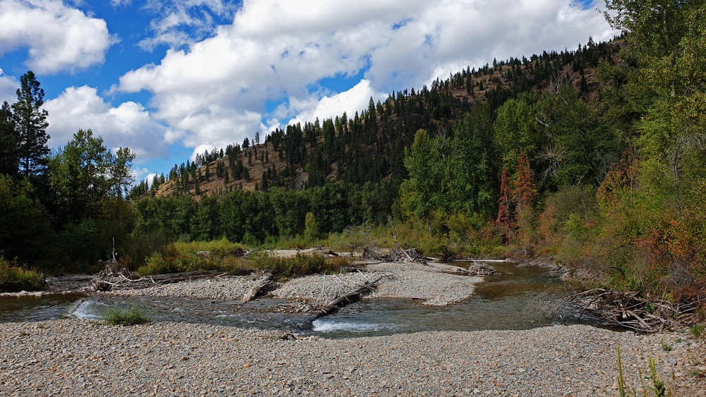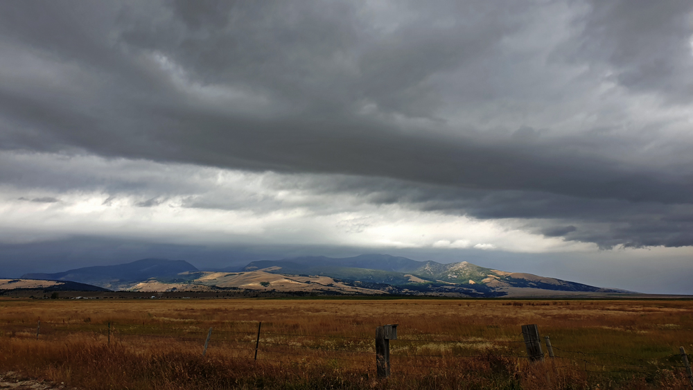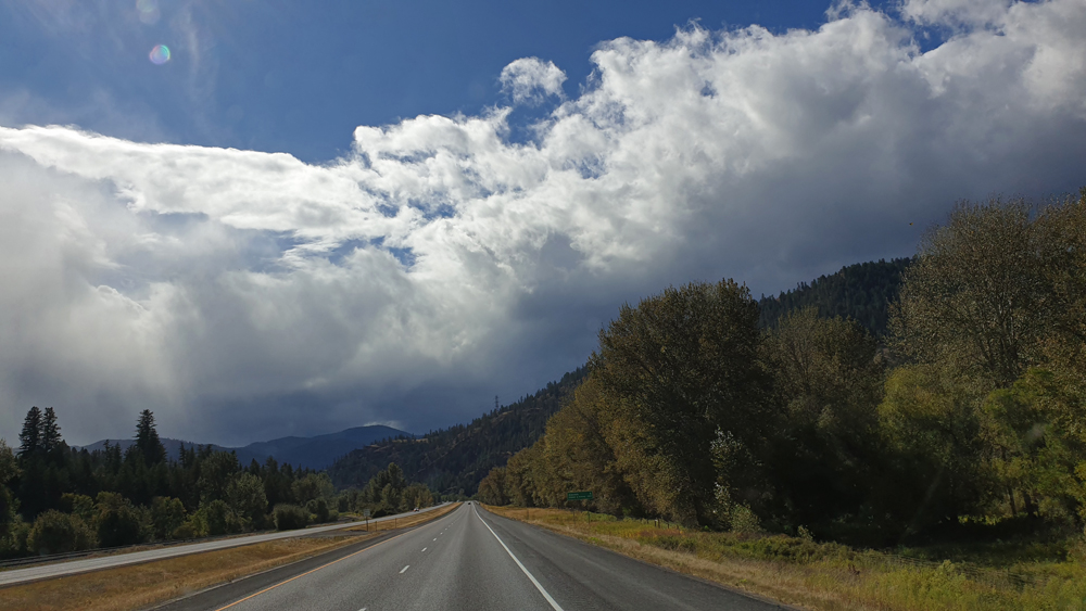 Die Interstate führt nun recht malerisch entlang des stark mäandrierenden Clark Fork, der unzählige Male auf zunehmend längeren und höheren Brücken überquert wird. Rechts und links der Strasse kommen die Berge immer näher. Die Wolken türmen sich in immer neuen Formationen auf und lassen manchmal auch ein bisschen Sonne durch.