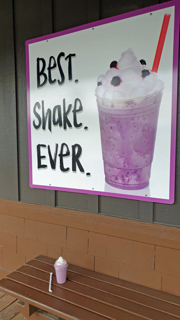 Am nächsten Tag besuchen wir das nächste Highlight – das St. Regis Travel Center, wo es nicht nur einen riesigen Montana-Souvenirshop inklusive Aquarium mit 5 verschiedenen Forellenarten gibt, sondern auch und vor allem den «Best Huckleberry Shake Ever» wie grosse Werbetafeln schon laaaange vorher verkünden. Das müssen wir natürlich testen!