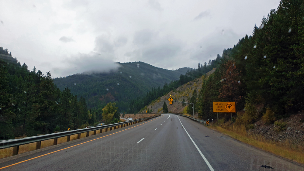 Die I-90 führt immer höher hinauf und überquert schliesslich den Lookout Pass, der hier die Grenze zwischen Montana und Idaho bildet. Leider regnet es nun und die Kurvige, stark befahrene Strecke fordert Ozy höchste Konzentration ab.