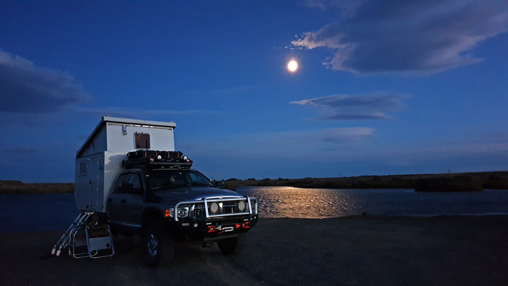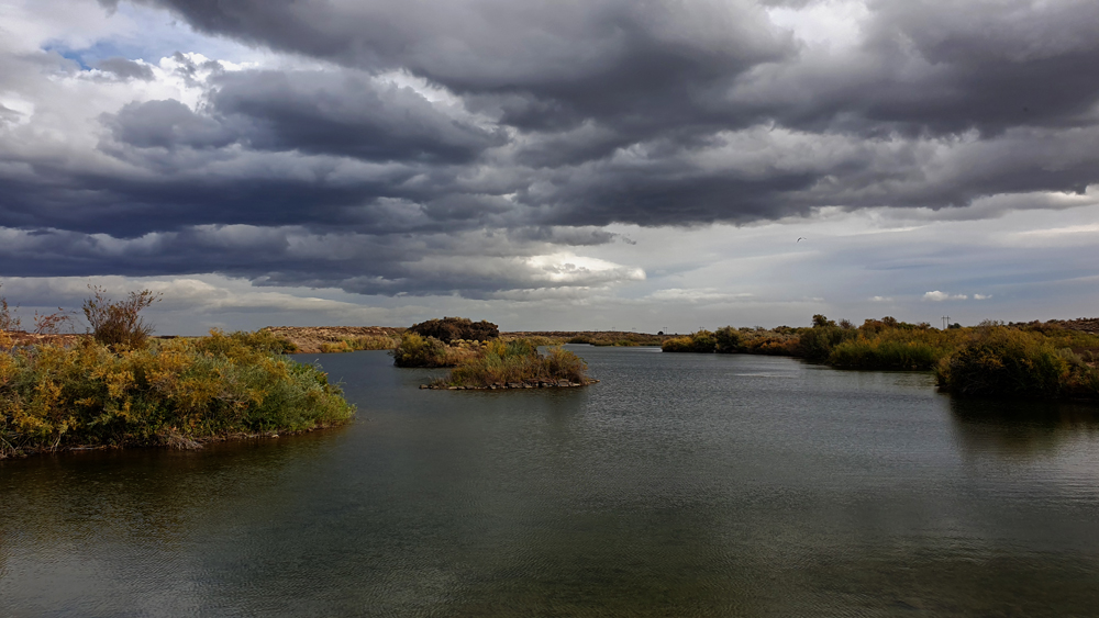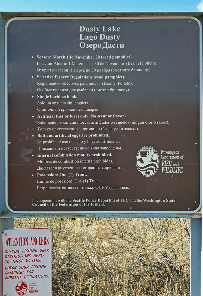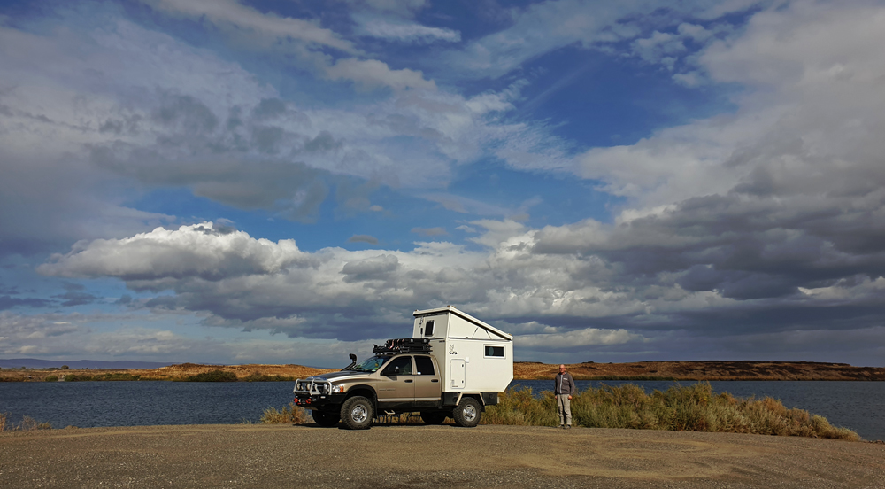 Wir hatten schon letztes Mal Probleme, in dieser stark landwirtschaftlich genutzten Gegend einen Übernachtungsplatz zu finden. Als wir in Moses Lake unsere Route vom Juli kreuzen, überlegen wir kurz, ob wir wieder die Grand Coulee hinauffahren sollen. Wir entscheiden uns dann aber dagegen und fahren noch etwas weiter bis in die Nähe des Columbia Rivers, wo wir einen etwas windigen, aber schönen Platz am Evergreen Reservoir finden.