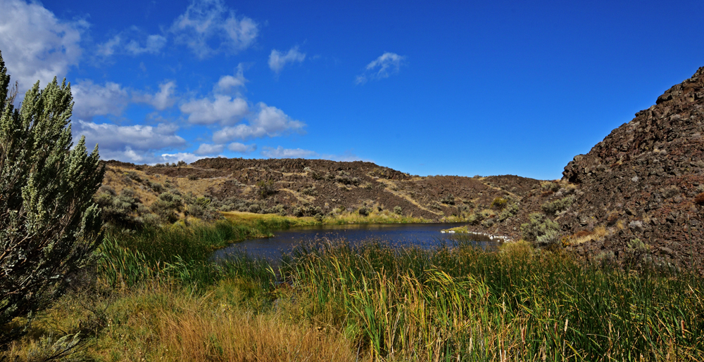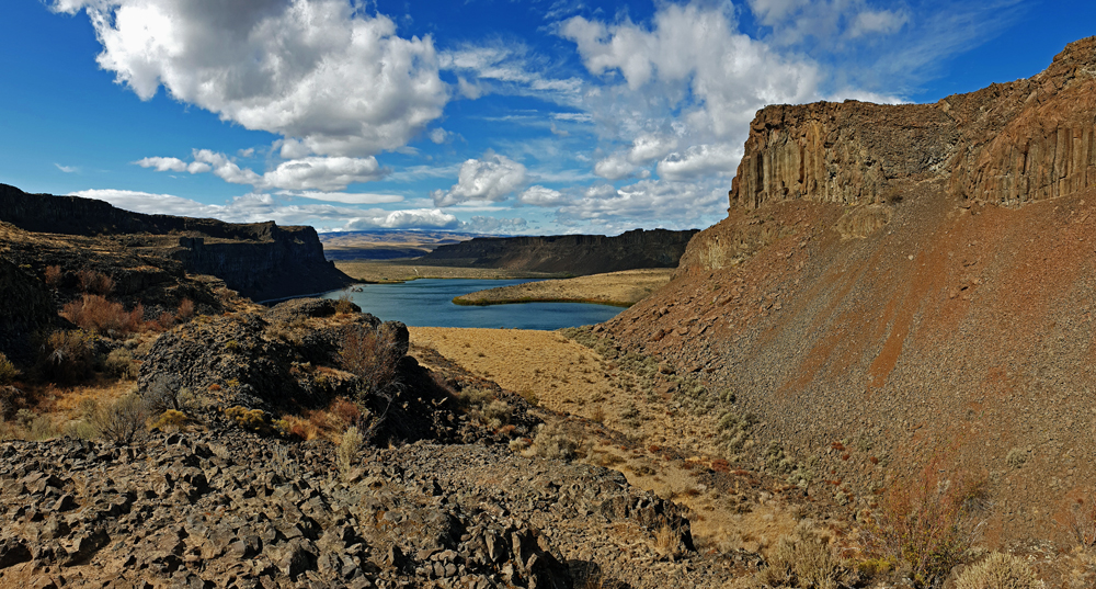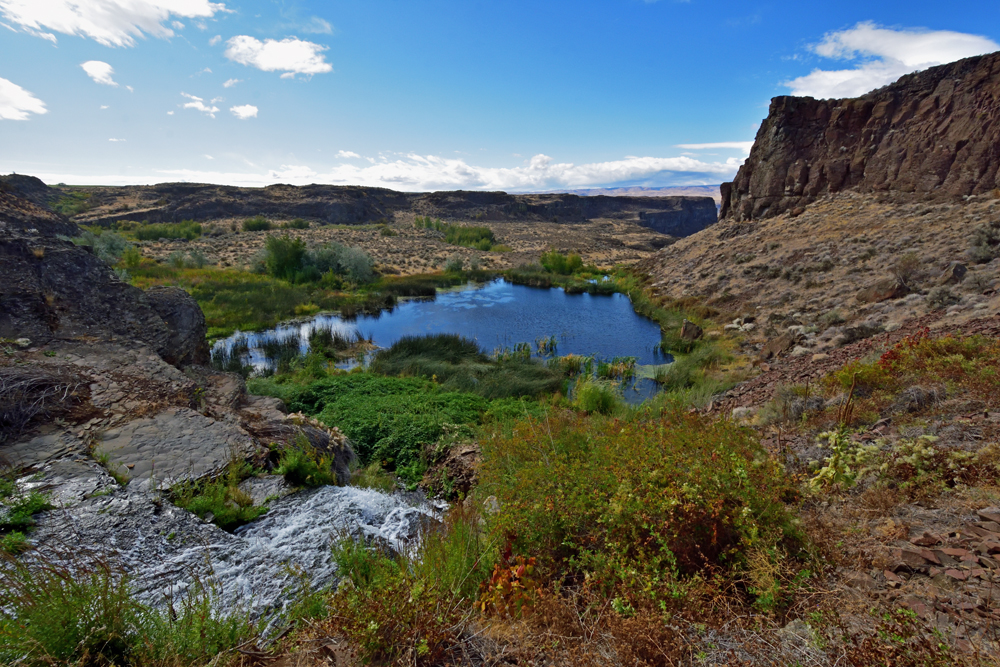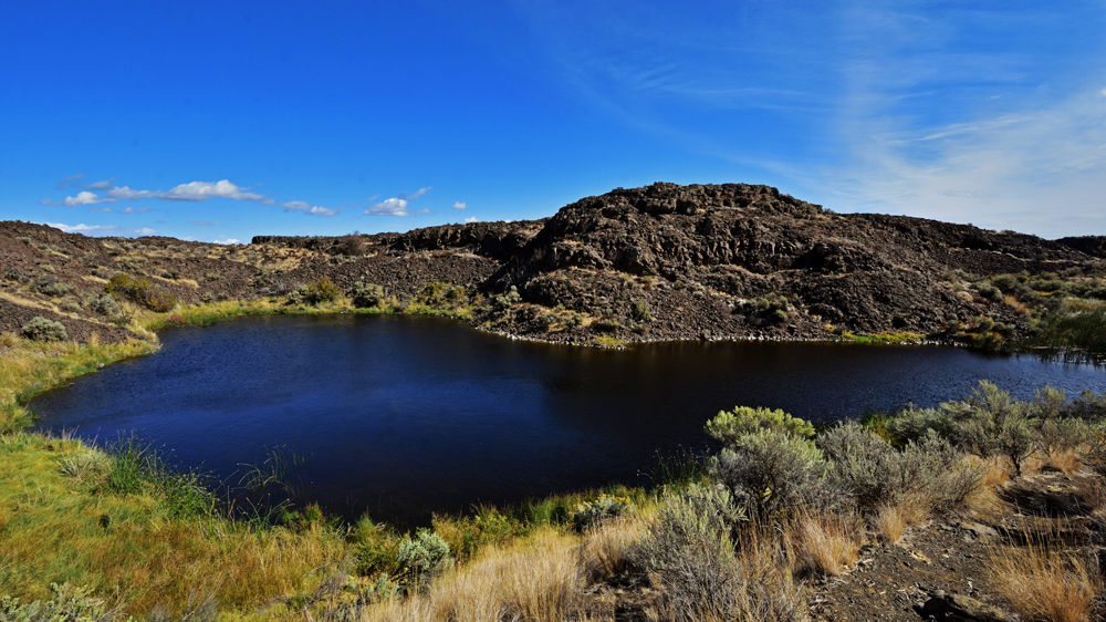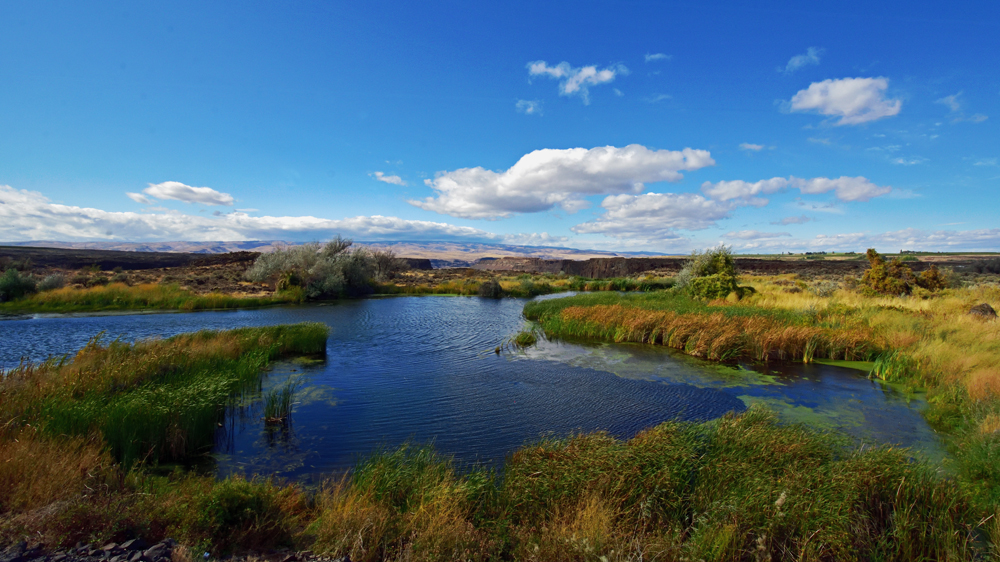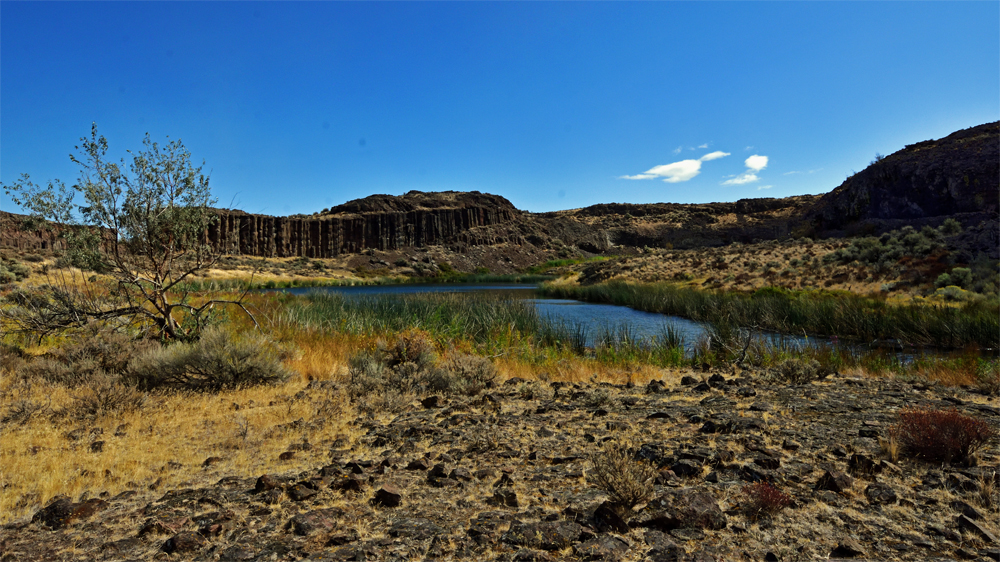 Die ganze Gegend der Quincy Lakes Wildlife Area gefällt uns so gut, dass wir gleich noch einen Tag bleiben. Verschiedene mit Seen und Tümpeln gespickte Basaltterrassen vermitteln hier zwischen dem Columbia Plateau und der Schlucht des Columbia River. Die blauen Gewässer mit ihren grünen Pflanzengürteln heben sich sehr malerisch von den umgebenden dunklen Basaltwänden ab, weshalb ich mir die Gegend genauer ansehen möchte. Die «kurze Wanderung» entpuppt sich dann als langwieriger und recht benteuerlich, da meine vorgesehene Route versumpft und durch dichtes, teils stacheliges Gebüsch versperrt ist. Mit Hilfe der Satellitenkarte von Google Maps und Wildwechseln finde ich schliesslich einen Weg über diverse Terrassen und komme am Schluss sogar dort wieder zurück aufs Plateau, wo ich ursprünglich geplant hatte.