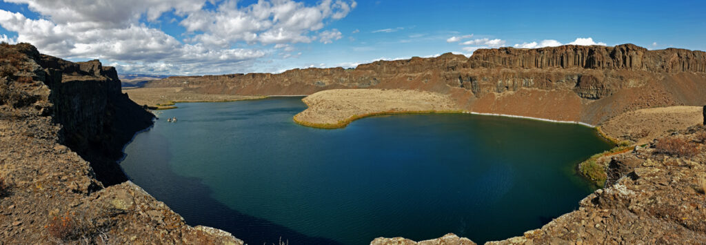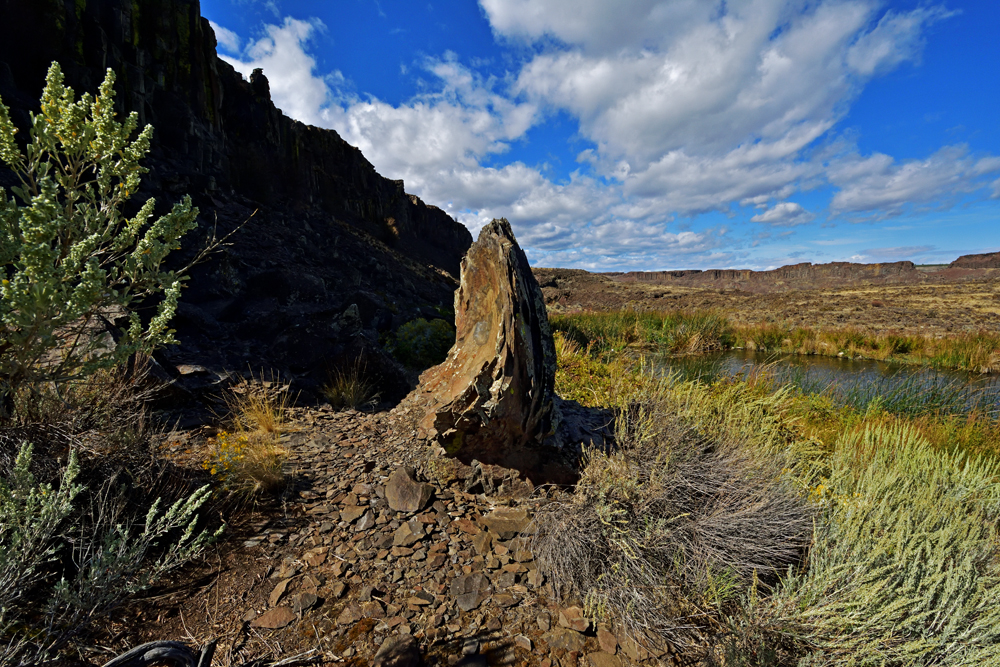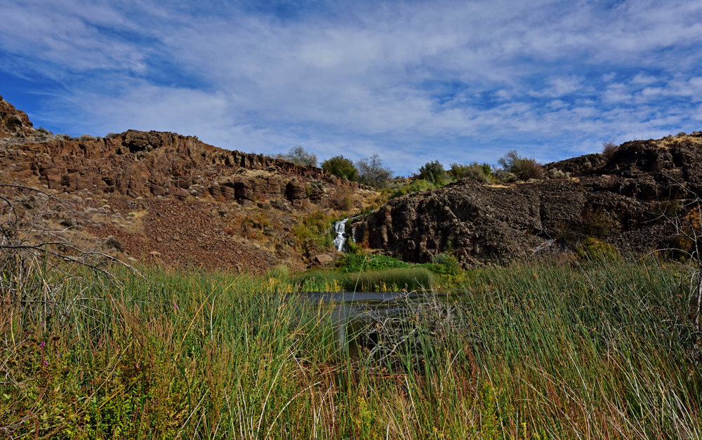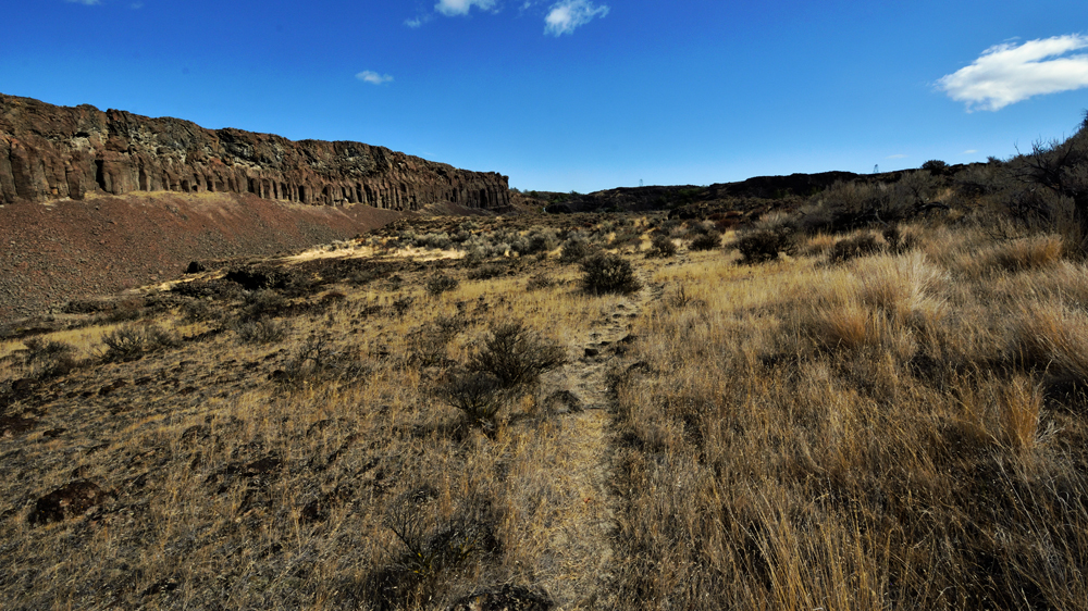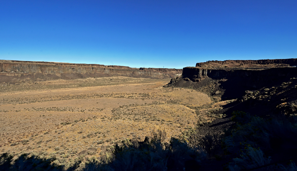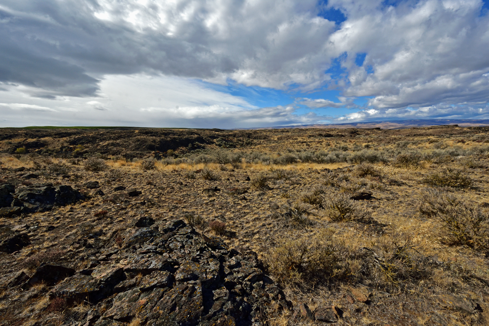 Die ganze Gegend der Quincy Lakes Wildlife Area gefällt uns so gut, dass wir gleich noch einen Tag bleiben. Verschiedene mit Seen und Tümpeln gespickte Basaltterrassen vermitteln hier zwischen dem Columbia Plateau und der Schlucht des Columbia River. Die blauen Gewässer mit ihren grünen Pflanzengürteln heben sich sehr malerisch von den umgebenden dunklen Basaltwänden ab, weshalb ich mir die Gegend genauer ansehen möchte. Die «kurze Wanderung» entpuppt sich dann als langwieriger und recht benteuerlich, da meine vorgesehene Route versumpft und durch dichtes, teils stacheliges Gebüsch versperrt ist. Mit Hilfe der Satellitenkarte von Google Maps und Wildwechseln finde ich schliesslich einen Weg über diverse Terrassen und komme am Schluss sogar dort wieder zurück aufs Plateau, wo ich ursprünglich geplant hatte.
