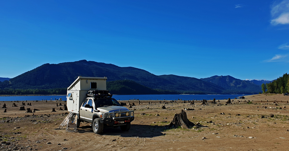 Zurück auf der I-90 führt uns die Strasse nach der Überquerung des Columbia River zunächst durch die Prärie und dann ins Kaskaden-Gebirge, wo wir am Kachess Lake (wieder ein Stausee) einen Platz zum Stehen finden. Da hier die ganzen Waldwege für ATVs gesperrt sind und es in dieser Gegend offenbar keine Trails gibt, wird das trockene Seeufer genutzt, um Motocross-Töff und ATV zu fahren. Auch wenn uns der Lärm nervt, haben wir doch ein gewisses Verständnis…