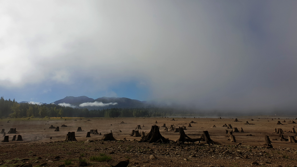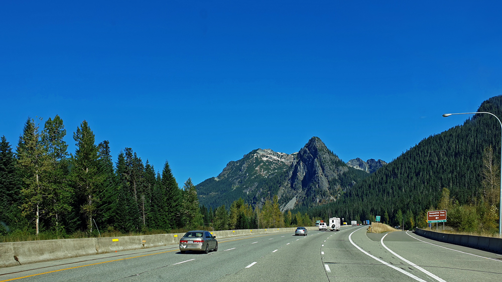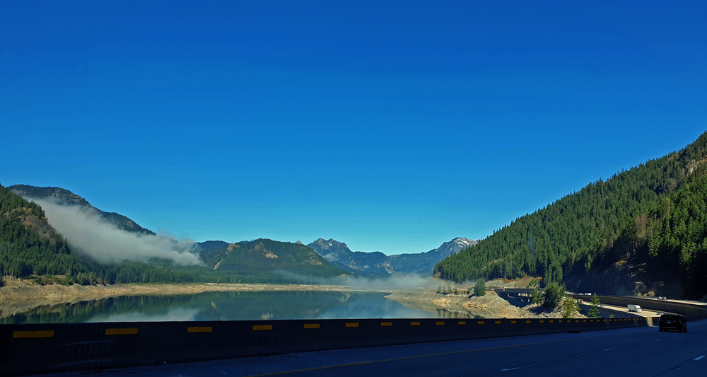 Am nächsten Morgen wachen wir in dichtem Nebel auf, der zusammen mit den vielen Baumstümpfen am Seeufer für eine unwirkliche Stimmung sorgt. Zum Glück lichtet er sich bald wieder und nach einem kurzen WC-Besuch im Lake Easton State Park, wo das erste Mal von einem Ranger unser Jahrespass für die Washington SPs kontrolliert wird, folgen wir der I-90 durch die Berge und über den Snoqualmie Pass.