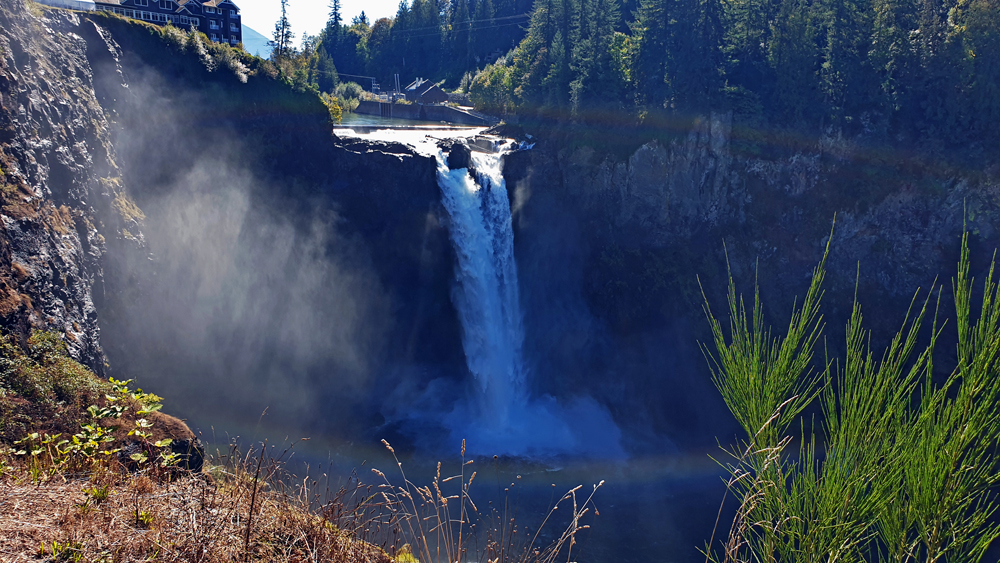 Wieder im Tal machen wir einen Abstecher zu den Snoqualmie Falls. Obwohl ein Teil des Wassers zur Elektrizitätsgewinnung abgezweigt wird und der Fluss jahreszeitbedingt nur wenig Wasser führt, ist der Anblick des sich über eine 82 m hohe Kante in eine schmale Schlucht stürzenden Wassers immer noch sehr beeindruckend. Nachdem wir uns genug eingenebelt haben, machen wir uns auf die Suche nach einem Übernachtungsplatz. Das stellt sich als sehr schwierig heraus, da fast alle Waldstrassen innerhalb der umliegenden State Forests mit Barrieren abgesperrt sind. – Wir sind hier wohl schon zu nahe an der dicht besiedelten Küstenebene um Seattle und Tacoma…