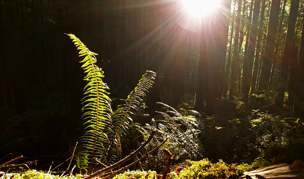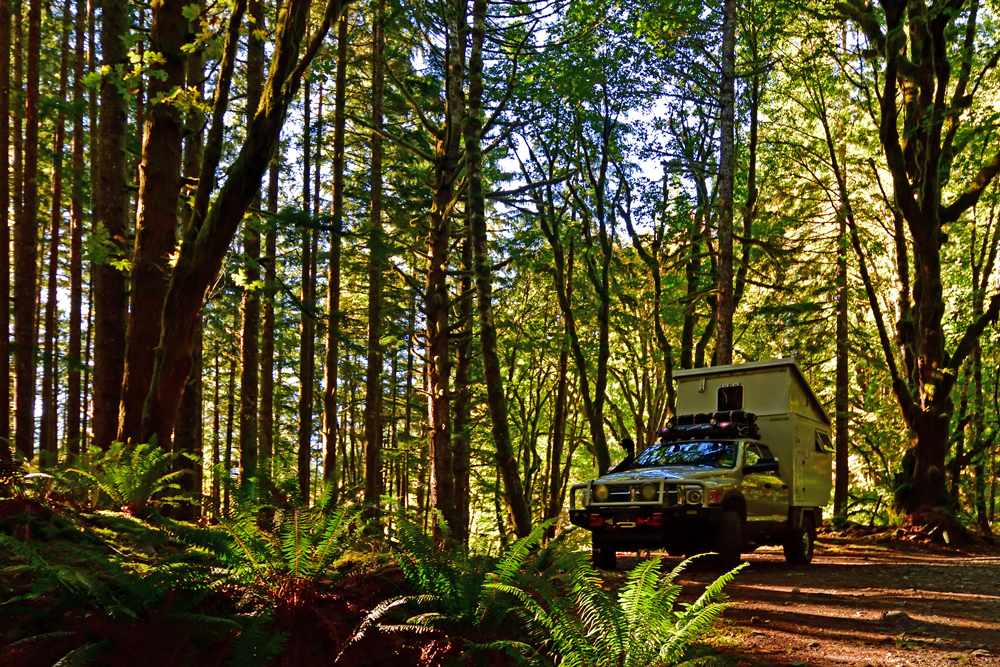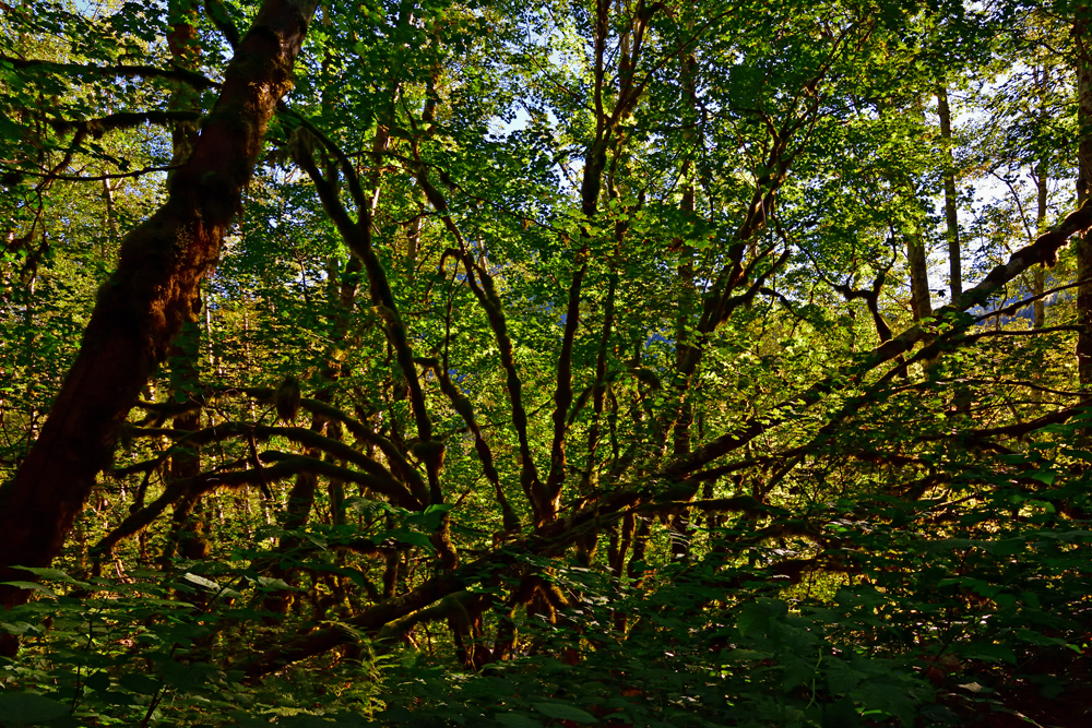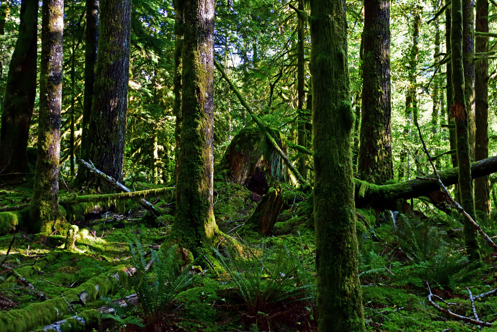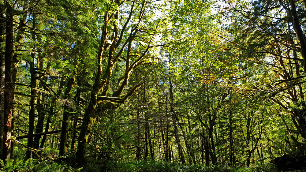 Schliesslich finden wir dann doch noch eine Strasse, die uns zu einer weiteren Strasse führt, die ein paar Ausstellplätze hat (ironischerweise landen wir auf einem Platz, der bereits in iOverlander eingetragen gewesen wäre). Bereits die Suche hat sich gelohnt, befinden wir uns doch auf der Westseite des Kaskadengebirges im Regenwald! Alles ist grün – die Bäume (natürlich), die moosbewachsenen und flechtenbehangenen Stämme und Äste, der mit hohen Farnen bestandene Boden und sogar das Licht, das da und dort durch das Blätterdach dringt. Die Vegetation ist so, dass man Affengekreisch und das Zwitschern und Singen tropischer Vögel erwarten würde. Im Gegensatz zum tropischen Regenwald ist es hier aber fast unheimlich still und wir hören nur das gelegentliche Tropfen von Wasser und manchmal ein verstohlenes Rascheln.