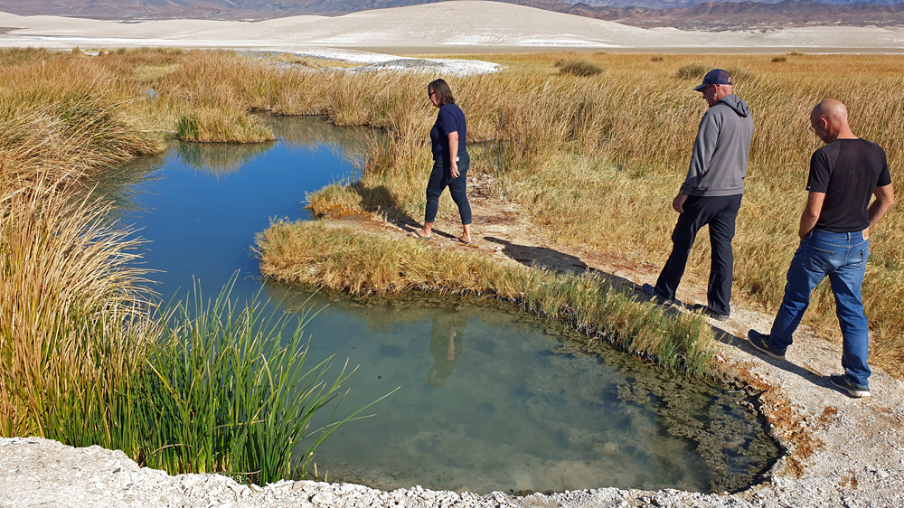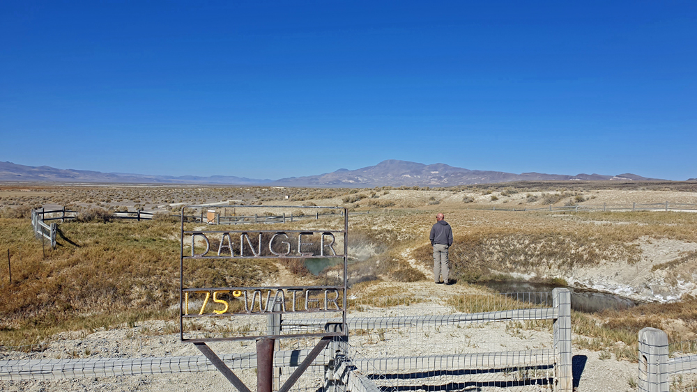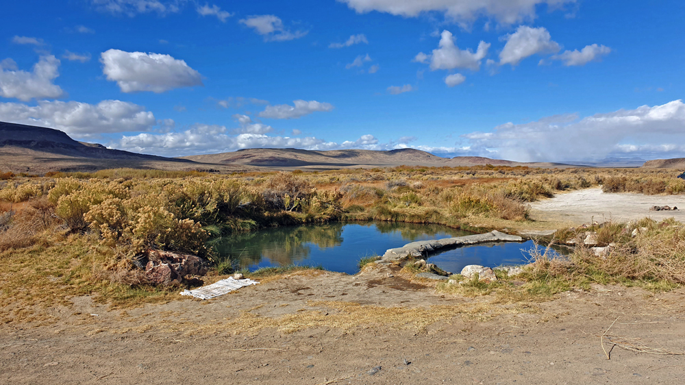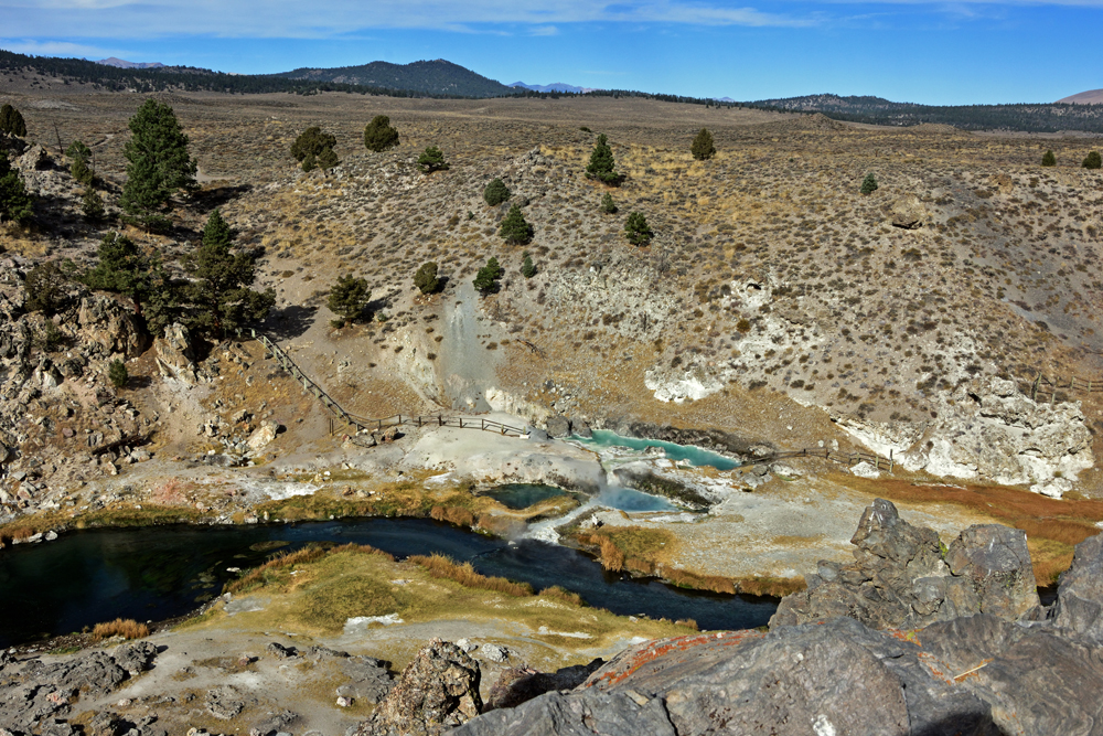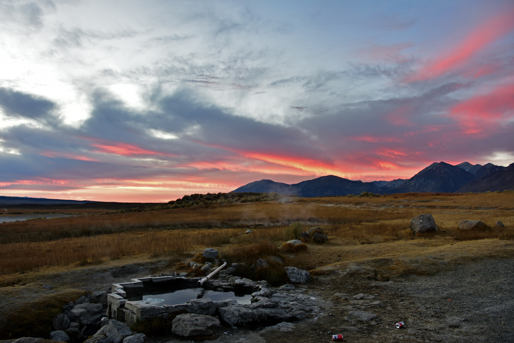 Aufgrund des Umwegs über die CA-120 gelangen wir «von hinten» über kleine Staubpisten ins Geothermalgebiet bei Mammoth Lakes, das inmitten der Long Valley Caldera liegt. Der ganze Talgrund ist gespickt mit heissen Quellen, die teilweise gefasst sind; einige lassen sich direkt anfahren, andere können nur zu Fuss über lange Bohlenwege erreicht werden. Wir klappern ein paar der bebadbaren Quellen ab, die teils schon (zu) gut besetzt sind, und finden dann doch noch ein Plätzchen bei den Shepard (auch Shepherd) Quellen, wo wir zwischendrin auch ein heisses Bad ergattern können.