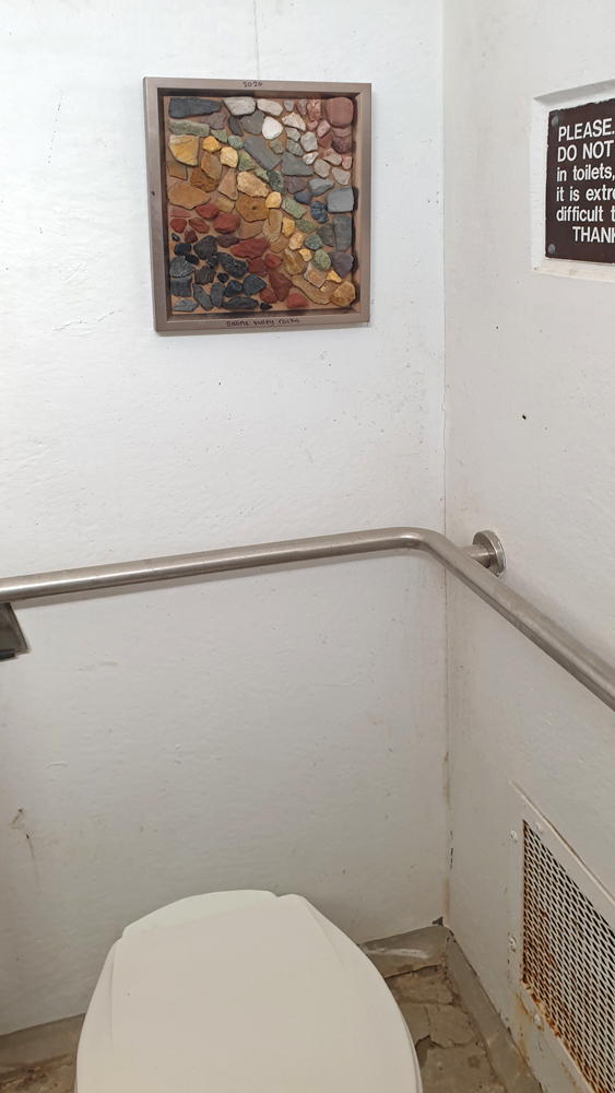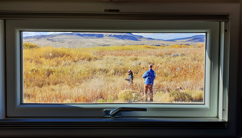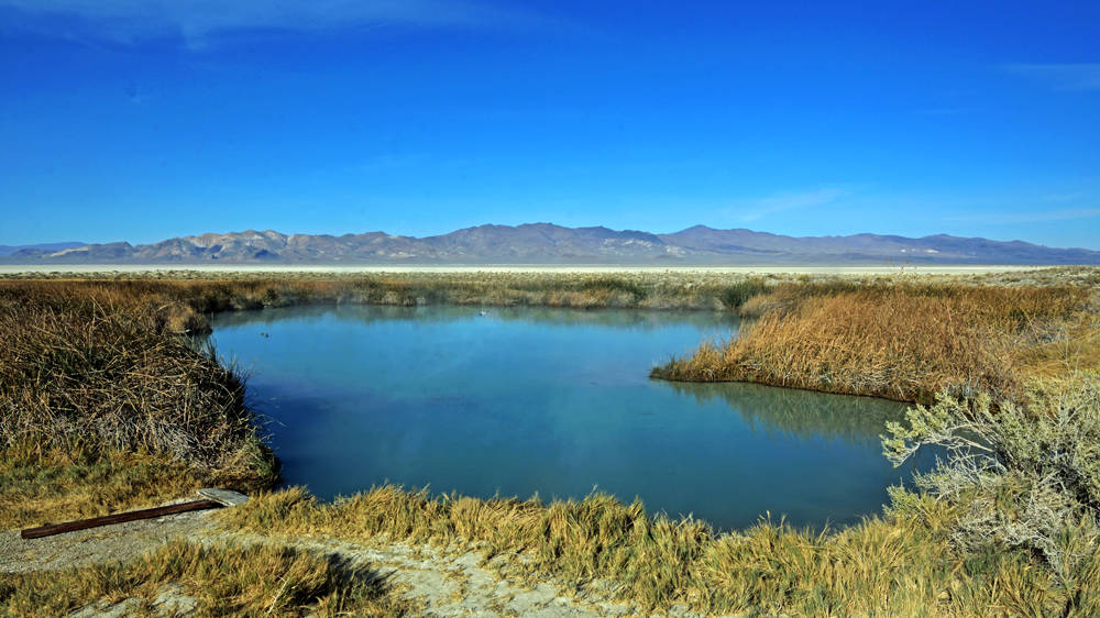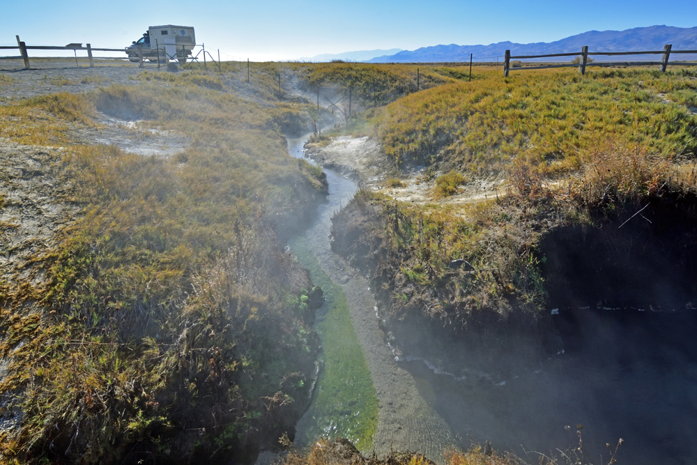 Andere Quellen hätten angenehmere Temperaturen, aber wir erleben wieder einmal eine Kältewelle und hier, auf einer Höhe von über 1’000 m ist es um 11 Uhr aktuell -4 °C (minus vier Grad)! Zudem geht ein kräftiger Wind, der uns das Baden vergällt. Ich wage mich am morgen früh, als wenigstens der Wind etwas eingeschlafen ist, trotzdem noch in die grosse Black Rock Spring, und geniesse zusammen mit einigen Enten das opak blau schimmernde heisse Wasser.