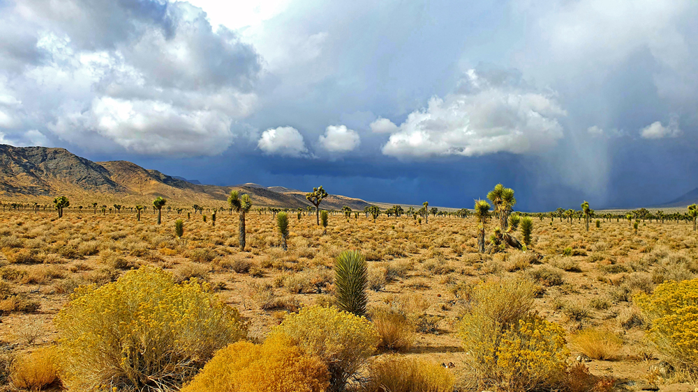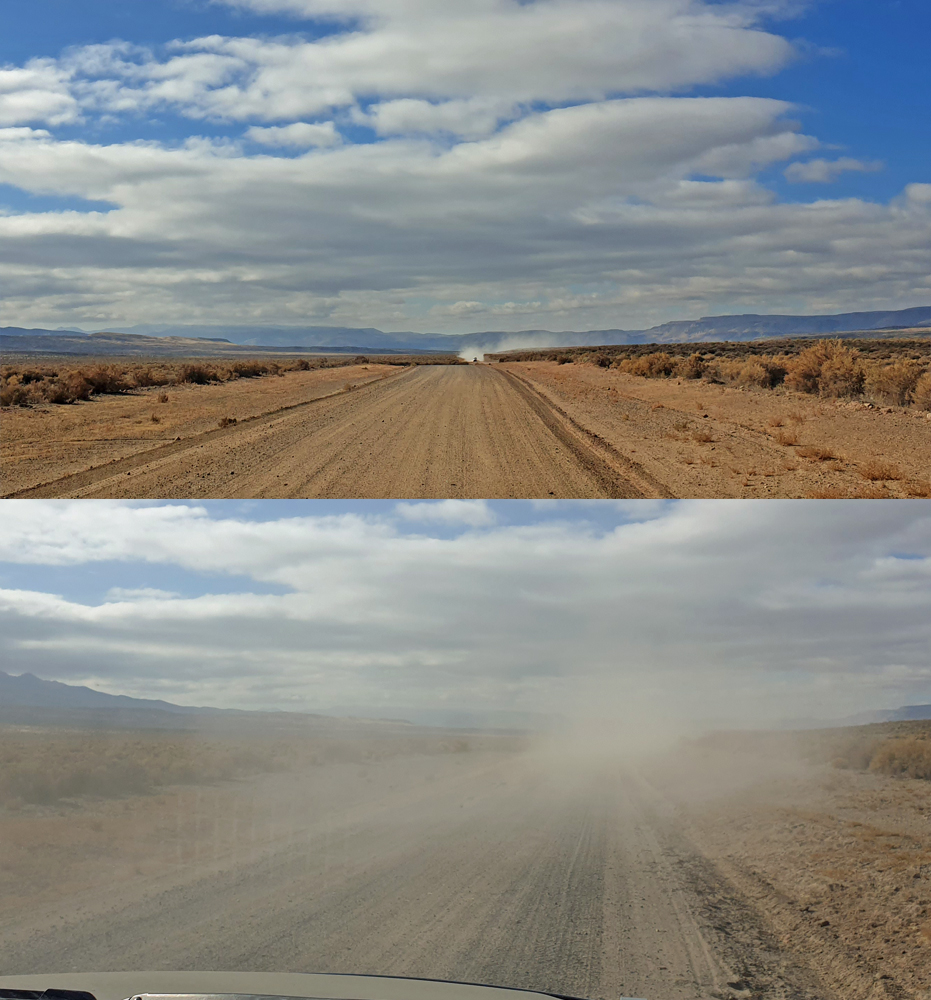 Nachdem wir seit Washington sehr kalt hatten, hat das Wetter wieder umgeschlagen. Temperaturen von 30 Grad sorgen dafür, dass wir dem Schatten nach um die Autos rotieren. Das Wetter verschlechtert sich dann aber wieder, es kommt ein Sandsturm und über den umliegenden Bergen sehen wir dichte Regenschleier.