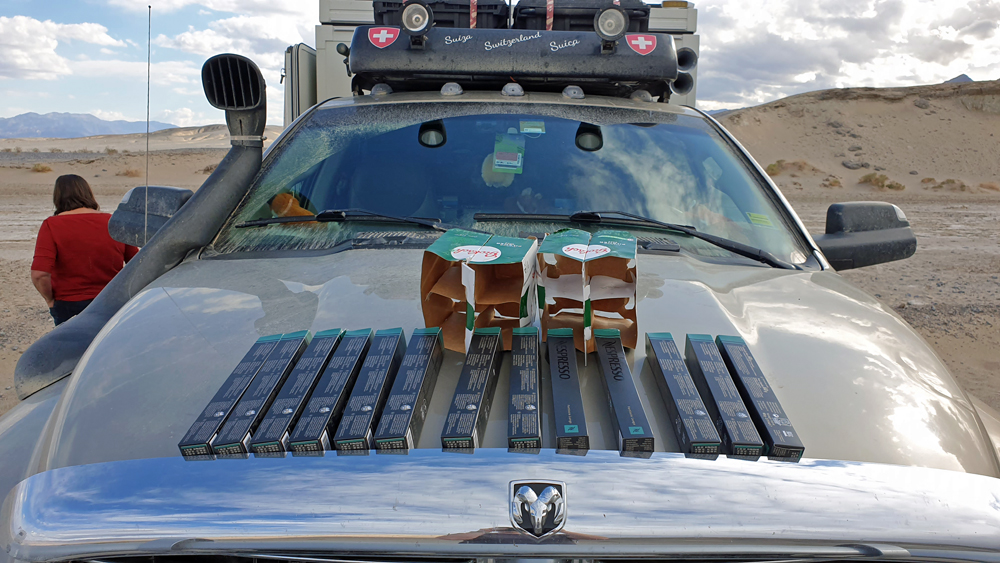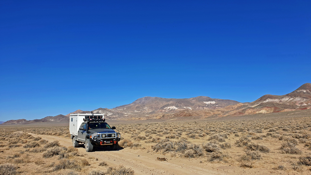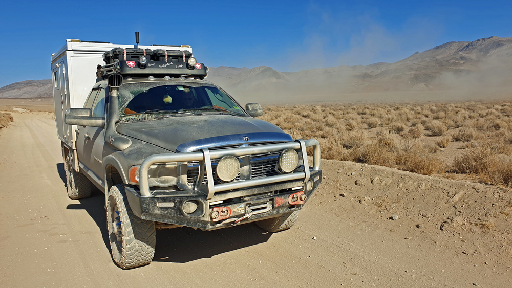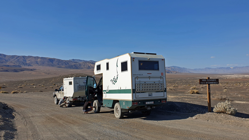 Als wir dann endlich an den oberen Quellen eintreffen, hören wir ein «Klonk», als das D-Hai über den Absatz bei unserem Lagerplatz fährt. Am nächsten Morgen stellt sich heraus, dass das Geräusch von einem vorderen Bremsbelag stammte, der aus seiner Halterung gefallen war! Und wir sind hier über 100 km über anspruchsvolles Terrain vom nächsten grösseren Ort Bishop entfernt…