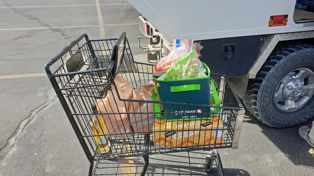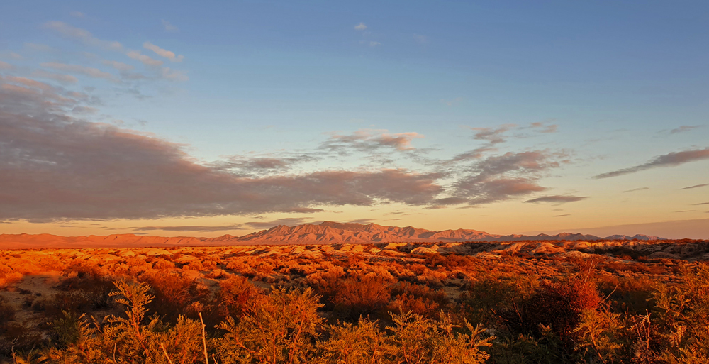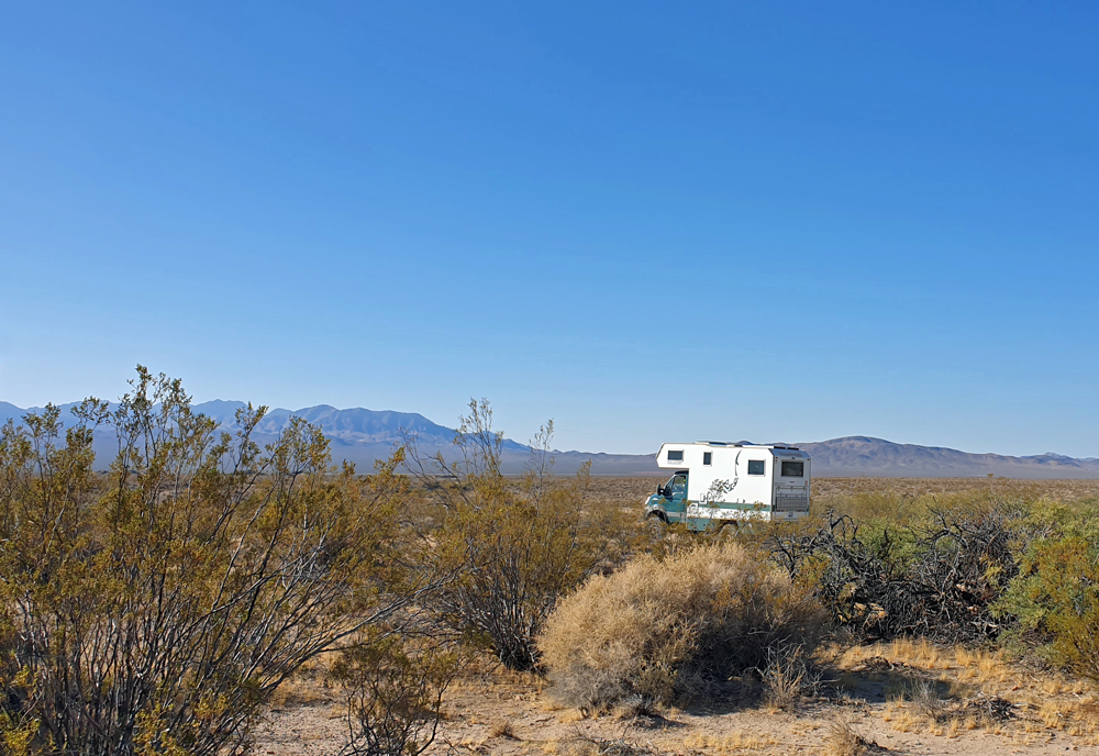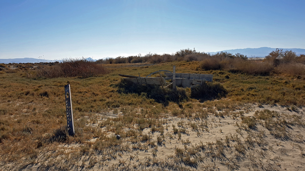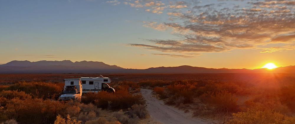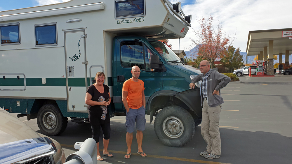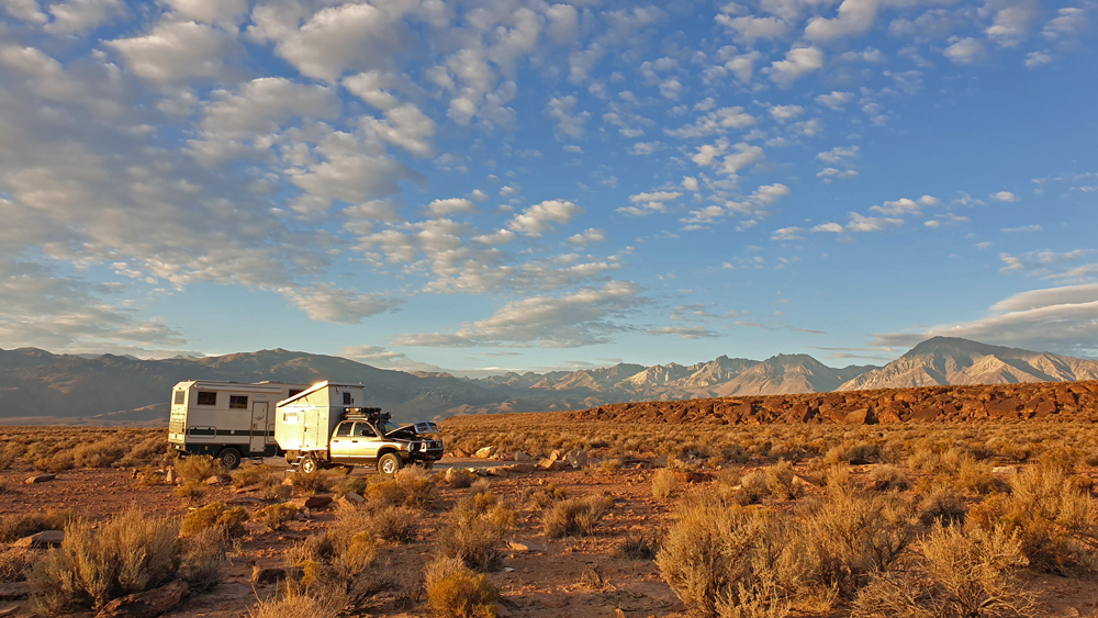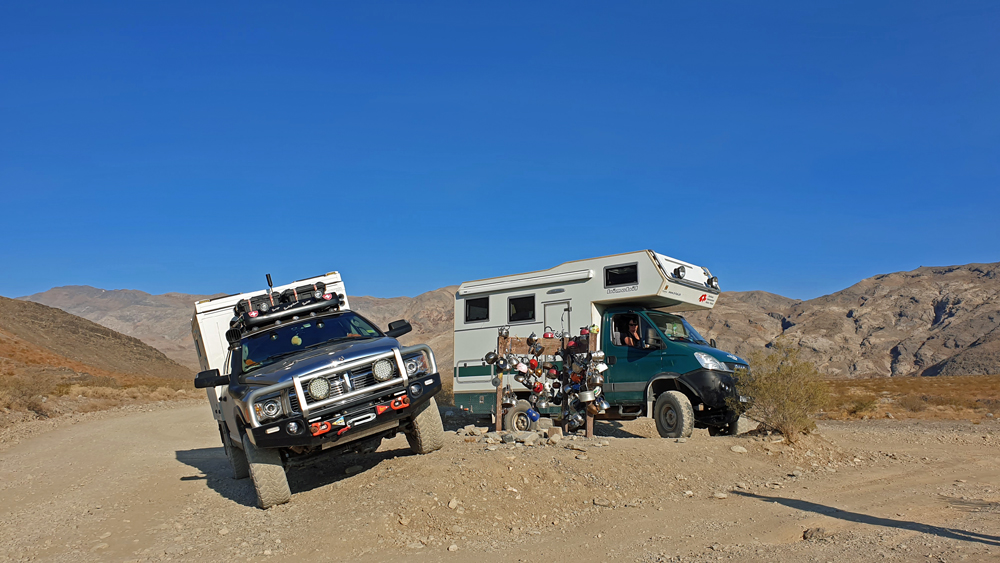 Nun geht es auf der US-395 entlang der Sierra Nevada mit ihren schroffen Spitzen und gelben Bäumen im Talgrund bis nach Bishop, wo wir auf dem Supermarkt-Parkplatz bald das D-Hai von Sibylle und Hermann erspähen. Die Wiedersehensfreude ist gross und es werden bereits vor Ort viele Neuigkeiten ausgetauscht. Wir beschliessen, am nächsten Morgen zusammen ins Death Valley zu fahren und dieses einige Tage zusammen zu erkunden. Annens kennen die Gegend noch nicht und wir freuen uns darauf, Ihnen unsere favorite spots zeigen zu können. Zunächst einmal gibt es allerdings einen Grosseinkauf, damit wir uns für einige Zeit in die Wüste zurückziehen können. Erschöpft vom Shopping und voller Vorfreude auf weiteren Austausch schlagen wir unser Camp dann gleich in den nahegelegenen Hügeln auf.