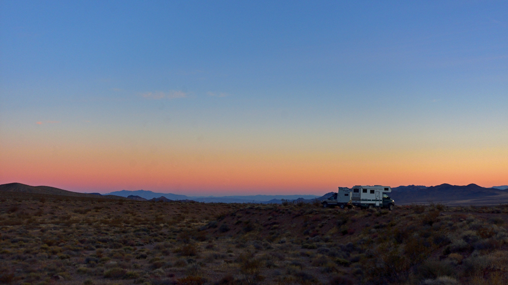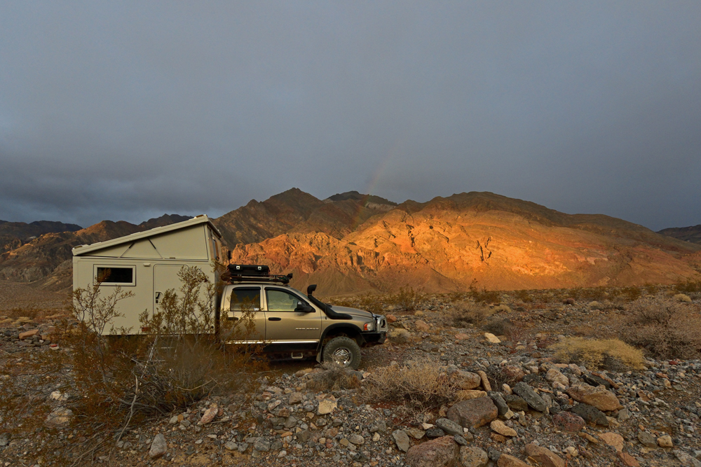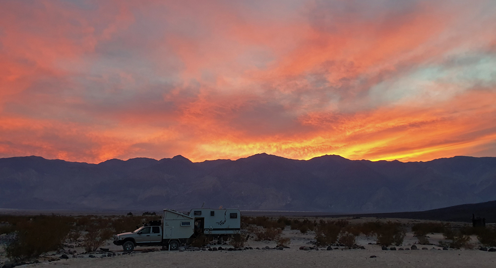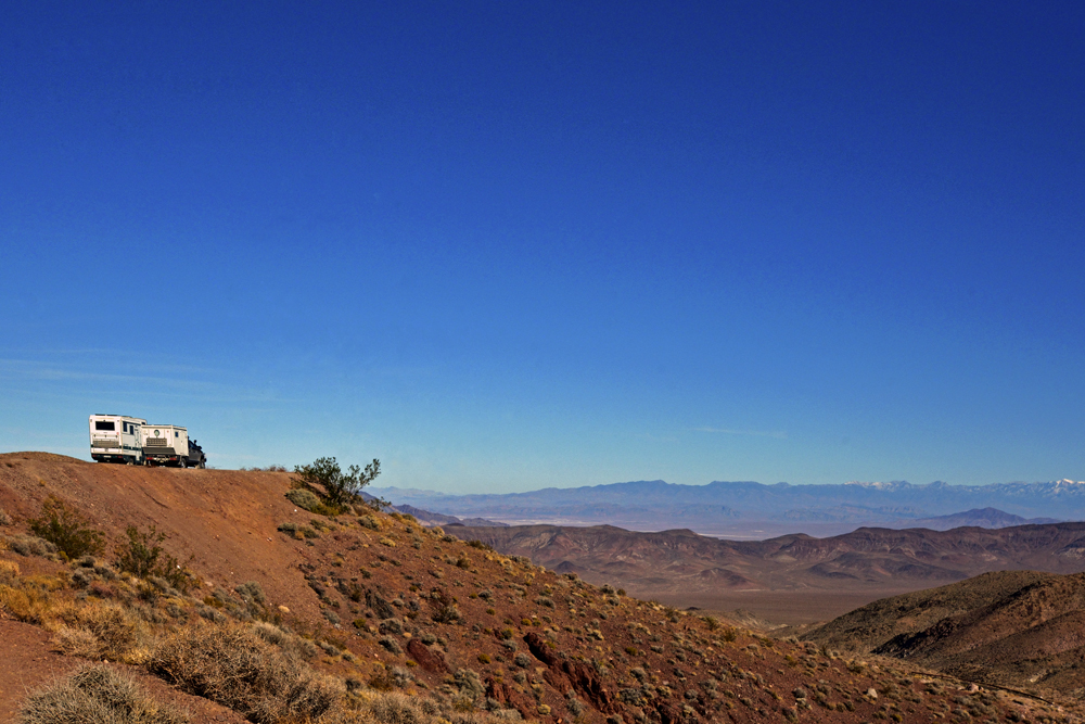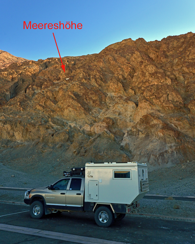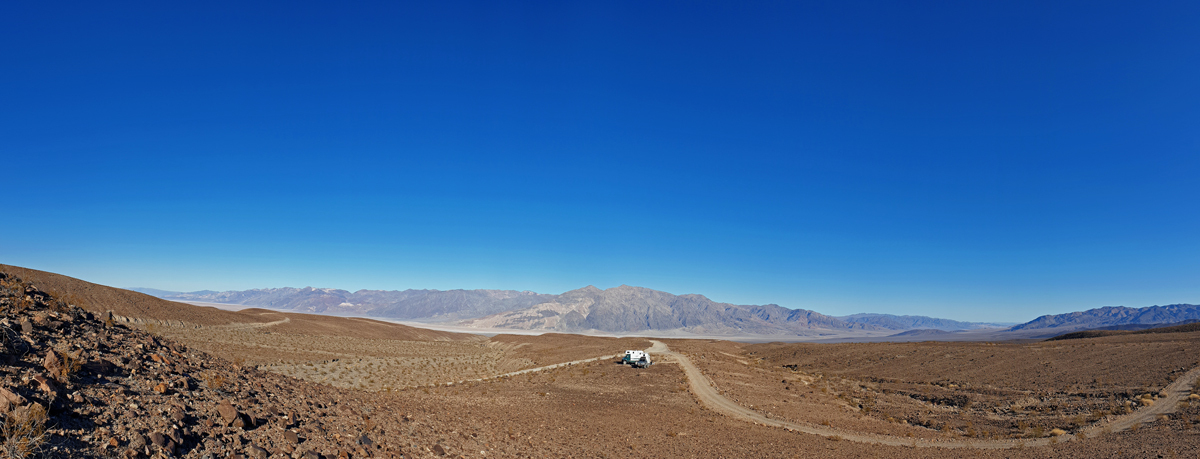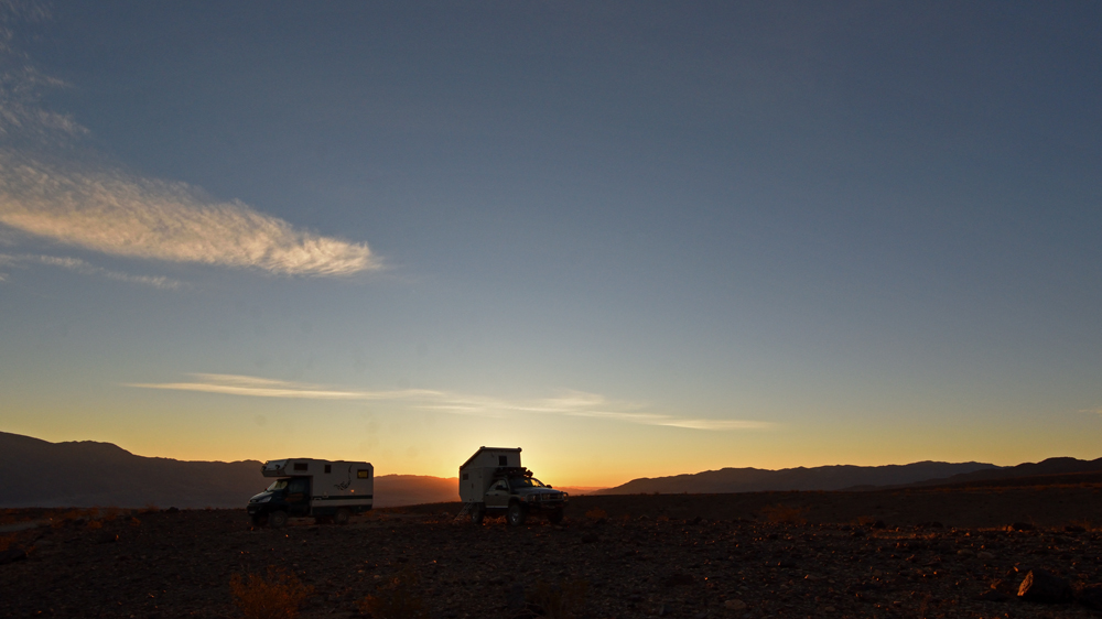 Wir hatten uns überlegt, bei den Warm Springs im gleichnamigen Canyon das Lager aufzuschlagen, aber da es eine rumpelige Sackgasse ist (zumindest für uns nicht ganz Rubicon-Trail-tauglichen Fahrzeuge), machen wir es uns am Eingang des Canyons bequem und geniessen die Sicht aufs Death Valley.