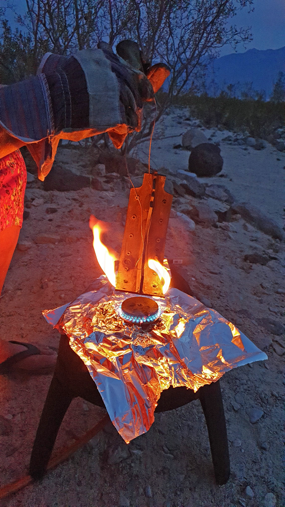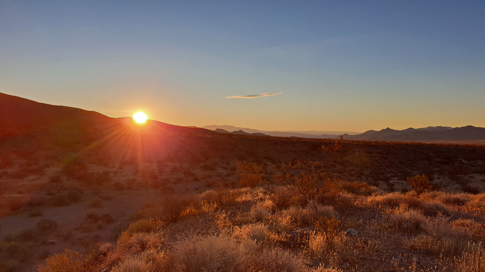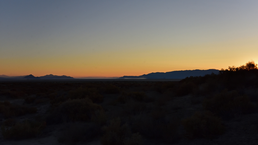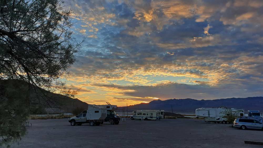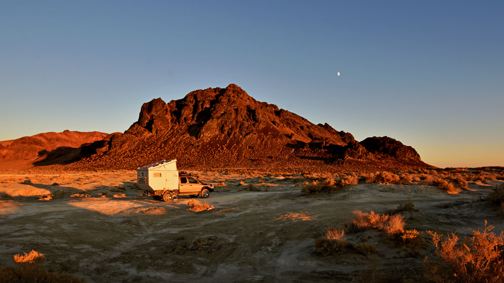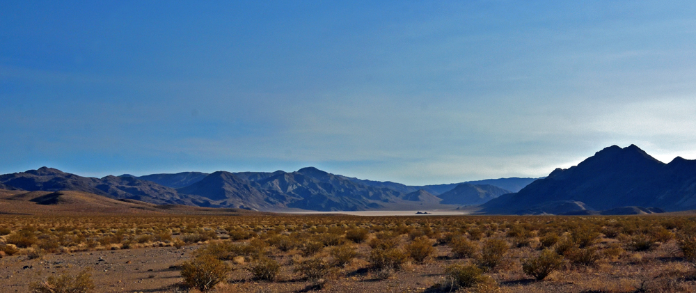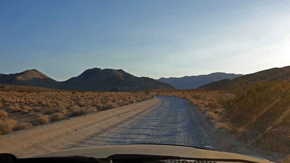 Wir hatten uns überlegt, bei den Warm Springs im gleichnamigen Canyon das Lager aufzuschlagen, aber da es eine rumpelige Sackgasse ist (zumindest für uns nicht ganz Rubicon-Trail-tauglichen Fahrzeuge), machen wir es uns am Eingang des Canyons bequem und geniessen die Sicht aufs Death Valley.