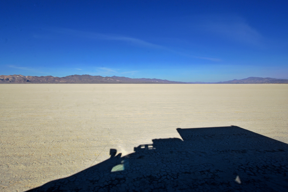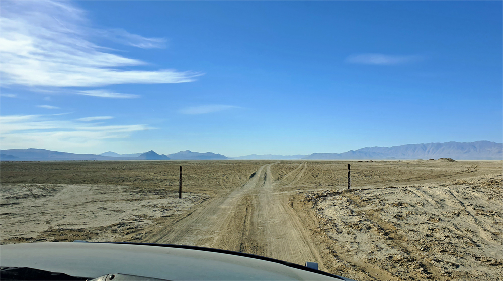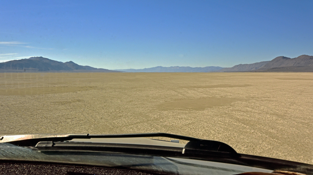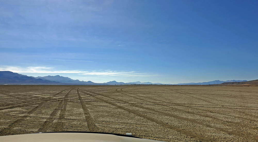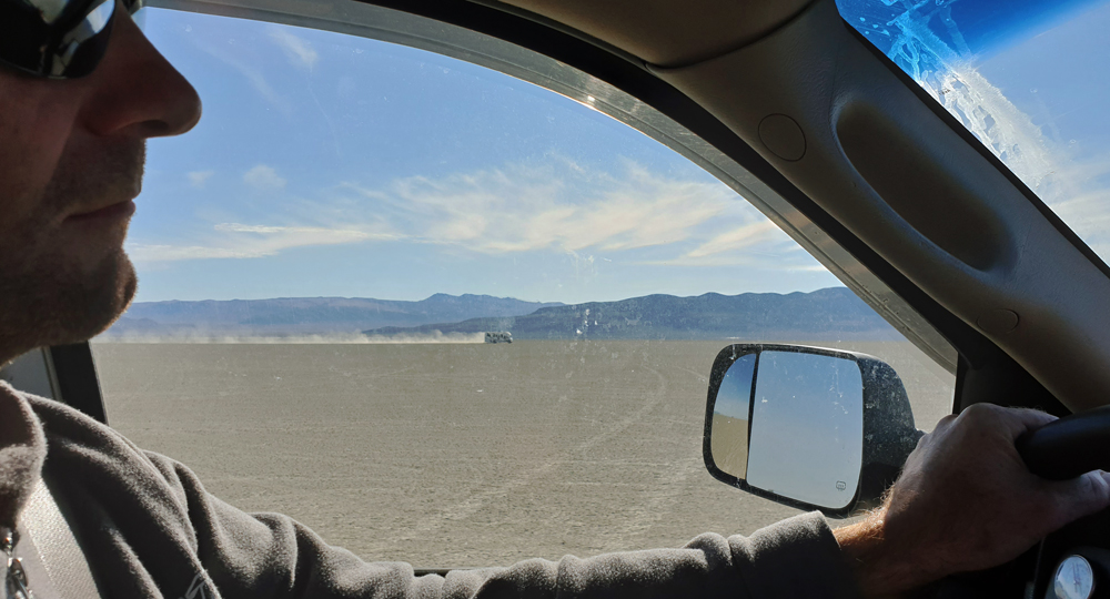 Die Fahrt auf der Playa ist rasant und sehr eindrücklich, zumal die anfänglich vorhandenen Spuren teils komplett verschwinden. Wir verpassen zunächst die Ausfahrt, aber Ozy bemerkt rechtzeitig, dass der Silt gegen Gerlach hin immer weicher wird, und kann in einem Bogen zum Ausstieg fahren, bevor wir unser Fahrzeug versenken.
