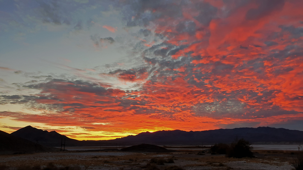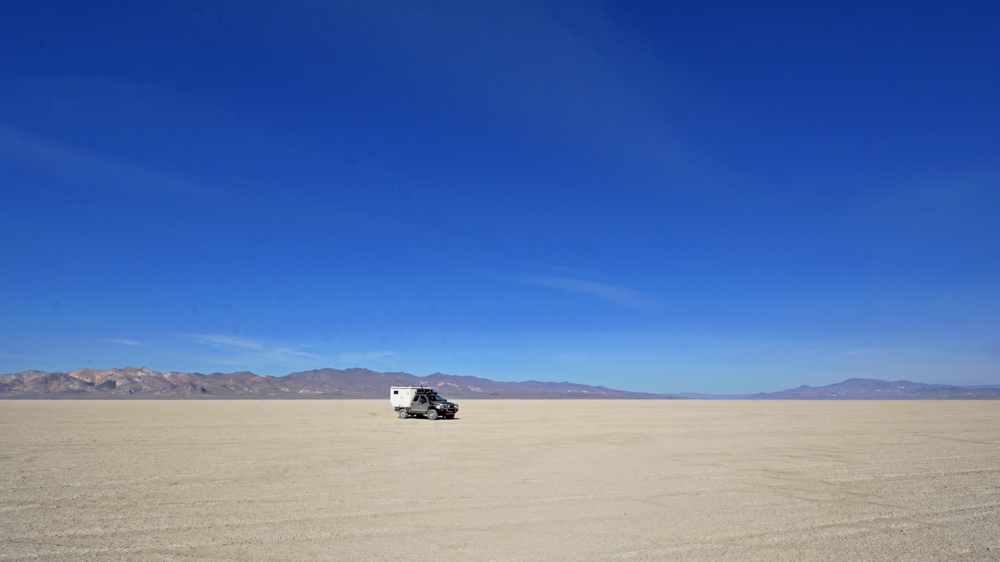 Aber auch ohne extensiven Badespass ist die Gegend sehr beeindruckend. Rundum erheben sich vielfarbige Berge und Hügel, die eine riesige, 160 km lange Playa einfassen. Auf dieser Salztonebene wird jährlich das Burning Man Festival abgehalten (ausser natürlich in diesem COVID-Jahr…), wofür jeweils eine kleine Stadt entsteht, die danach wieder komplett abgebaut wird. Wenn wir die «Strassen» dieser riesigen kreisförmigen Struktur nicht auf unserem Navi gesehen hätten, hätten wir gar nicht gemerkt, dass wir mitten hindurch bzw. darüber hinweg fahren!