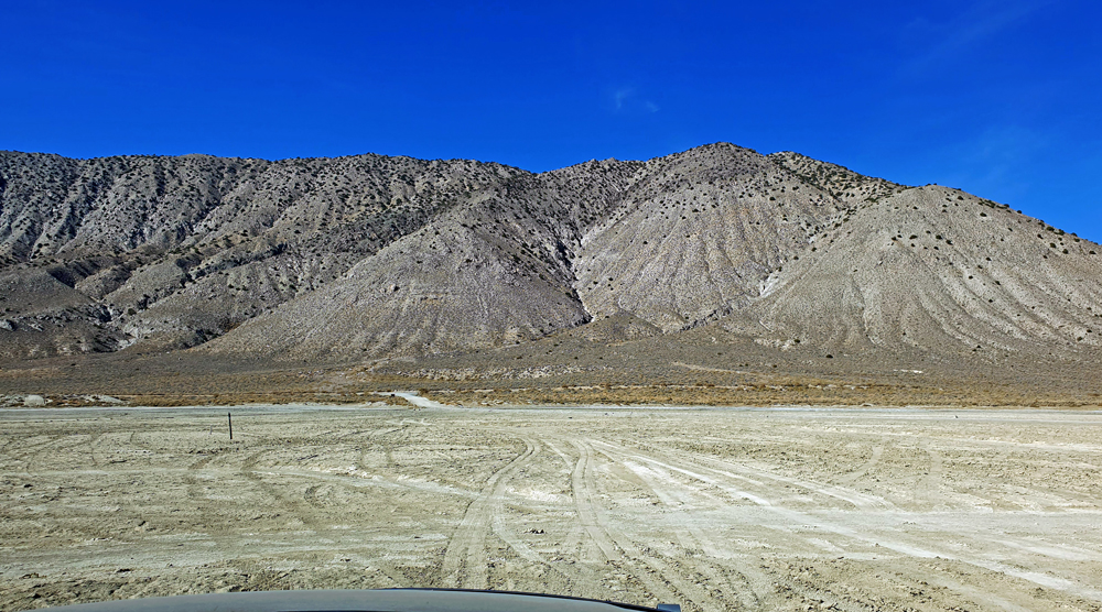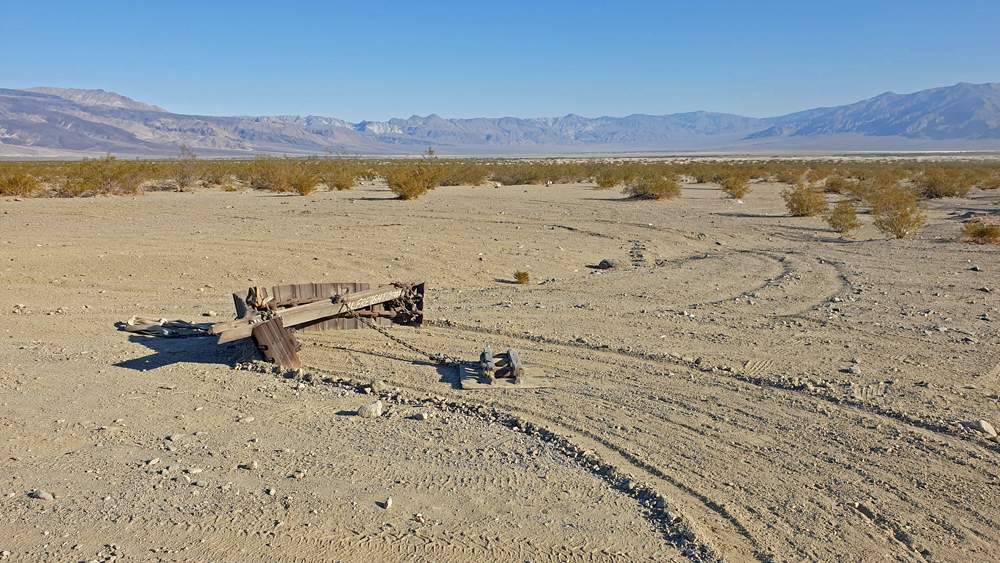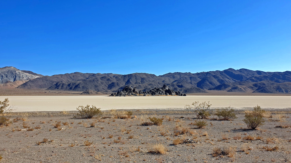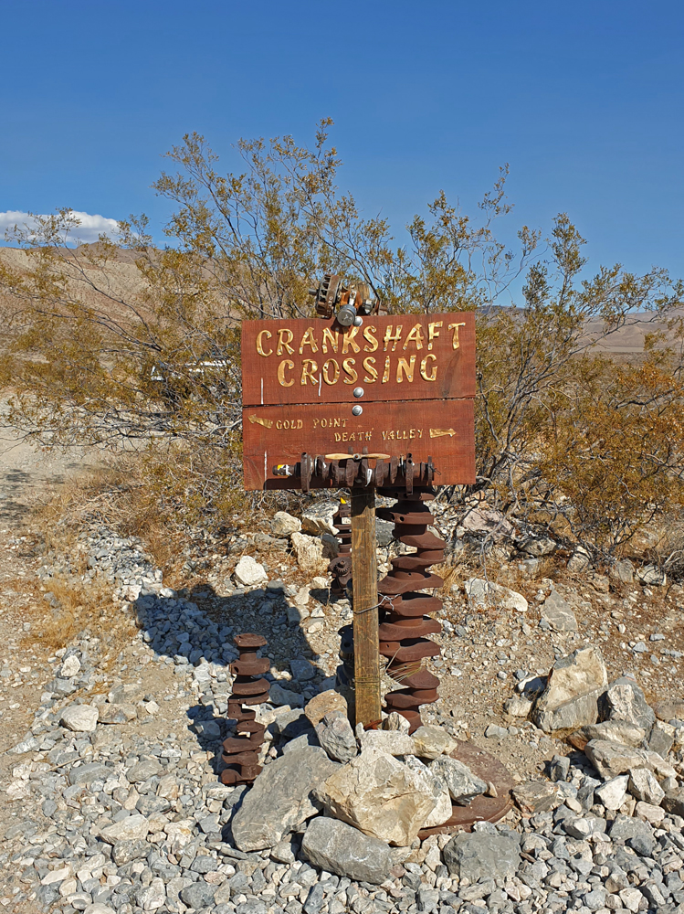 Wir passieren zunächst die Crater-Schwefelmine, die – mittlerweile mit einem neuen Schild ausgestatteten – Crankshaft Crossing und den Ubehebe Crater. Mittlerweile ist es 30 Grad warm und Ozy und Hermann kommen ins Schwitzen, als sie am Anfang der Racetrack Road extra viel Luft ablassen. Nachdem wir D-Hais ganz viel über die legendär schlechte Piste erzählt haben, ist sie dieses Mal aber viel weniger schlimm als 2015 und  2016/17, wo wir mit einem Mietwagen sogar umkehren mussten.
