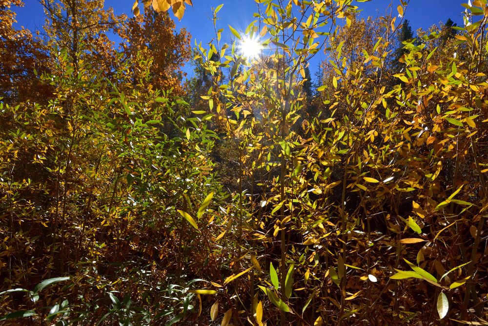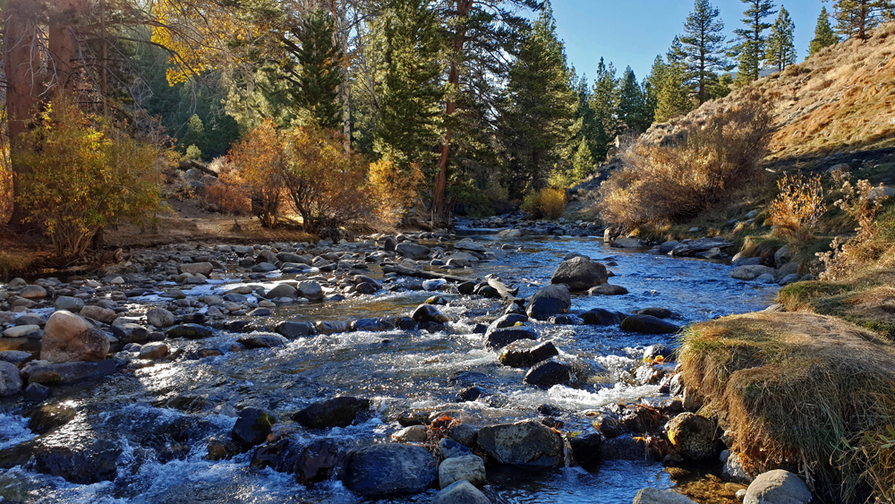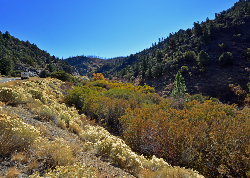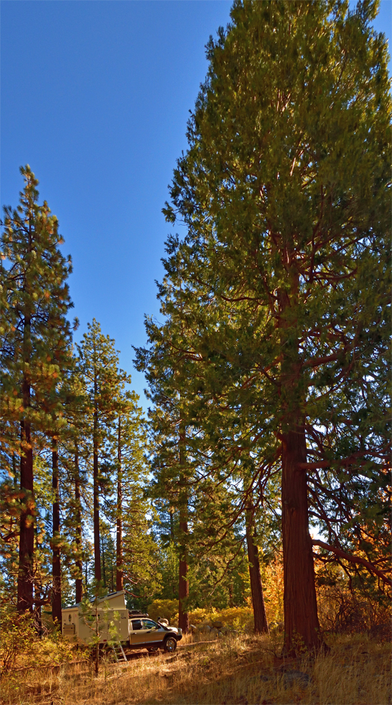 Gut 100 km südlich von Reno finden wir in der Nähe von Alpine Village, CA, ein hübsches Plätzchen am West Fork des Carson River. Wir erfreuen uns an den riesigen Jeffrey Pines und dem herbstlich verfärbten Wald, dessen Blätter im Sonnenlicht golden leuchten.