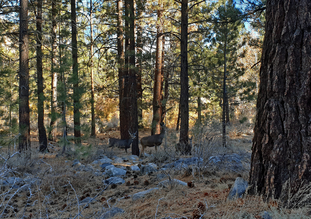 Wir schlagen unser Lager oben auf der anderen Seite des Canyons im Wald auf. Der Vorteil ist, dass der Weg nach unten von hier aus nicht ganz so steil ist, der Nachteil, dass wir jeweils den eisigen Bach durchqueren müssen, um zu den Pools zu gelangen (aber man kann sich ja nachher aufwärmen und nach dem heissen Bad merkt man das kalte Wasser nicht so). Es gefällt uns sehr gut hier. Es ist ruhig, der lockere Wald wunderschön, die Lage der Pools einfach unbeschreiblich und wir können jeden Morgen mehrere kleine Herden gar nicht scheuer Mule Deer beobachten.