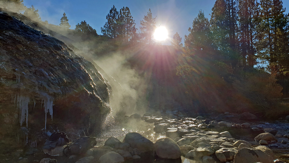 Nicht weit von Bridgeport entfernt liegen die Buckeye Hot Springs, die am Hang eines kleinen, schmalen Canyons an die Oberfläche treten. Zwei kleine Quellen sind gleich oben am Hang gefasst, das meiste Wasser fliesst aber über einen steilen Abhang in ein grosses Becken am Talgrund und von dort in zwei weitere Becken, die entsprechend kühler sind. Wer noch mehr Abkühlung braucht, kann in den gleich daneben fliessenden Buckeye Creek tauchen, der zu dieser Jahreszeit bereits Eisränder hat…