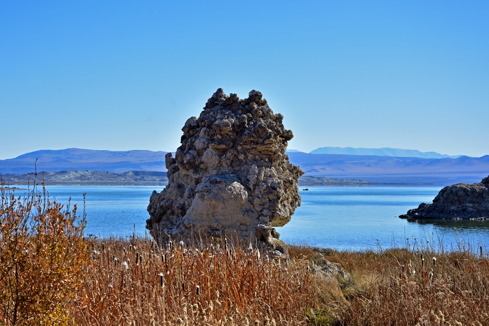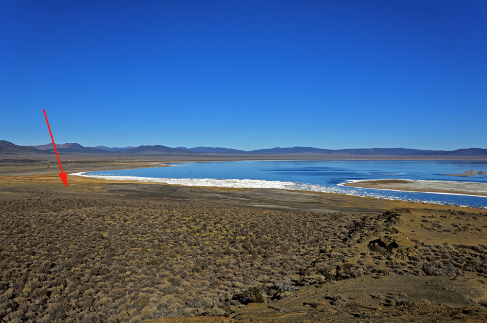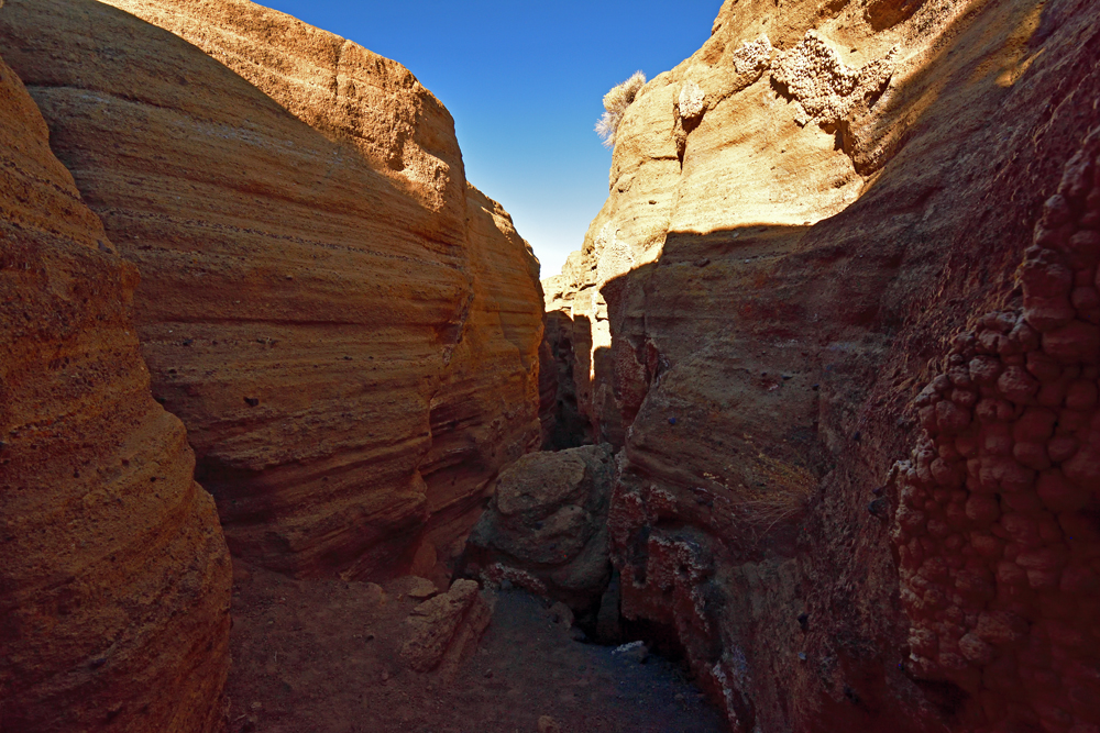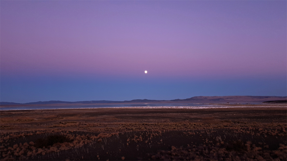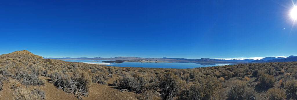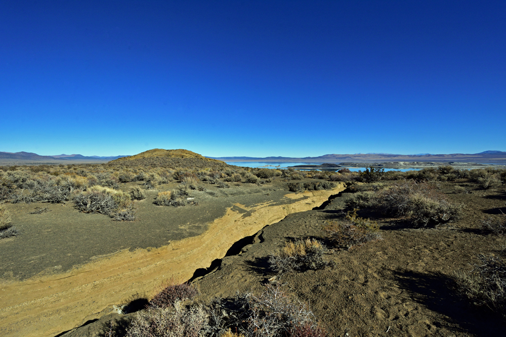Am Mono Lake finden wir einen schönen Stellplatz mit Blick auf den See und seine speziellen Tuff-Formationen (man darf nur oberhalb der früheren Wasserlinie stehen). Wir geniessen die wunderschönen Farben und Lichtstimmungen und können den Fast-Vollmond beobachten, wie er auf der anderen Seeseite langsam über die Bergrücken steigt und sich im Wasser des Sees spiegelt. Am nächsten Tag mache ich allein eine Tour zu den «Black Point Fissures». Das sind Risse und Spalten im Black Point, einem flachen vulkanischen Hügel, die man – ähnlich einem Slot Canyon – begehen kann. Der Aufstieg ist sehr mühsam, weil es einerseits keinen Weg durch das teils stachelige Gebüsch gibt und andererseits die Hügelflanke aus einem feinen Kies besteht, der das Hinaufsteigen nicht gerade erleichtert. Aber ich habe es dann doch geschafft und werde mit einem wunderbaren Blick auf den leuchtend blauen Mono Lake belohnt. Die Spalten sieht man von oben zunächst nicht und ich bin froh um das Satellitenbild von Google Maps, auf dem die Risse zu sehen sind. Ich nehme mir die zwei grössten vor, wobei der erste etwa in der Mitte durch herabgestürzte Seitenwand-Teile blockiert ist und ich wieder umkehren muss. Den zweiten kann ich mit Klettern und mich durch die Spalten-Winden vollständig durchqueren; eine Stelle ist so eng, dass ich den Rucksack ausziehen und separat durch die Spalte bugsieren muss. – ein spannendes Erlebnis!