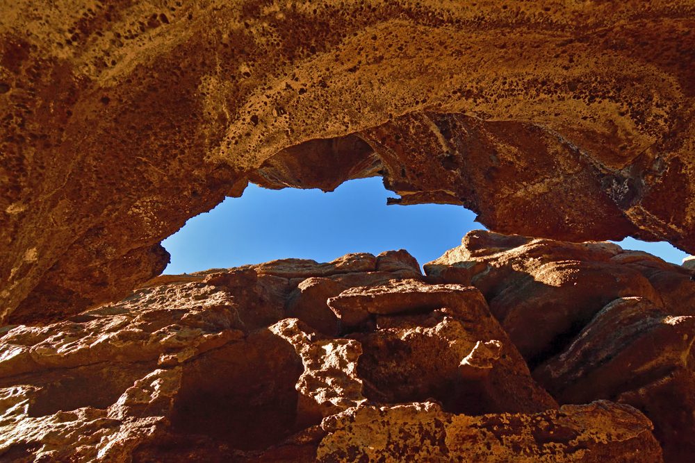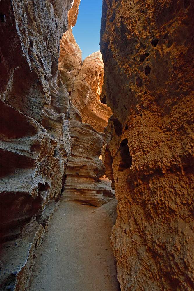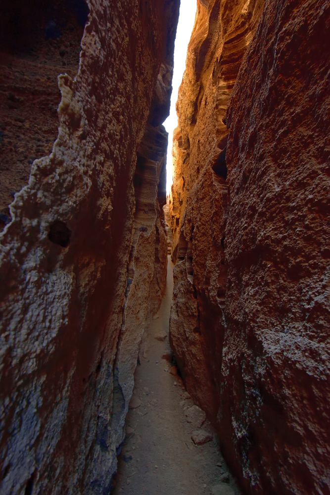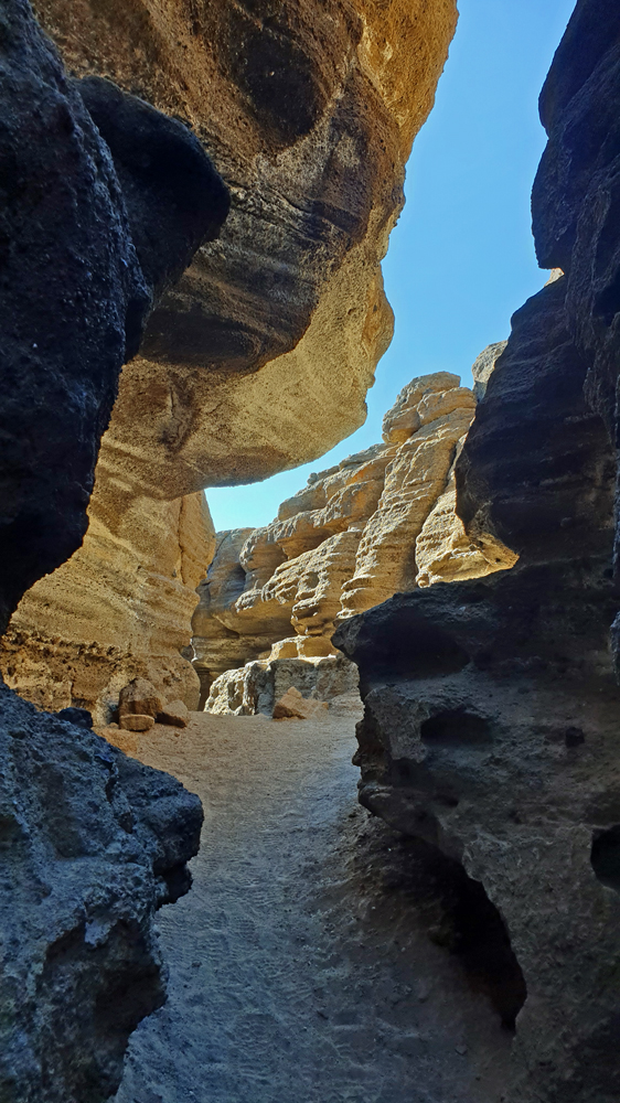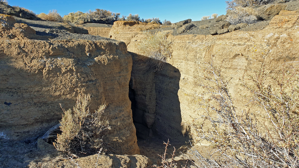Am Mono Lake finden wir einen schönen Stellplatz mit Blick auf den See und seine speziellen Tuff-Formationen (man darf nur oberhalb der früheren Wasserlinie stehen). Wir geniessen die wunderschönen Farben und Lichtstimmungen und können den Fast-Vollmond beobachten, wie er auf der anderen Seeseite langsam über die Bergrücken steigt und sich im Wasser des Sees spiegelt. Am nächsten Tag mache ich allein eine Tour zu den «Black Point Fissures». Das sind Risse und Spalten im Black Point, einem flachen vulkanischen Hügel, die man – ähnlich einem Slot Canyon – begehen kann. Der Aufstieg ist sehr mühsam, weil es einerseits keinen Weg durch das teils stachelige Gebüsch gibt und andererseits die Hügelflanke aus einem feinen Kies besteht, der das Hinaufsteigen nicht gerade erleichtert. Aber ich habe es dann doch geschafft und werde mit einem wunderbaren Blick auf den leuchtend blauen Mono Lake belohnt. Die Spalten sieht man von oben zunächst nicht und ich bin froh um das Satellitenbild von Google Maps, auf dem die Risse zu sehen sind. Ich nehme mir die zwei grössten vor, wobei der erste etwa in der Mitte durch herabgestürzte Seitenwand-Teile blockiert ist und ich wieder umkehren muss. Den zweiten kann ich mit Klettern und mich durch die Spalten-Winden vollständig durchqueren; eine Stelle ist so eng, dass ich den Rucksack ausziehen und separat durch die Spalte bugsieren muss. – ein spannendes Erlebnis!