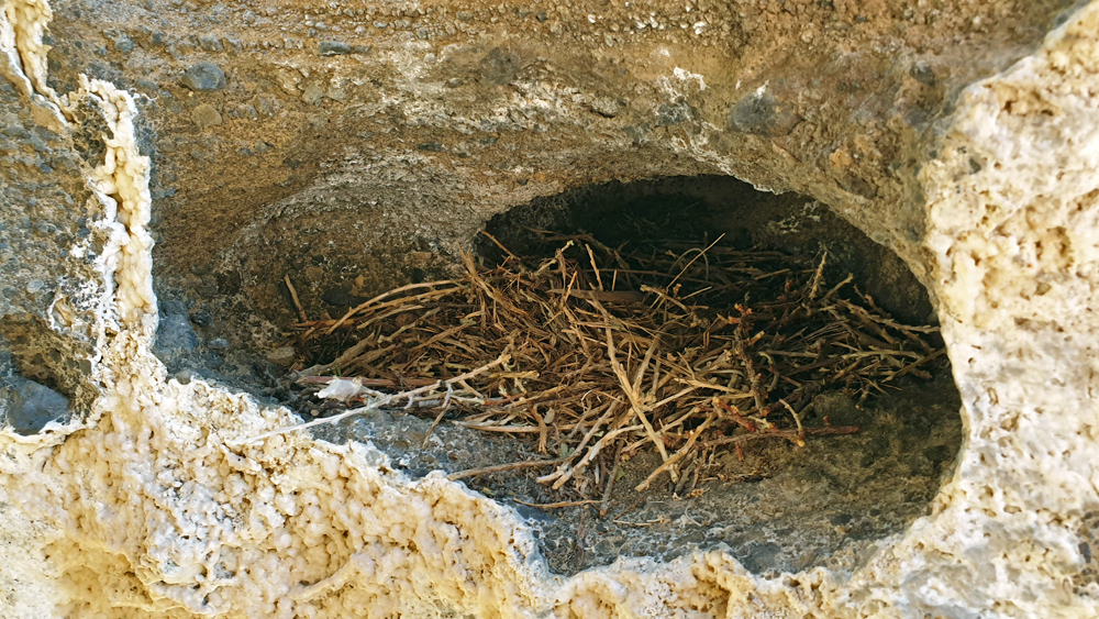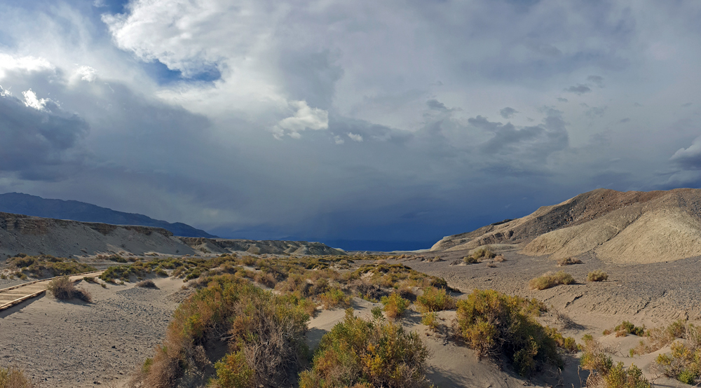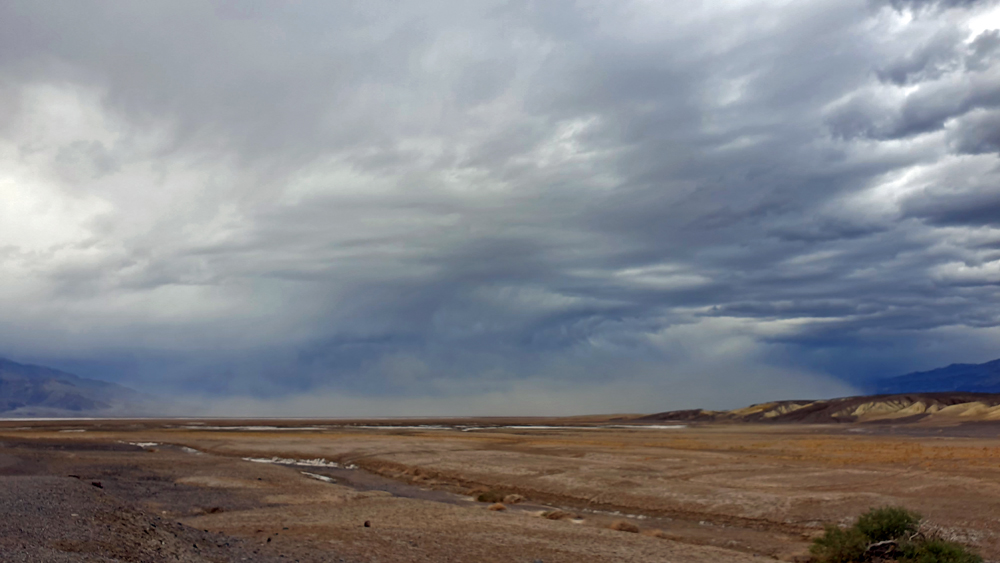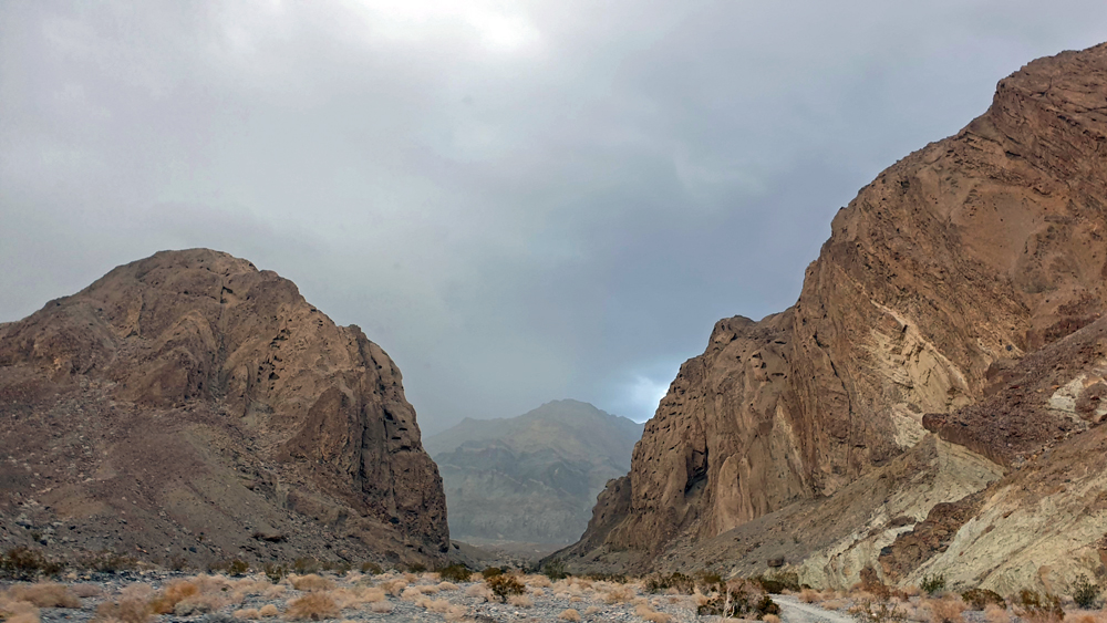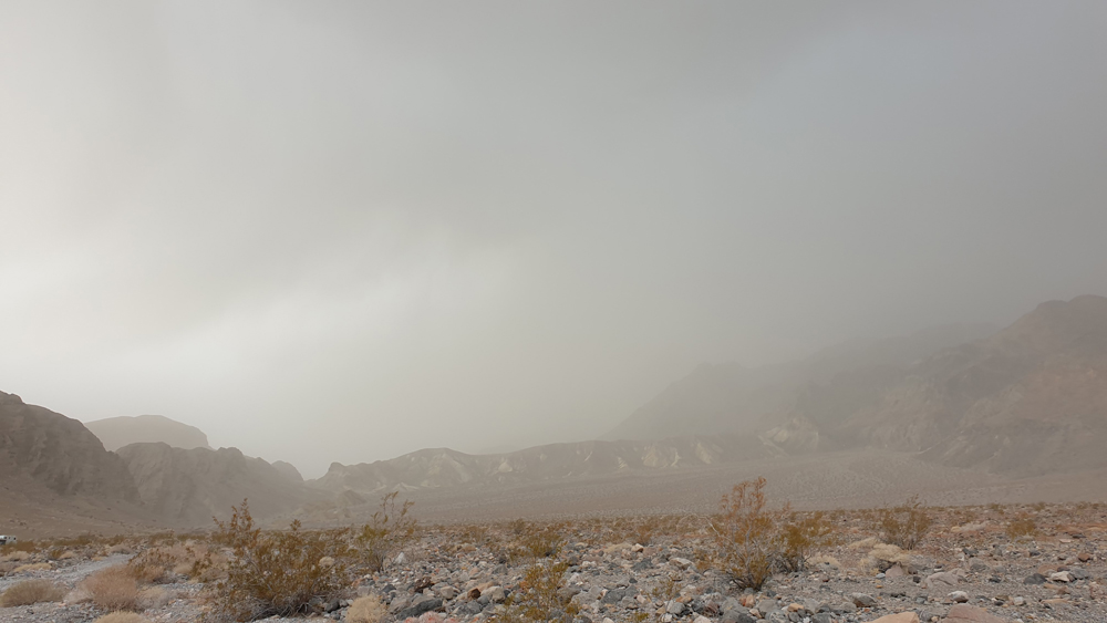 Am nächsten Tag fahren wir in Beatty, NV, vorbei, wo wir im grossen Candyshop ein paar Kleinigkeiten einkaufen, bevor wir es uns im Death Valley beim Salt Creek gemütlich machen, während Sibylle und Hermann den Titus Canyon fahren. Wir entdecken, dass durch das Gerumpel wieder einmal ein paar Büchsen undicht geworden sind – zum Glück Sprite light, das weder Flecken verursacht, noch alles verklebt. Trotzdem müssen wir die Sitzbänke ausräumen und die durchweichten Nespresso-Schachteln trocknen. Als Sibylle und Hermann kommen, machen wir zu dritt einen Spaziergang zum Salt Creek und legen dann auch bei den Harmony Borax Works einen kleinen Stopp ein. Die Wolken werden immer dunkler, der Wind frischt auf und wir sehen, dass eine grosse Staubwand auf uns zukommt – nichts wie ins Auto! Wir fahren vor dem Sandsturm her und biegen zum Hole in the Wall ab, wo wir die Nacht verbringen wollen. Es hat schon einige Camper in der Gegend (die meisten Campgrounds sind wegen Covid geschlossen bzw. überfüllt) und wir suchen eine Weile, bis wir einen Platz finden, wo wir das Gefühl haben, nicht gleich weggeschwemmt zu werden, falls es heftigere Niederschläge geben sollte. Es tröpfelt aber nur ein bisschen, gerade genug, um das Auto so richtig dreckig zu machen… Irgendwie regnet es immer, wenn wir im Death Valley sind und wir fragen uns langsam, ob das mit dem «hottest, dryest place» nur ein guter Slogan für die Touris ist… 😉