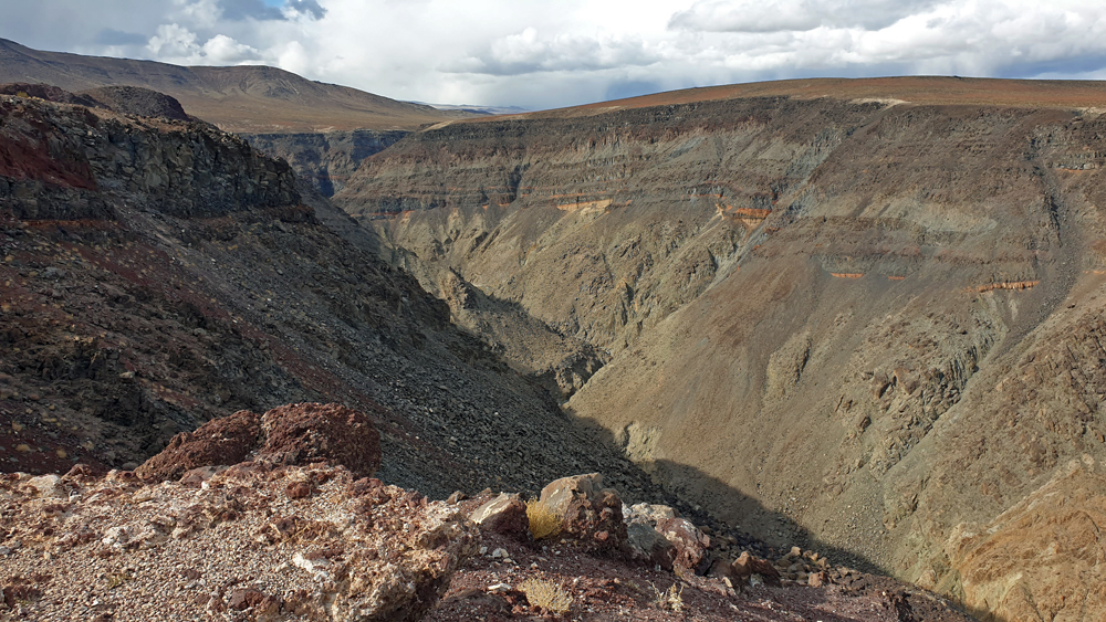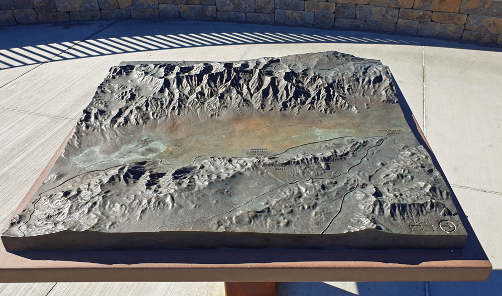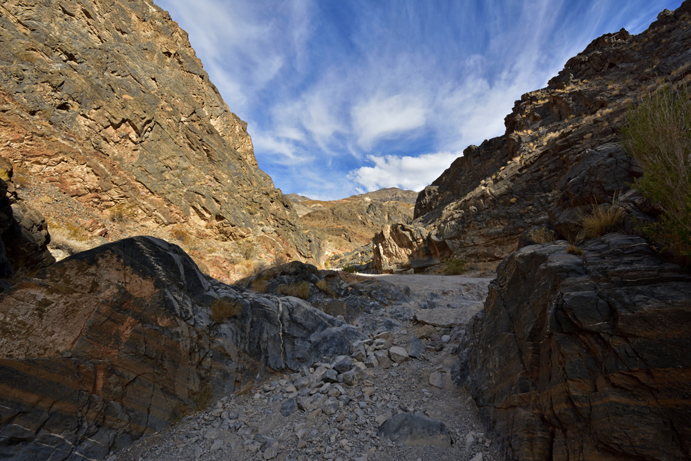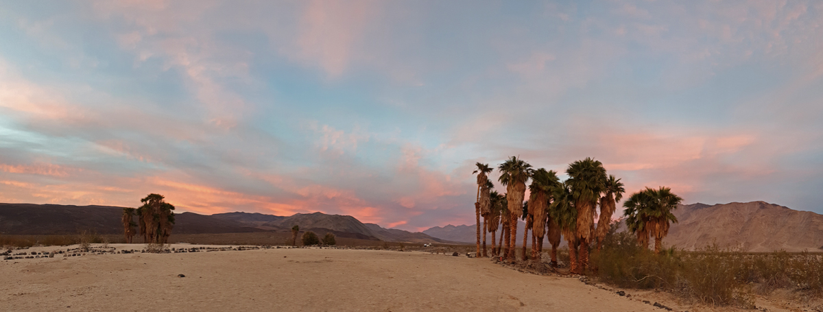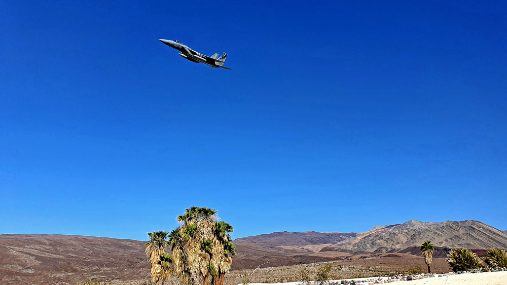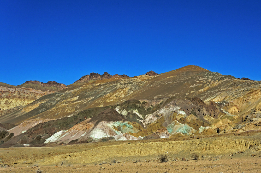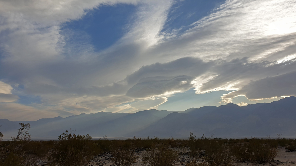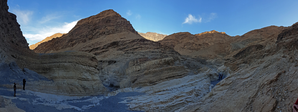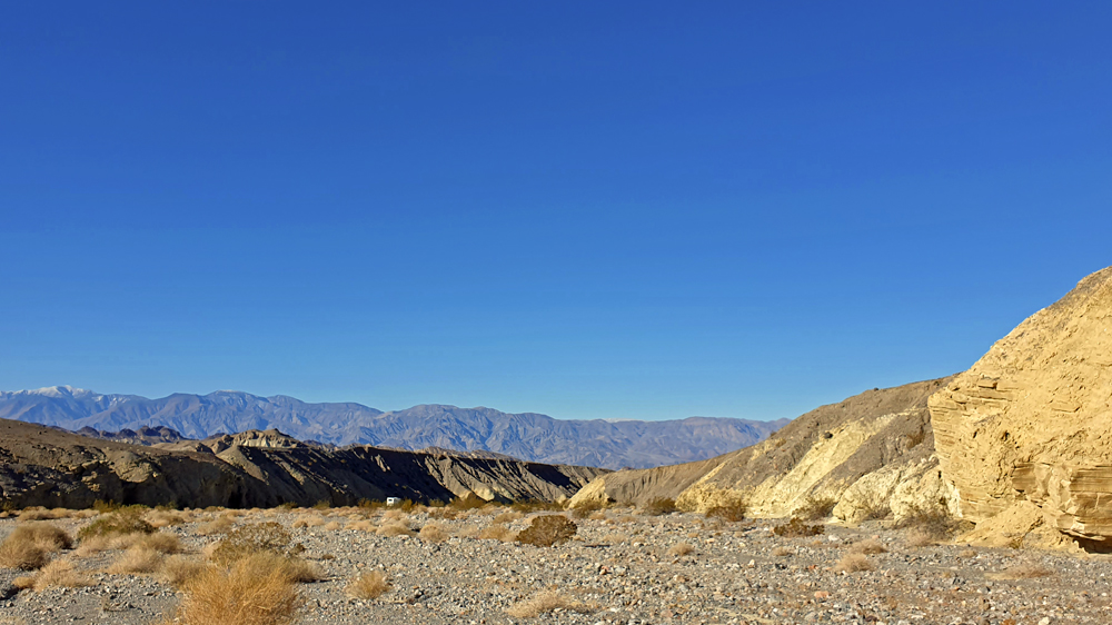 Und so machen wir uns nach drei Tagen im Saline Valley wieder auf den Weg. Es geht zurück zum South Pass, über die Lee Flats mit den vielen Joshua Trees und dann Richtung Osten. Wir machen kurz Halt am Father Crowley Overlook, der den Rainbow Canyon überblickt. Das Tal wird auch «Star Wars Valley» genannt, weil hier die Kampfjets auf ihren Übungsflügen durchbrausen. Wir sehen gerade keine, aber nachdem wir im Saline Valley drei Tage lang Tiefflieger beobachten und uns von ihren Jet-Triebwerken durchschütteln lassen konnten, haben wir keine Lust, im kalten Wind auf rund 900 m Höhe zu warten. Durch einen sehr farbigen Hang geht es hinunter ins Panamint Valley (ca. 450 m ü. M.) und gleich wieder über den Towne Pass (1’500 m ü. M.) nach Stovepipe Wells im Death Valley (3 m ü. M.). Sibylle, Hermann und ich machen einen Ausflug in den hübschen Mosaic Canyon, bevor wir den Nationalpark auf der anderen Seite des Haupttales (hier ca. – 20 m) über den Daylight Pass (1’300 m ü. M.) zum Übernachten verlassen.