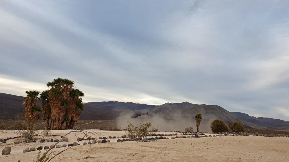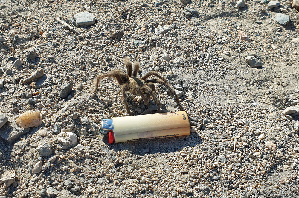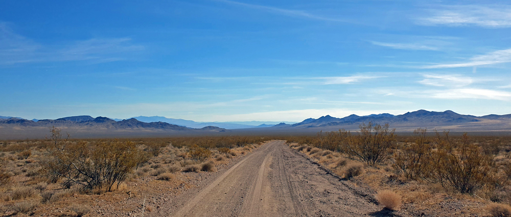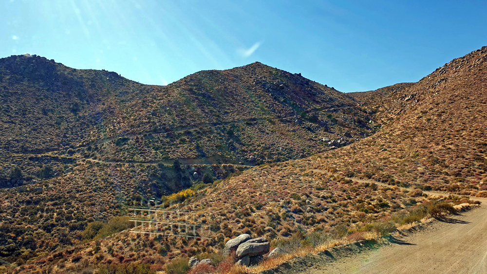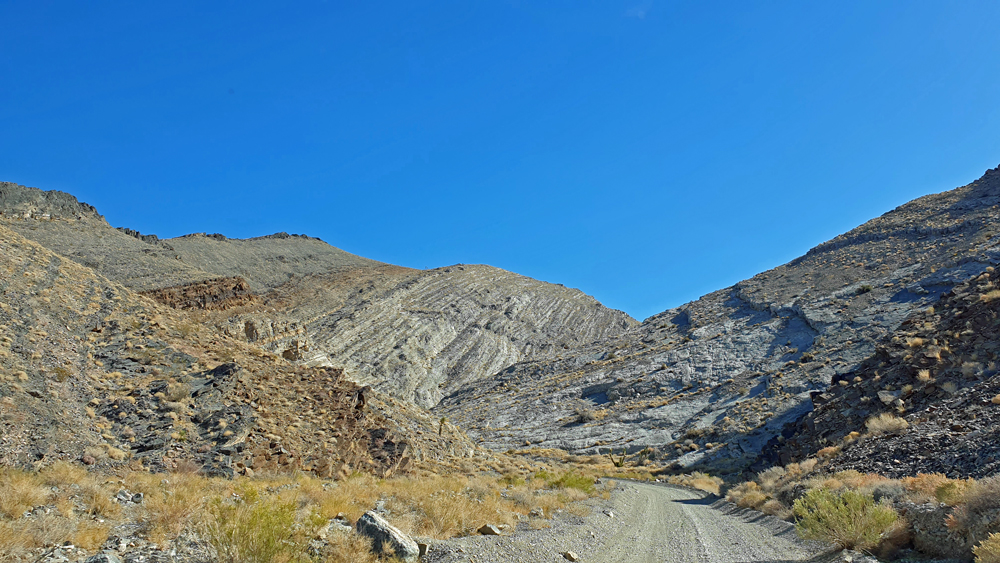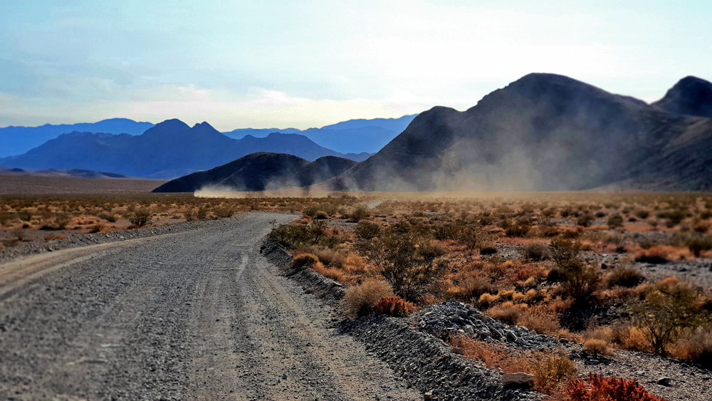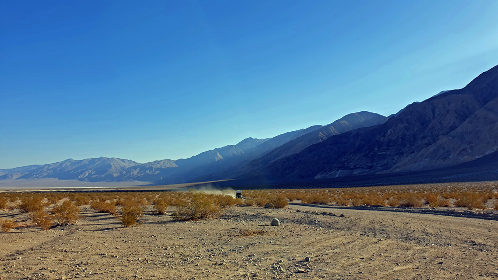 Nachdem wir am Morgen unserem einzigen Nachbarn den Wagen überbrückt haben (er war SEHR froh, dass wir da waren), werden wir von einer grossen Tarantel überrascht, die quer durchs Lager läuft. Danach geht’s zunächst zurück zur Teakettle Junction und von da durch einen kurzen Canyon («Lost Burrow Gap») ins mit Joshua Trees bewachense Hidden Valley. Hier treffen wir auf einige Abschnitte mit ganz feinem, tiefen Staub, den wir gut meistern – nur unsere Gefährte haben plötzlich wieder eine ganz andere Farbgebung… Eine steile, gewundene Bergpiste führt uns dann über den 2’185 m hohen Hunter Mountain Pass bis zum South Pass, von wo wir ein Eckchen vom Saline Valley sehen können und auf der anderen Seite einen guten Blick aufs Nordende des Panamint Valley haben.