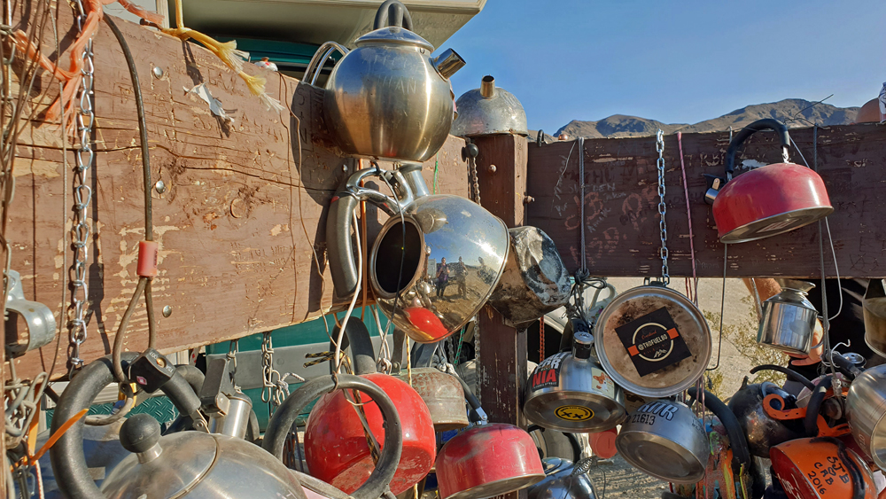 Wir gucken uns auf dem Weg die «wilden» heissen Quellen vor Tecopa Hot Springs an, die uns aber zu schlammig sind. Das Delight’s Hot Springs Resort, wo Ozy und ich 2016/17 in einem Bungalow übernachten haben, ist zwar hübsch, aber zu teuer, weshalb wir dann auf dem Tecopa Hot Springs Campground übernachten, einem grossen Platz, der offenbar hauptsächlich von Langzeit-Campern bewohnt wird. Sie haben aber zwei Badehäuser, eins für die Männlein, eins für die Weiblein, wo wir uns nochmals im heissen Wasser entspannen können, bevor uns Hermi mit seinen Kochkünsten verwöhnt.
