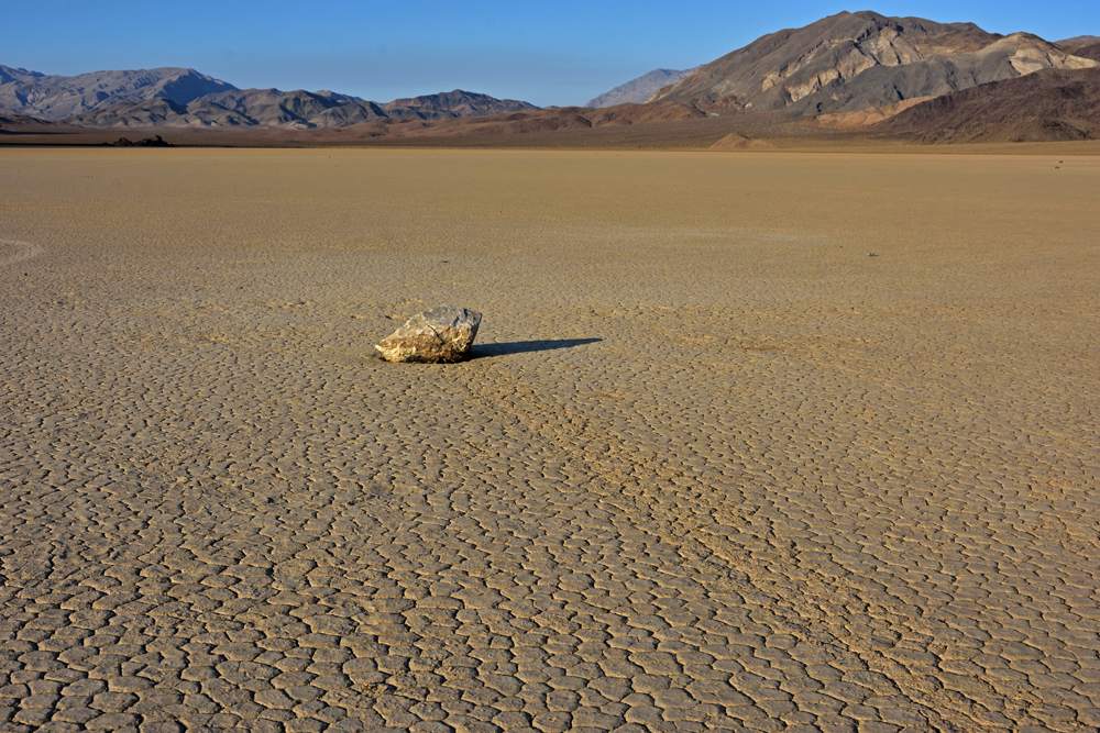 Nach einem Fotohalt an der Teakettle Junction sind wir etwas enttäuscht, als wir den Racetrack erreichen. Einerseits hat es wenig und praktisch nur kleine Steine darauf (anscheinend gibt es Leute, die die Steine mitnehmen, weil sie meinen, dass sie sich in ihrem Garten dann auch bewegen würden…), andererseits sind die Spuren viel weniger tief als 2015 (Erklärung zu den wandernden Steinen bei Wikipedia).