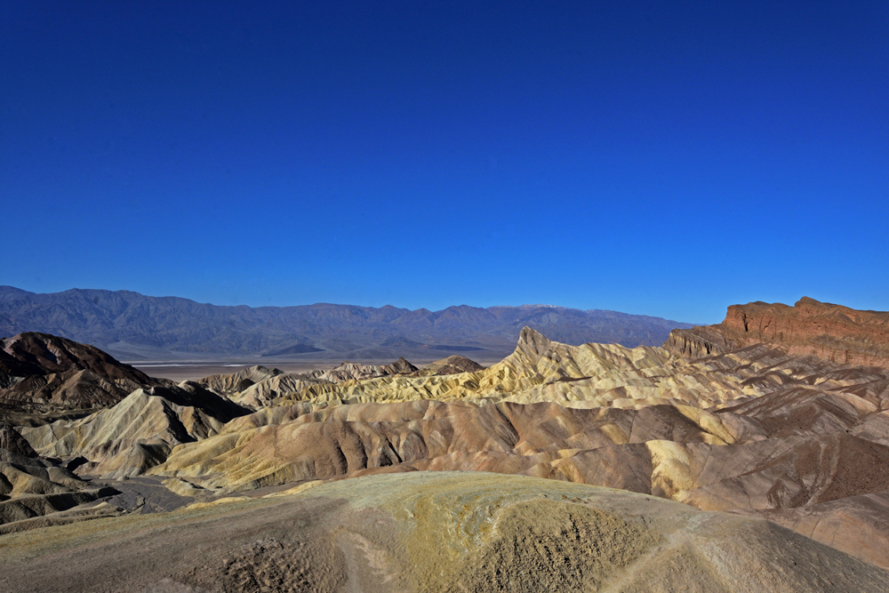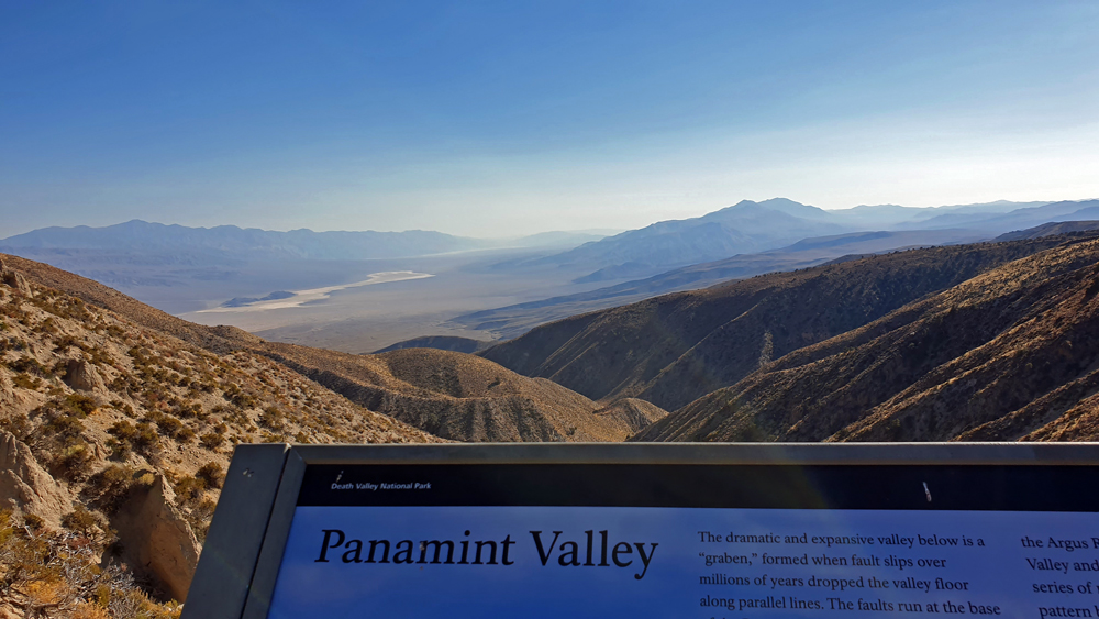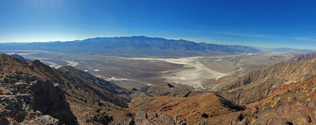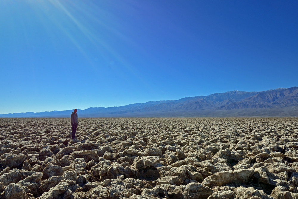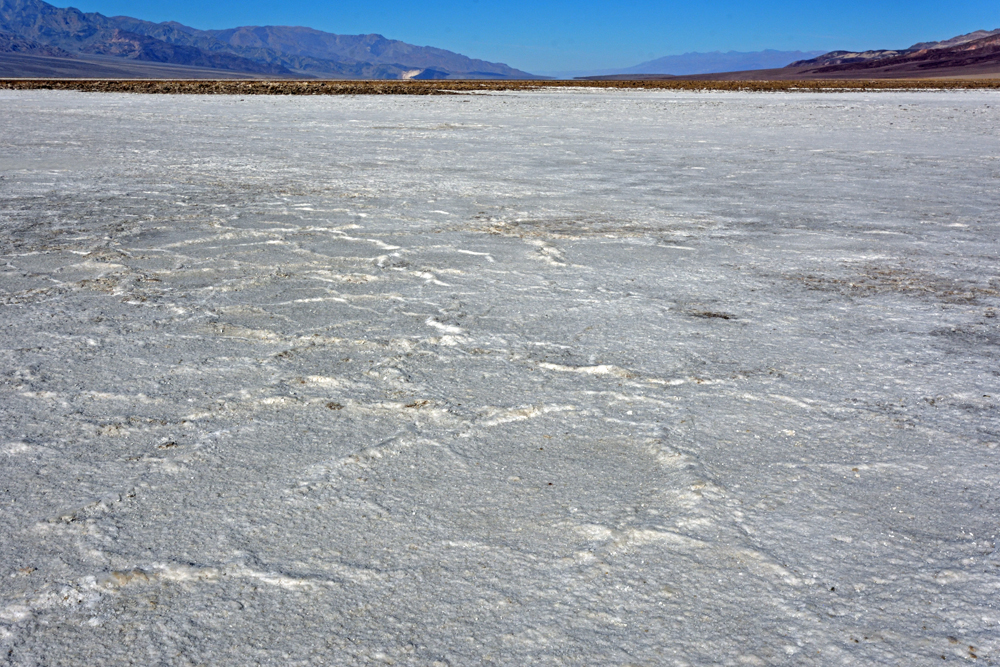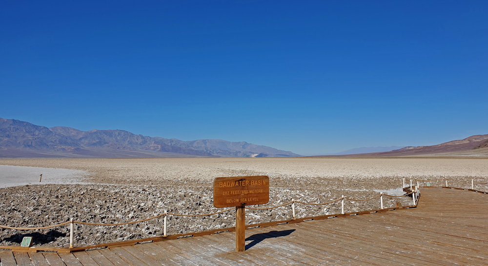 Am nächsten Tag geht es wieder auf die andere Talseite. Zuerst zum Badwater Basin, dem mit 85 m unter dem Meeresspiegel tiefsten Punkt des nordamerikanischen Kontinents, und dann zum wenig nördlich gelegenen Devil’s Golf Course, wo wir jeweils die durch das Salz hervorgebrachten Strukturen bestaunen. Und weil wir nun so tief waren, fahren wir gleich darauf auf zum Dante’s View auf 1’670 m ü. M., von dem aus man direkt aufs Badwater Basin hinunter blicken kann.