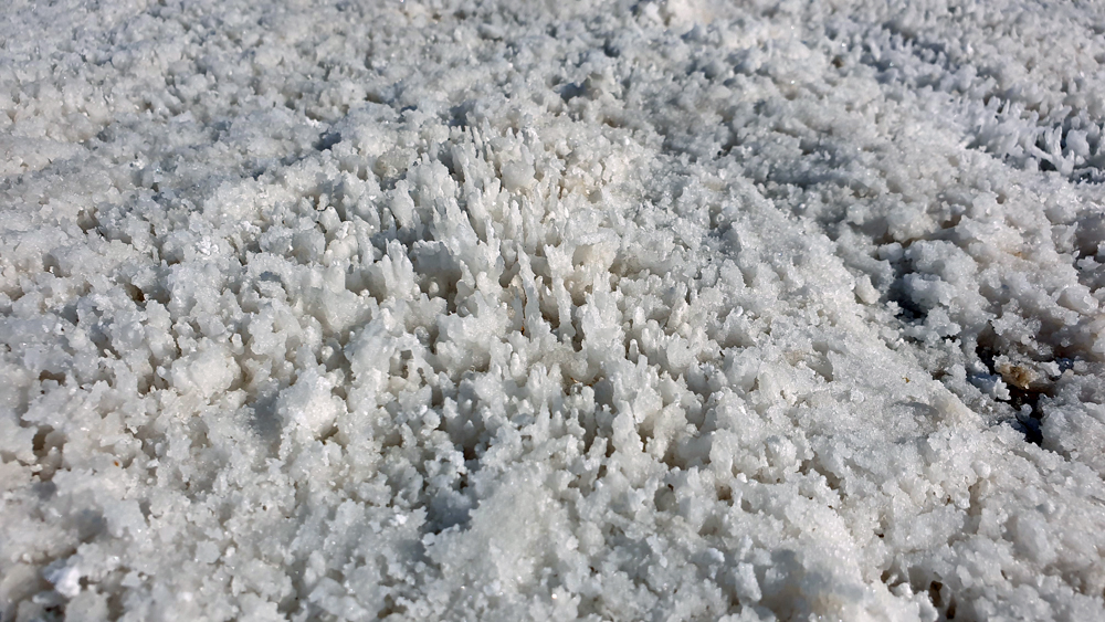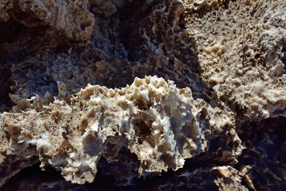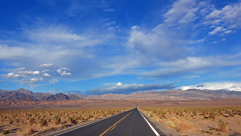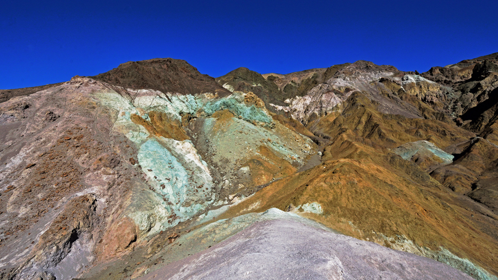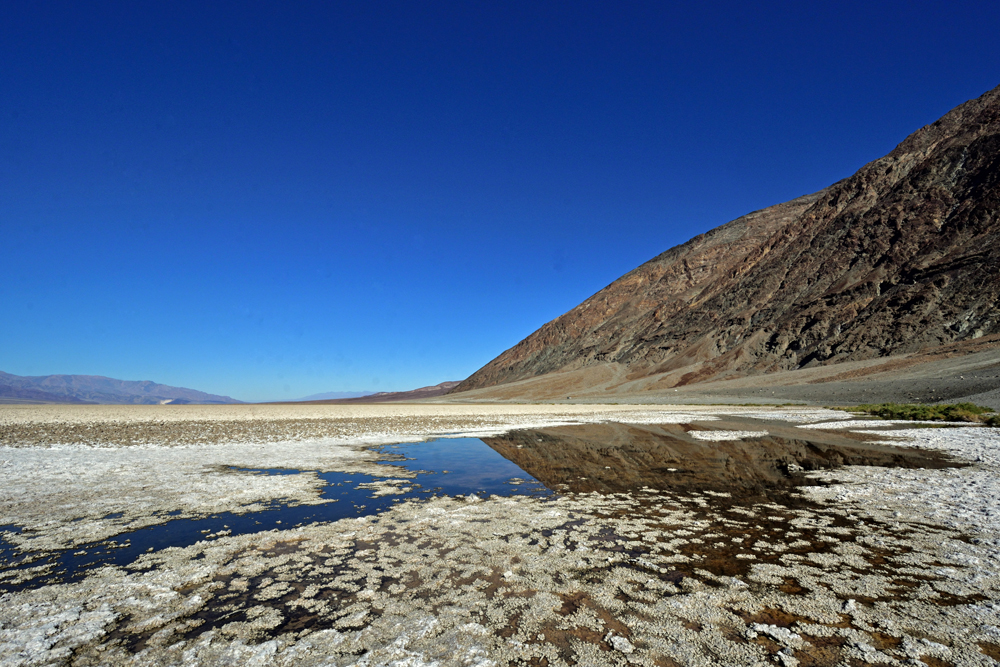 Am nächsten Tag geht es wieder auf die andere Talseite. Zuerst zum Badwater Basin, dem mit 85 m unter dem Meeresspiegel tiefsten Punkt des nordamerikanischen Kontinents, und dann zum wenig nördlich gelegenen Devil’s Golf Course, wo wir jeweils die durch das Salz hervorgebrachten Strukturen bestaunen. Und weil wir nun so tief waren, fahren wir gleich darauf auf zum Dante’s View auf 1’670 m ü. M., von dem aus man direkt aufs Badwater Basin hinunter blicken kann.