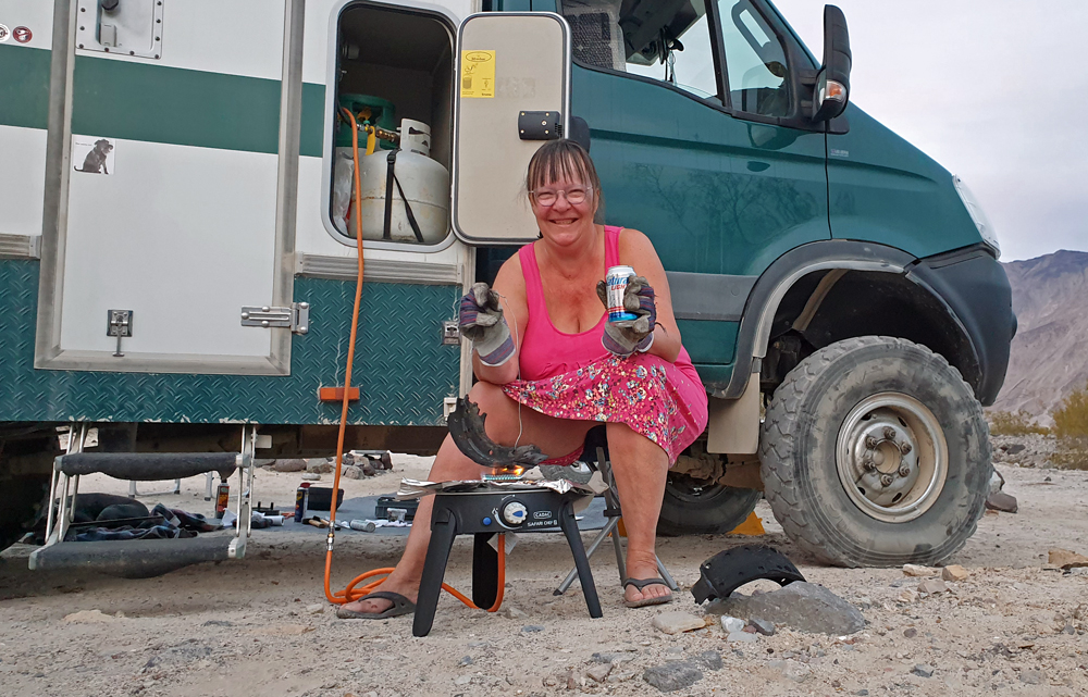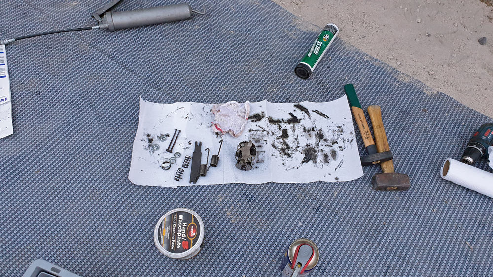 Hermann und Ozy besehen sich den Schaden erst mal. Sie stellen fest, dass sie während der nächsten Tage das D-Hai wieder fahrtüchtig machen und die Bremsen revidieren können. Hermann hat neue Bremsbeläge dabei und mittels Ozys Winkelschleifer können die alten Bremsscheiben  überarbeitet werden. Die beiden stellen auch fest, dass es nicht nur vorne, sondern auch hinten ein Problem gibt: dort hat ein Leck im Achswellen-Dichtring (wegen Überdruck im Diff aufgrund verstopfter Entlüftung) dafür gesorgt, dass sich die Trommelbremsen mit Öl gefüllt haben. Deshalb werden auch diese komplett auseinandergenommen und die mit Öl gesättigten Bremsbeläge über dem Gasbrenner abgebrannt. Nach eineinhalb Tagen ist das Bremssystem wieder einsatzbereit und der Fahrt aus dem Tal über einen der beiden rund 2’000 m hohen Pässe kann ruhig entgegengeblickt werden.